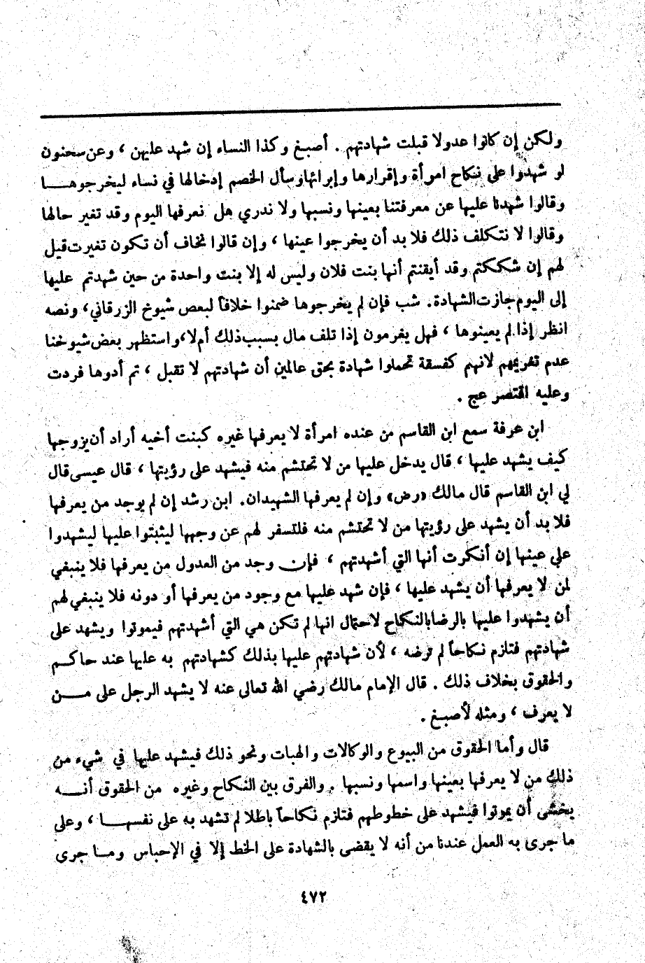 قَالَ الْإِمَامُ مَالِكٌ - رَضِيَ اللَّهُ تَعَالَى عَنْهُ - لَا يَشْهَدُ الرَّجُلُ عَلَى مَنْ لَا يَعْرِفُ، وَمِثْلُهُ لِأَصْبَغَ. قَالَ وَأَمَّا الْحُقُوقُ مِنْ الْبُيُوعِ وَالْوَكَالَاتِ وَالْهِبَاتِ وَنَحْوِ ذَلِكَ فَيَشْهَدُ عَلَيْهَا فِي شَيْءٍ مِنْ ذَلِكَ مَنْ لَا يَعْرِفُهَا بِعَيْنِهَا وَاسْمِهَا وَنَسَبِهَا. وَالْفَرْقُ بَيْنَ النِّكَاحِ وَغَيْرِهِ مِنْ الْحُقُوقِ أَنَّهُ يُخْشَى أَنْ يَمُوتُوا فَيُشْهَدَ عَلَى خُطُوطِهِمْ فَتُلْزَمَ نِكَاحًا بَاطِلًا لَمْ تُشْهِدْ بِهِ عَلَى نَفْسِهَا، وَعَلَى مَا جَرَى بِهِ الْعَمَلُ عِنْدَنَا مِنْ أَنَّهُ لَا يَقْضِي بِالشَّهَادَةِ عَلَى الْخَطِّ إلَّا فِي الْأَحْبَاسِ وَمَا جَرَى
