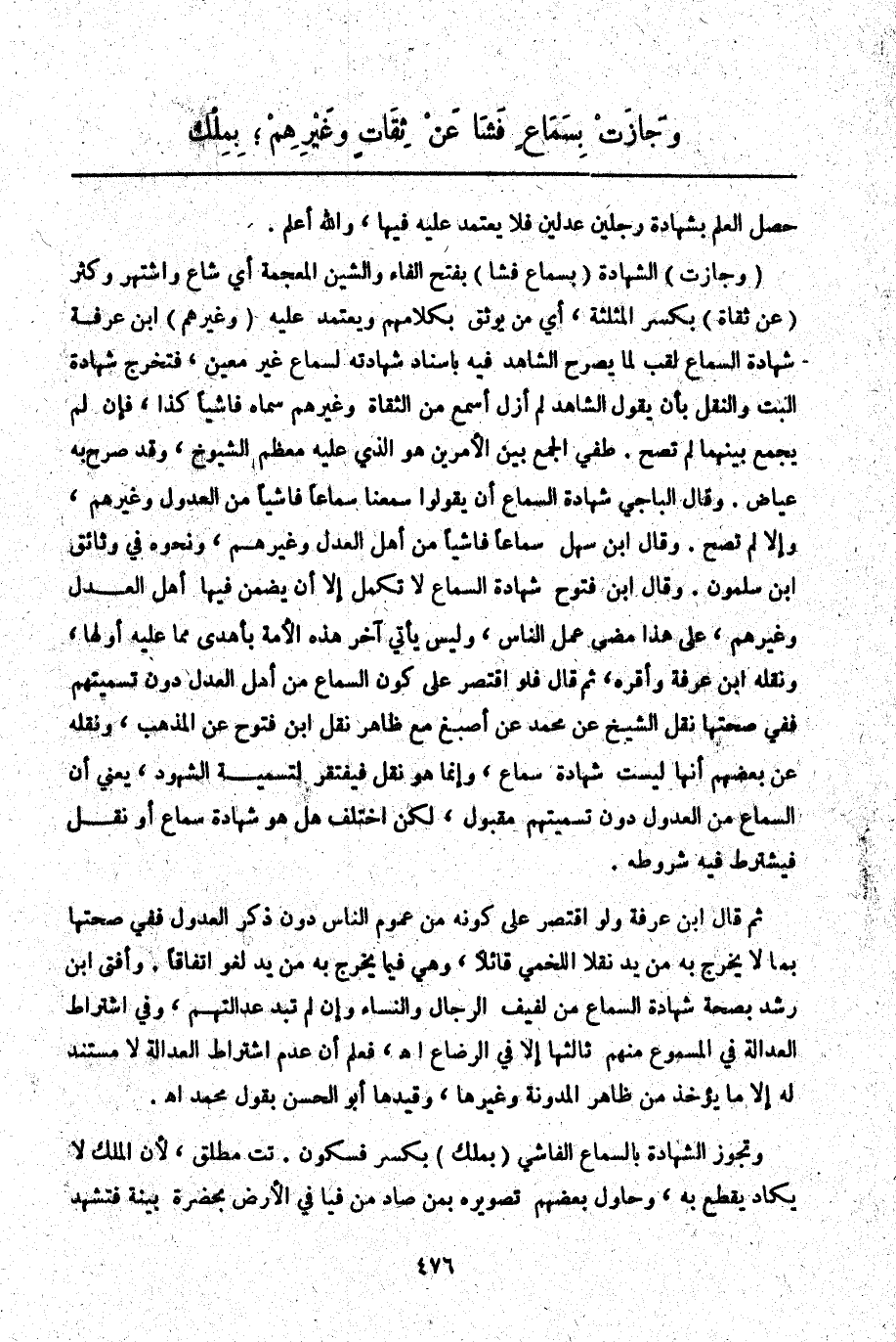 ثُمَّ قَالَ ابْنُ عَرَفَةَ وَلَوْ اقْتَصَرَ عَلَى كَوْنِهِ مِنْ عُمُومِ النَّاسِ دُونَ ذِكْرِ الْعُدُولِ فَفِي صِحَّتِهَا بِمَا لَا يَخْرُجُ بِهِ مِنْ يَدٍ نَقْلَا اللَّخْمِيِّ قَائِلًا، وَهِيَ فِيمَا يَخْرُجُ بِهِ مِنْ يَدٍ لَغْوٌ اتِّفَاقًا. وَأَفْتَى ابْنُ رُشْدٍ بِصِحَّةِ شَهَادَةِ السَّمَاعِ مِنْ لَفِيفِ الرِّجَالِ وَالنِّسَاءِ وَإِنْ لَمْ تَبْدُ عَدَالَتُهُمْ، وَفِي اشْتِرَاطِ الْعَدَالَةِ فِي الْمَسْمُوعِ مِنْهُمْ ثَالِثُهَا إلَّا فِي الرَّضَاعِ. اهـ. فَعُلِمَ أَنَّ عَدَمَ اشْتِرَاطِ الْعَدَالَةِ لَا مُسْتَنَدَ لَهُ إلَّا مَا يُؤْخَذُ مِنْ ظَاهِرِ الْمُدَوَّنَةِ وَغَيْرِهِمَا، وَقَيَّدَهَا أَبُو الْحَسَنِ بِقَوْلِ مُحَمَّدٍ اهـ. وَتَجُوزُ الشَّهَادَةُ بِالسَّمَاعِ الْفَاشِي (بِمِلْكٍ) بِكَسْرٍ فَسُكُونٍ. تت مُطْلَقٌ؛ لِأَنَّ الْمِلْكَ لَا يَكَادُ يُقْطَعُ بِهِ، وَحَاوَلَ بَعْضُهُمْ تَصْوِيرَهُ بِمِنْ صَادَ مِنْ فَيَافِي الْأَرْضِ بِحَضْرَةِ بَيِّنَةٍ فَتَشْهَدُ