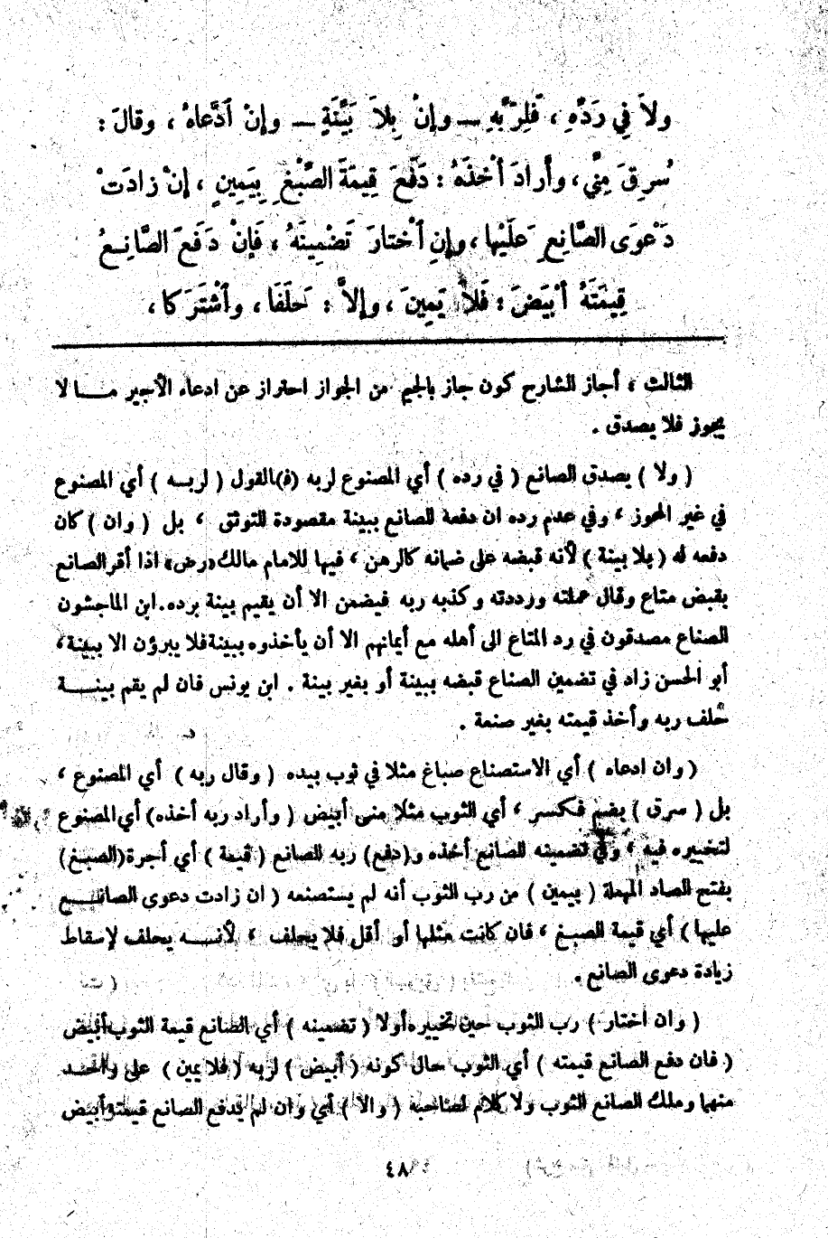 (وَإِنْ ادَّعَاهُ) أَيْ الِاسْتِصْنَاعَ صَبَّاغٌ مَثَلًا فِي ثَوْبٍ بِيَدِهِ (قَالَ رَبُّهُ) أَيْ الْمَصْنُوعِ، بَلْ (سُرِقَ) بِضَمٍّ فَكَسْرٍ، أَيْ الثَّوْبُ مَثَلًا مِنِّي أَبْيَضُ (وَأَرَادَ رَبُّهُ أَخْذَهُ) أَيْ الْمَصْنُوعَ لِتَخْيِيرِهِ فِيهِ، وَفِي تَضْمِينِهِ لِلصَّانِعِ أَخْذُهُ وَ (دَفَعَ) رَبُّهُ لِلصَّانِعِ (قِيمَةَ) أَيْ أُجْرَةَ (الصَّنْعِ) بِفَتْحِ الصَّادِ الْمُهْمَلَةِ (بِيَمِينٍ) مِنْ رَبِّ الثَّوْبِ أَنَّهُ لَمْ يَسْتَصْنِعْهُ (إنْ زَادَتْ دَعْوَى الصَّانِعِ عَلَيْهَا) أَيْ قِيمَةِ الصَّبْغِ، فَإِنْ كَانَتْ مِثْلَهَا أَوْ أَقَلَّ فَلَا يَحْلِفُ؛ لِأَنَّهُ يَحْلِفُ لِإِسْقَاطِ زِيَادَةِ دَعْوَى الصَّانِعِ.