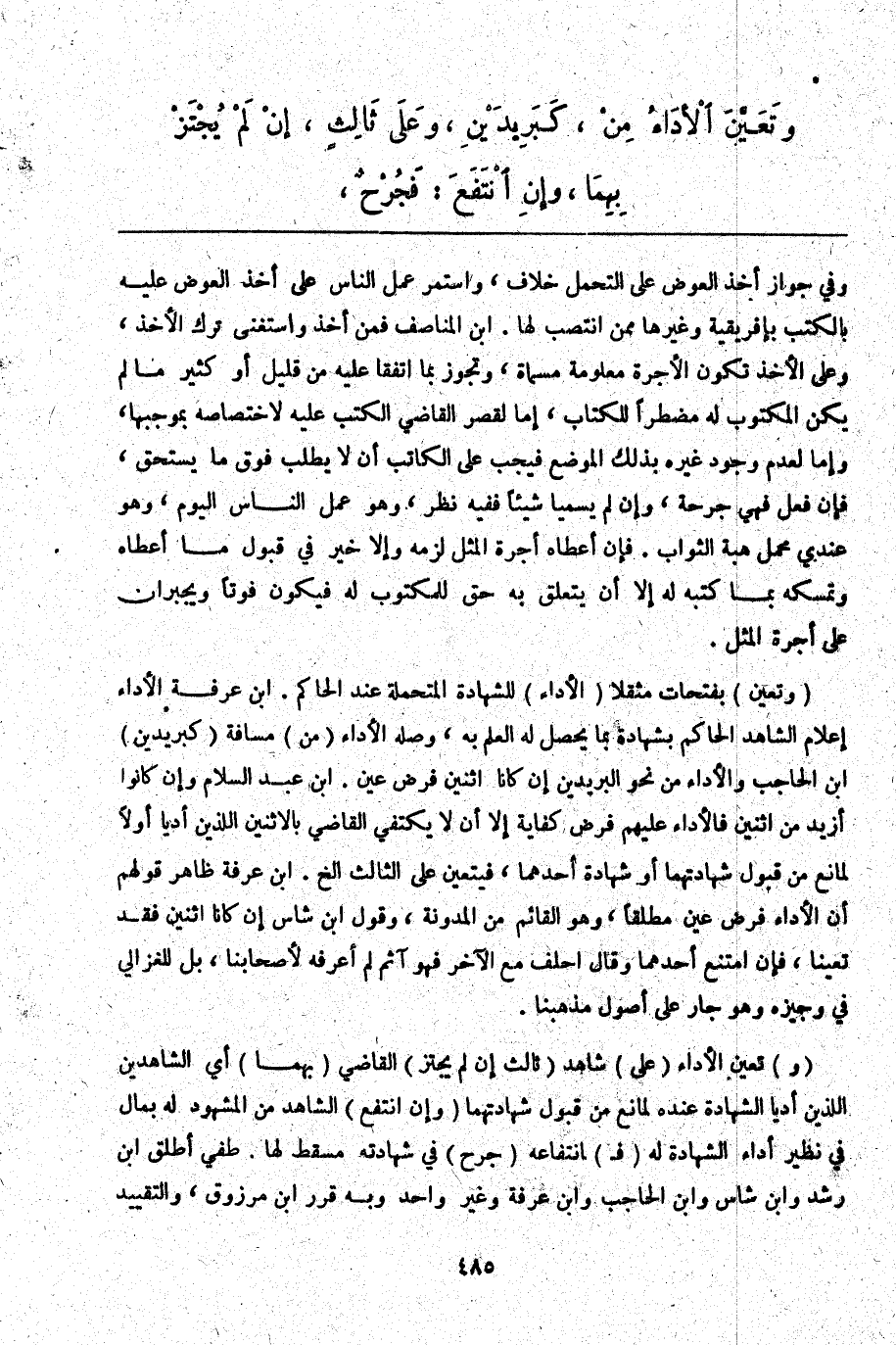 فَإِنْ أَعْطَاهُ أُجْرَةَ الْمِثْلِ لَزِمَهُ وَإِلَّا خُيِّرَ فِي قَبُولِ مَا أَعْطَاهُ وَتَمَسُّكِهِ بِمَا كَتَبَهُ لَهُ إلَّا أَنْ يَتَعَلَّقَ بِهِ حَقٌّ لِلْمَكْتُوبِ لَهُ فَيَكُونَ فَوْتًا وَيُجْبَرَانِ عَلَى أُجْرَةِ الْمِثْلِ. (وَتَعَيَّنَ) بِفَتَحَاتٍ مُثَقَّلًا (الْأَدَاءُ) لِلشَّهَادَةِ الْمُتَحَمَّلَةِ عِنْدَ الْحَاكِمِ. ابْنُ عَرَفَةَ الْأَدَاءُ إعْلَامُ الشَّاهِدِ الْحَاكِمَ بِشَهَادَةٍ بِمَا يَحْصُلُ لَهُ الْعِلْمُ بِهِ، وَصِلَةُ الْأَدَاءِ (مِنْ) مَسَافَةٍ (كَبَرِيدَيْنِ) ابْنُ الْحَاجِبِ وَالْأَدَاءُ مِنْ نَحْوِ الْبَرِيدَيْنِ إنْ كَانَا اثْنَيْنِ فَرْضُ عَيْنٍ. ابْنُ عَبْدِ السَّلَامِ وَإِنْ كَانُوا أَزْيَدَ مِنْ اثْنَيْنِ فَالْأَدَاءُ عَلَيْهِمْ فَرْضُ كِفَايَةٍ إلَّا أَنْ لَا يَكْتَفِيَ الْقَاضِي بِالِاثْنَيْنِ اللَّذَيْنِ أَدَّيَا أَوَّلًا لِمَانِعٍ مِنْ قَبُولِ شَهَادَتِهِمَا أَوْ شَهَادَةِ أَحَدِهِمَا، فَيَتَعَيَّنُ عَلَى الثَّالِثِ إلَخْ. ابْنُ عَرَفَةَ ظَاهِرُ قَوْلِهِمْ أَنَّ الْأَدَاءَ فَرْضُ عَيْنٍ مُطْلَقًا، وَهُوَ الْقَائِمُ مِنْ الْمُدَوَّنَةِ، وَقَوْلُ ابْنِ شَاسٍ إنْ كَانَا اثْنَيْنِ فَقَدْ تَعَيَّنَا، فَإِنْ امْتَنَعَ أَحَدُهُمَا وَقَالَ احْلِفْ مَعَ الْآخَرِ فَهُوَ آثِمٌ لَمْ أَعْرِفْهُ لِأَصْحَابِنَا، بَلْ لِلْغَزَالِيِّ فِي وَجِيزِهِ وَهُوَ جَارٍ عَلَى أُصُولِ مَذْهَبِنَا. (وَ) تَعَيَّنَ الْأَدَاءُ (عَلَى) شَاهِدٍ (ثَالِثٍ إنْ لَمْ يَجْتَزْ) الْقَاضِي (بِهِمَا) أَيْ الشَّاهِدَيْنِ اللَّذَيْنِ أَدَّيَا الشَّهَادَةَ عِنْدَهُ لِمَانِعٍ مِنْ قَبُولِ شَهَادَتِهِمَا.