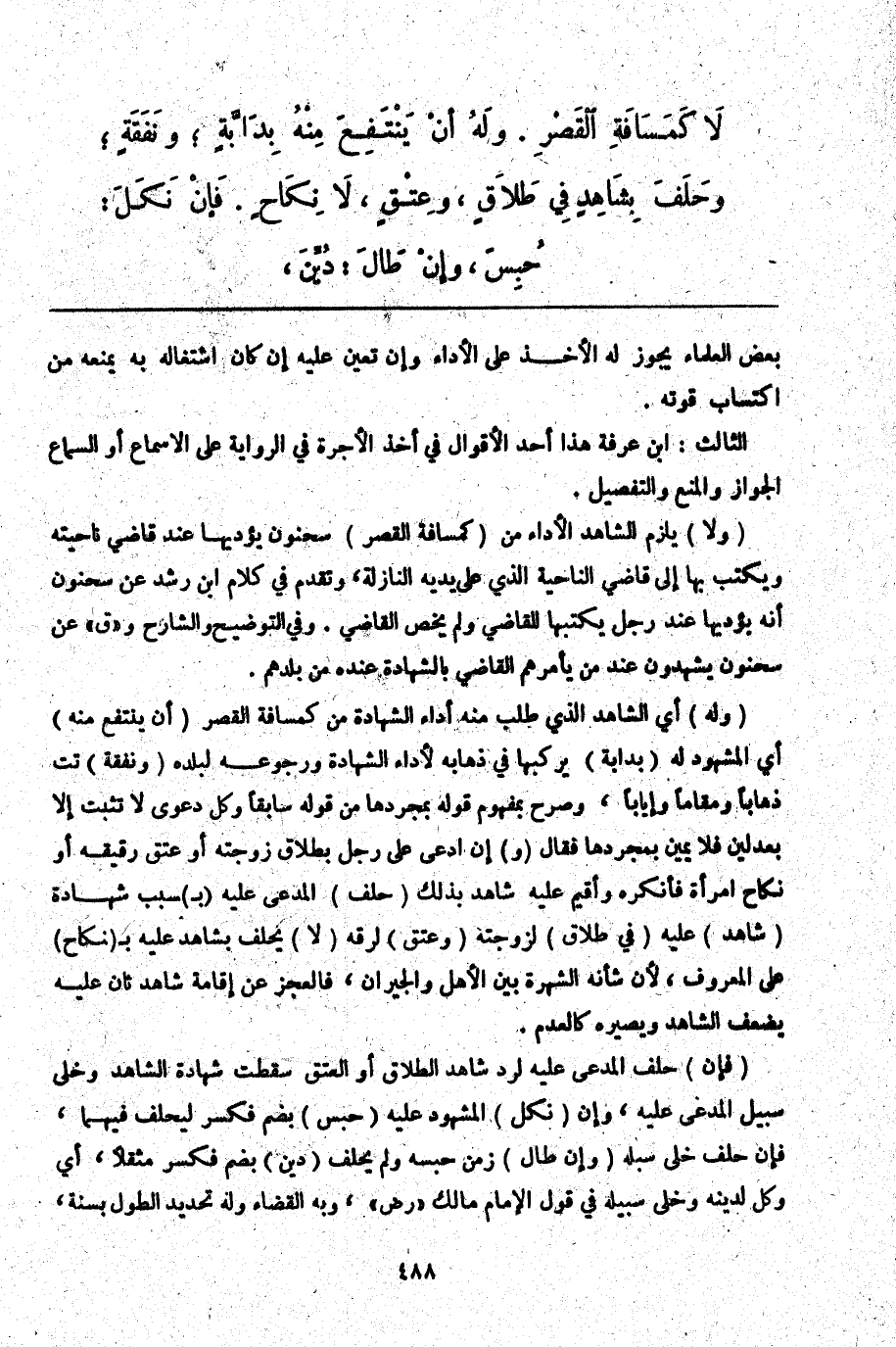 الثَّالِثُ: ابْنُ عَرَفَةَ هَذَا أَحَدُ الْأَقْوَالِ فِي أَخْذِ الْأُجْرَةِ فِي الرِّوَايَةِ عَلَى الْأَسْمَاعِ أَوْ السَّمَاعُ الْجَوَازُ وَالْمَنْعُ وَالتَّفْصِيلُ. (وَلَا) يَلْزَمُ الشَّاهِدَ الْأَدَاءُ مِنْ (كَمَسَافَةِ الْقَصْرِ) سَحْنُونٌ يُؤَدِّيهَا عِنْدَ قَاضِي نَاحِيَتِهِ وَيَكْتُبُ بِهَا إلَى قَاضِي النَّاحِيَةِ الَّذِي عَلَى يَدَيْهِ النَّازِلَةُ، وَتَقَدَّمَ فِي كَلَامِ ابْنِ رُشْدٍ عَنْ سَحْنُونٍ أَنَّهُ يُؤَدِّيهَا عِنْدَ رَجُلٍ يَكْتُبُهَا الْقَاضِي وَلَمْ يَخُصَّ الْقَاضِيَ. وَفِي التَّوْضِيحِ وَالشَّارِحِ وَ " ق " عَنْ سَحْنُونٍ يَشْهَدُونَ عِنْدَ مَنْ يَأْمُرُهُمْ الْقَاضِي بِالشَّهَادَةِ عِنْدَهُ مِنْ بَلَدِهِمْ. (وَلَهُ) أَيْ الشَّاهِدِ الَّذِي طَلَبَ مِنْهُ أَدَاءَ الشَّهَادَةِ مِنْ كَمَسَافَةِ الْقَصْرِ (أَنْ يَنْتَفِعَ مِنْهُ) أَيْ الْمَشْهُودُ لَهُ (بِدَابَّةٍ) يَرْكَبُهَا فِي ذَهَابِهِ لِأَدَاءِ الشَّهَادَةِ وَرُجُوعِهِ لِبَلَدِهِ (وَنَفَقَةٍ) تت ذَهَابًا وَمَقَامًا وَإِيَابًا.