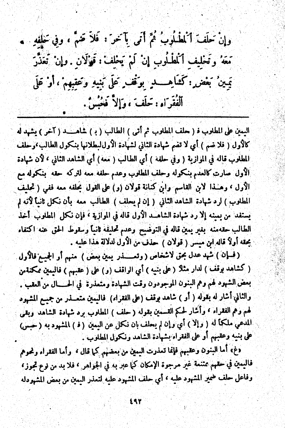 (فَإِنْ) شَهِدَ عَدْلٌ بِحَقٍّ لِأَشْخَاصٍ (وَتَعَذَّرَ يَمِينُ بَعْضٍ) مِنْهُمْ أَوْ الْجَمِيعِ فَالْأَوَّلُ (كَشَاهِدٍ بِوَقْفٍ) لِدَارٍ مَثَلًا (عَلَى بَنِيهِ) أَيْ الْوَاقِفِ (وَ) عَلَى (عَقِبِهِمْ) فَالْيَمِينُ مُمْكِنَةٌ مِنْ بَعْضِ الشُّهُودِ لَهُمْ وَهُمْ الْبَنُونَ الْمَوْجُودُونَ وَقْتَ الشَّهَادَةِ وَمُتَعَذِّرَةٌ فِي الْحَالِ مِنْ الْعَقِبِ. وَالثَّانِي أَشَارَ لَهُ بِقَوْلِهِ (أَوْ) شَاهِدٍ بِوَقْفٍ (عَلَى الْفُقَرَاءِ) فَالْيَمِينُ مُتَعَذِّرٌ مِنْ جَمِيعِ الْمَشْهُودِ لَهُمْ وَهُمْ الْفُقَرَاءُ، وَأَشَارَ لِحُكْمِ الْقِسْمَيْنِ بِقَوْلِهِ (حَلَفَ) الْمَطْلُوبُ بِرَدِّ شَهَادَةِ الشَّاهِدِ وَبَقِيَ الْمُدَّعَى مِلْكًا لَهُ (وَإِلَّا) أَيْ وَإِنْ لَمْ يَحْلِفْ بِأَنْ نَكَلَ عَنْ الْيَمِينِ (فَ) الْمَشْهُودُ بِهِ (حَبْسٌ) عَلَى بَنِيهِ وَعَقِبِهِمْ أَوْ عَلَى الْفُقَرَاءِ بِشَهَادَةِ الشَّاهِدِ وَنُكُولِ الْمَطْلُوبِ. " غ " أَمَّا الْبَنُونَ وَعَقِبُهُمْ فَإِنَّمَا تَعَذَّرَتْ الْيَمِينُ مِنْ بَعْضِهِمْ كَمَا قَالَ، وَأَمَّا الْفُقَرَاءُ وَنَحْوُهُمْ فَالْيَمِينُ فِي حَقِّهِمْ مُمْتَنِعَةٌ غَيْرُ مَرْجُوَّةِ الْإِمْكَانِ كَمَا عَبَّرَ بِهِ فِي الْجَوَاهِرِ، فَلَا بُدَّ مِنْ نَوْعِ تَجَوُّزٍ، وَفَاعِلُ حَلَفَ ضَمِيرُ الْمَشْهُودِ عَلَيْهِ، أَيْ حَلَفَ الْمَشْهُودُ عَلَيْهِ لِتَعَذُّرِ الْيَمِينِ مِنْ بَعْضِ الْمَشْهُودِ لَهُ