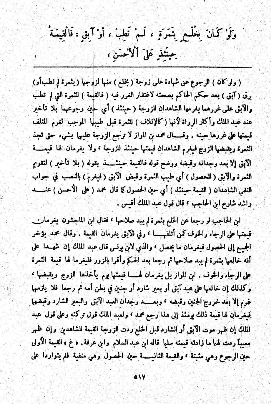 ـــــــــــــــــــــــــــــQوَلَوْ كَانَ) الرُّجُوعُ عَنْ شَهَادَةٍ عَلَى زَوْجَةٍ (بِخُلْعٍ) مِنْهَا لِزَوْجِهَا (بِثَمَرَةٍ لَمْ تَطِبْ أَوْ) بِرِقِّ (آبِقٍ) بَعْدَ حُكْمِ الْحَاكِمِ بِصِحَّتِهِ لِاغْتِفَارِ الْغَرَرِ فِيهِ (فَالْقِيمَةُ) لِلثَّمَرَةِ الَّتِي لَمْ تَطِبْ وَالْآبِقُ عَلَى غَرَرِهِمَا يَغْرَمُهَا الشَّاهِدَانِ لِلزَّوْجَةِ (حِينَئِذٍ) أَيْ حِينَ رُجُوعِهِمَا بِلَا تَأْخِيرٍ عِنْدَ عَبْدِ الْمَلِكِ وَأَكْثَرِ الرُّوَاةِ؛ لِأَنَّهَا (كَالْإِتْلَافِ) لِلثَّمَرَةِ قَبْلَ طِيبِهَا الْمُوجِبِ لِغُرْمِ الْمُتْلِفِ قِيمَتَهَا عَلَى غَرَرِهَا حِينَهُ. وَقَالَ مُحَمَّدُ بْنُ الْمَوَّازِ لَا تَرْجِعُ الزَّوْجَةُ عَلَيْهِمَا بِشَيْءٍ حَتَّى تُجَذَّ الثَّمَرَةُ وَيَقْبِضَهَا الزَّوْجُ فَيَغْرَمَ الشَّاهِدَانِ قِيمَتَهَا حِينَئِذٍ لِلزَّوْجَةِ، وَلَا يَغْرَمَانِ لَهَا قِيمَةَ الْآبِقِ إلَّا بَعْدَ وِجْدَانِهِ وَقَبْضِهِ وَوَضَحَ قَوْلُهُ فَالْقِيمَةُ حِينَئِذٍ بِقَوْلِهِ (بِلَا تَأْخِيرٍ) لِتَقْوِيمِ الثَّمَرَةِ وَالْآبِقِ (لِلْحُصُولِ) أَيْ طِيبِ الثَّمَرَةِ وَقَبْضِ الْآبِقِ (فَيَغْرَمَ) بِالنَّصْبِ فِي جَوَابِ النَّفْيِ الشَّاهِدَانِ (الْقِيمَةَ حِينَئِذٍ) أَيْ حِينَ الْحُصُولِ كَمَا قَالَ مُحَمَّدٌ (عَلَى الْأَحْسَنِ) عِنْدَ رَاشِدٍ شَارِحِ ابْنِ الْحَاجِبِ، قَالَ قَوْلُ عَبْدِ الْمَلِكِ أَقْيَسُ. ابْنُ الْحَاجِبِ لَوْ رَجَعَا عَنْ الْخُلْعِ بِثَمَرَةٍ لَمْ يَبْدُ صَلَاحُهَا، فَقَالَ ابْنُ الْمَاجِشُونِ يَغْرَمَانِ قِيمَتَهَا عَلَى الرَّجَاءِ وَالْخَوْفِ كَمَنْ أَتْلَفَهَا، وَفِي الْآبِقِ يَغْرَمَانِ الْقِيمَةَ.
