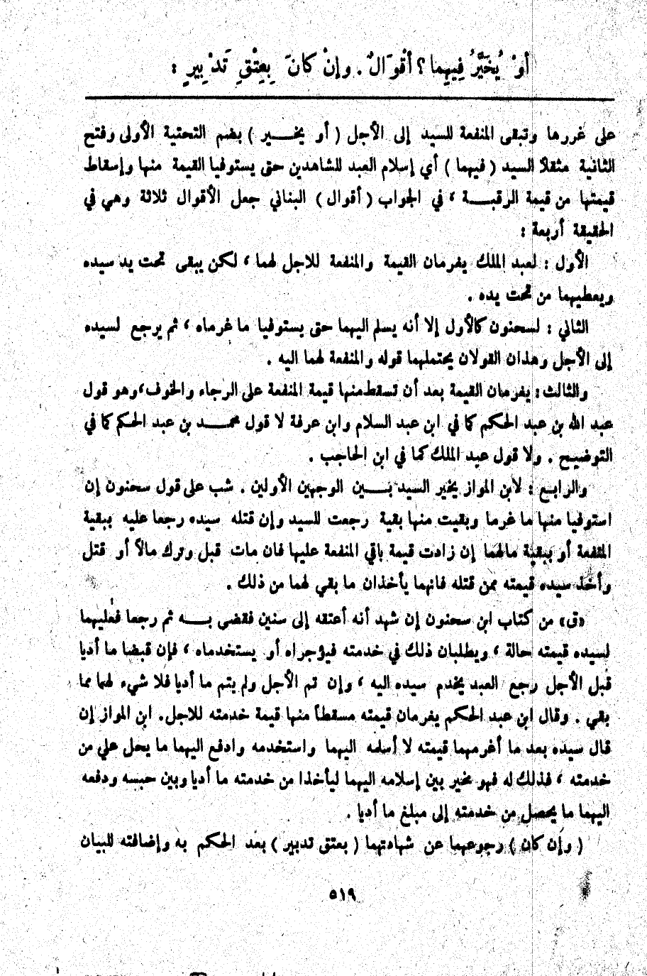 ـــــــــــــــــــــــــــــQعَلَى غَرَرِهَا وَتَبْقَى الْمَنْفَعَةُ لِلسَّيِّدِ إلَى الْأَجَلِ (أَوْ يُخَيَّرُ) بِضَمِّ التَّحْتِيَّةِ الْأُولَى وَفَتْحِ الثَّانِيَةِ مُثَقَّلًا لِلسَّيِّدِ (فِيهِمَا) أَيْ إسْلَامِ الْعَبْدِ لِلشَّاهِدَيْنِ حَتَّى يَسْتَوْفِيَا الْقِيمَةَ مِنْهَا وَإِسْقَاطِ قِيمَتِهَا مِنْ قِيمَةِ الرَّقَبَةِ، فِي الْجَوَابِ (أَقْوَالٌ) الْبُنَانِيُّ جَعَلَ الْأَقْوَالَ ثَلَاثَةً وَهِيَ فِي الْحَقِيقَةِ أَرْبَعَةٌ: الْأَوَّلُ: لِعَبْدِ الْمَلِكِ يَغْرَمَانِ الْقِيمَةَ وَالْمَنْفَعَةَ لِلْأَجَلِ لَهُمَا، لَكِنْ يَبْقَى تَحْتَ يَدِ سَيِّدِهِ وَيُعْطِيهِمَا مِنْ تَحْتِ يَدِهِ. الثَّانِي: لِسَحْنُونٍ كَالْأَوَّلِ إلَّا أَنَّهُ يُسَلَّمُ إلَيْهِمَا حَتَّى يَسْتَوْفِيَا مَا غَرِمَاهُ، ثُمَّ يَرْجِعُ لِسَيِّدِهِ إلَى الْأَجَلِ وَهَذَانِ الْقَوْلَانِ يَحْتَمِلُهُمَا قَوْلُهُ وَالْمَنْفَعَةُ لَهُمَا إلَيْهِ.