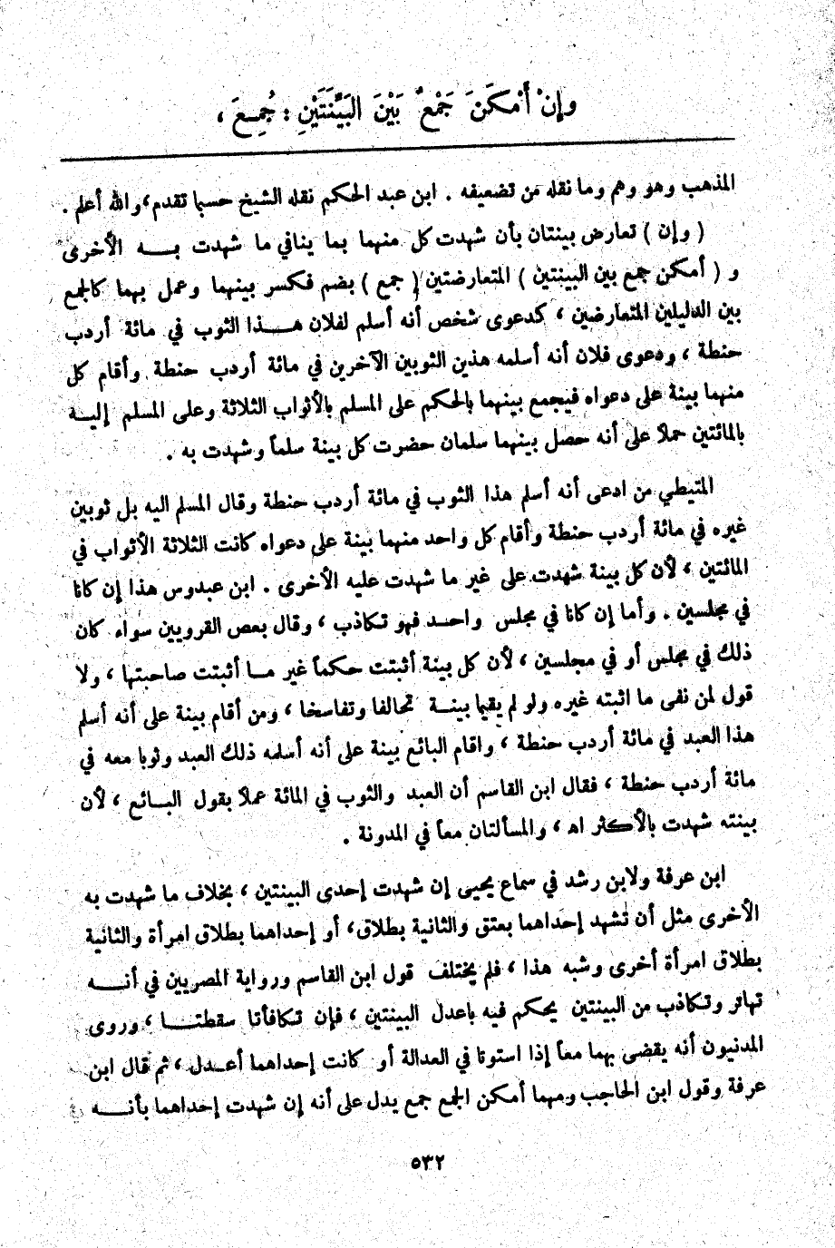 ثُمَّ قَالَ ابْنُ عَرَفَةَ وَقَوْلُ ابْنِ الْحَاجِبِ وَمَهْمَا أَمْكَنَ الْجَمْعُ جَمْعٌ يَدُلُّ عَلَى أَنَّهُ إنْ شَهِدَتْ إحْدَاهُمَا بِأَنَّهُ