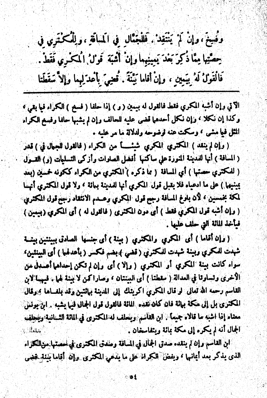 (وَإِنْ لَمْ يَنْقُدْ) الْمُكْتَرِيَ الْمُكْرِي شَيْئًا مِنْ الْكِرَاءِ (فَالْقَوْلُ لِلْجَمَّالِ فِي) قَدْرِ (الْمَسَافَةِ) أَنَّهَا لِلْمَدِينَةِ الْمُنَوَّرَةِ عَلَى سَاكِنِهَا أَفْضَلُ الصَّلَوَاتِ وَأَزْكَى التَّسْلِيمَاتِ (وَ) الْقَوْلُ (لِمُكْتِرِي حِصَّتِهَا) أَيْ الْمَسَافَةِ (مِمَّا ذَكَرَهُ) الْمُكْتَرِي مِنْ الْكِرَاءِ كَكَوْنِهِ خَمْسِينَ (بَعْدَ يَمِينَيْهِمَا) عَلَى مَا ادَّعَيَاهُ فَلَا يُقْبَلُ قَوْلُ الْمُكْرِي أَنَّهَا لِلْمَدِينَةِ بِمِائَةٍ، وَلَا قَوْلُ الْمُكْتَرِي أَنَّهَا لِمَكَّةَ بِخَمْسِينَ؛ لِأَنَّ بُلُوغَ الْمَسَافَةِ رَجَّحَ قَوْلَ الْمُكْرِي وَعَدَمَ الِانْتِقَادِ رَجَّحَ قَوْلَ الْمُكْتَرِي (وَإِنْ أَشْبَهَ قَوْلُ الْمُكْرِي فَقَطْ) أَيْ دُونَ الْمُكْتَرِي (فَالْقَوْلُ لَهُ) أَيْ الْمُكْرِي (بِيَمِينٍ) فَيَأْخُذُ الْمِائَةَ الَّتِي حَلَفَ عَلَيْهَا.
