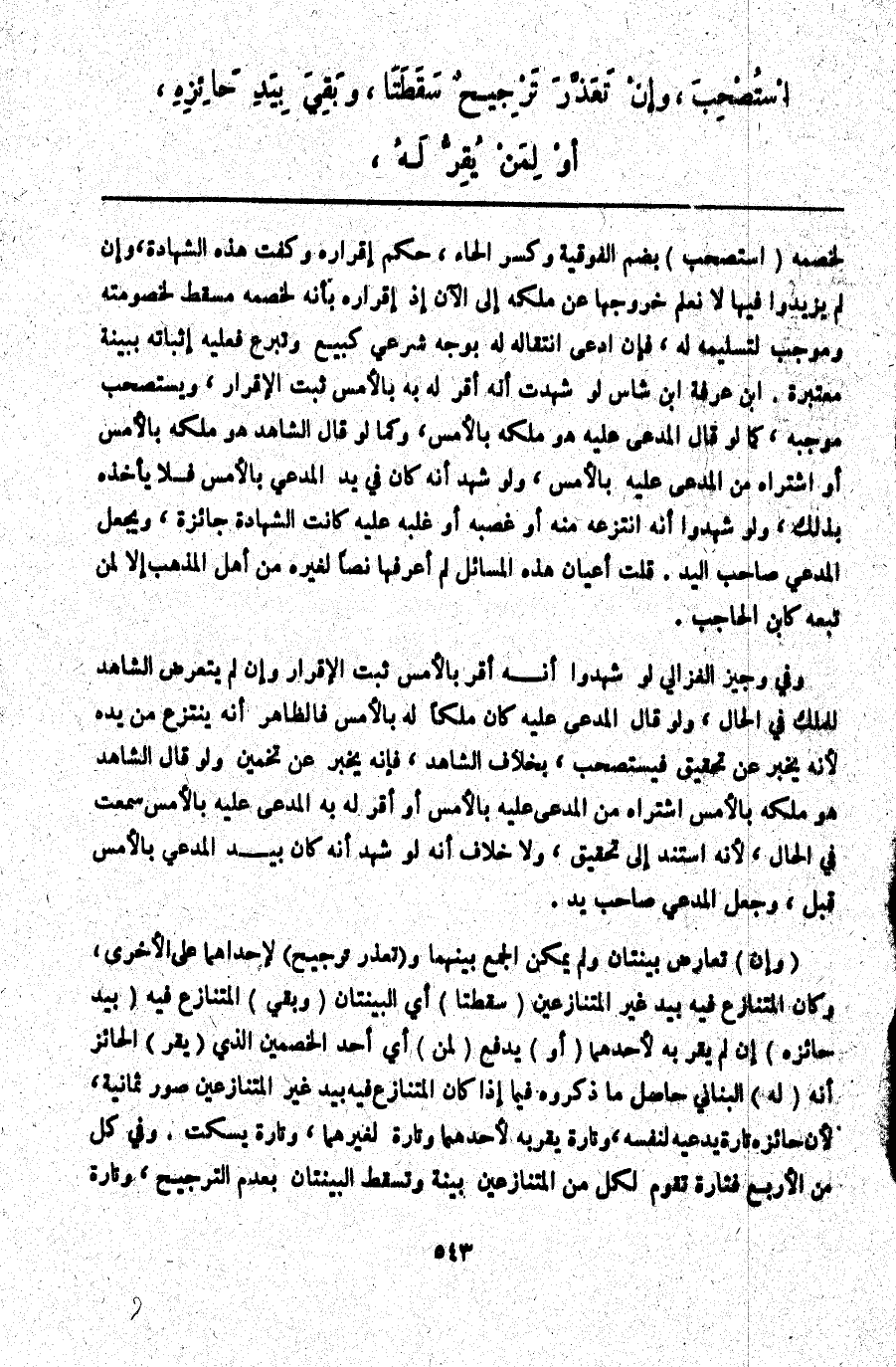 ـــــــــــــــــــــــــــــQلِخَصْمِهِ (اُسْتُصْحِبَ) بِضَمِّ الْفَوْقِيَّةِ وَكَسْرِ الْحَاءِ، حُكْمُ إقْرَارِهِ وَكَفَتْ هَذِهِ الشَّهَادَةُ، وَإِنْ لَمْ يَزِيدُوا فِيهَا لَا نَعْلَمُ خُرُوجَهَا عَنْ مِلْكِهِ إلَى الْآنَ إذْ إقْرَارُهُ بِأَنَّهُ لِخَصْمِهِ مُسْقِطٌ لِخُصُومَتِهِ وَمُوجِبٌ لِتَسْلِيمِهِ لَهُ، فَإِنْ ادَّعَى انْتِقَالَهُ لَهُ بِوَجْهٍ شَرْعِيٍّ كَبَيْعٍ وَتَبَرُّعٍ فَعَلَيْهِ إثْبَاتُهُ بِبَيِّنَةٍ مُعْتَبَرَةٍ. ابْنُ عَرَفَةَ ابْنُ شَاسٍ لَوْ شَهِدَتْ أَنَّهُ أَقَرَّ لَهُ بِهِ بِالْأَمْسِ ثَبَتَ الْإِقْرَارُ وَيُسْتَصْحَبُ مُوجَبُهُ، كَمَا لَوْ قَالَ الْمُدَّعَى عَلَيْهِ هُوَ مَلَكَهُ بِالْأَمْسِ، وَكَمَا لَوْ قَالَ الشَّاهِدُ هُوَ مَلَكَهُ بِالْأَمْسِ أَوْ اشْتَرَاهُ مِنْ الْمُدَّعَى عَلَيْهِ بِالْأَمْسِ، وَلَوْ شَهِدَ أَنَّهُ كَانَ فِي يَدِ الْمُدَّعِي بِالْأَمْسِ فَلَا يَأْخُذُهُ بِذَلِكَ، وَلَوْ شَهِدُوا أَنَّهُ انْتَزَعَهُ مِنْهُ أَوْ غَصَبَهُ أَوْ غَلَبَهُ عَلَيْهِ كَانَتْ الشَّهَادَةُ جَائِزَةً، وَيُجْعَلُ الْمُدَّعِي صَاحِبَ الْيَدِ. قُلْت أَعْيَانُ هَذِهِ الْمَسَائِلِ لَمْ أَعْرِفْهَا نَصًّا لِغَيْرِهِ مِنْ أَهْلِ الْمَذْهَبِ إلَّا لِمَنْ تَبِعَهُ كَابْنِ الْحَاجِبِ. وَفِي وَجِيزِ الْغَزَالِيِّ لَوْ شَهِدُوا أَنَّهُ أَقَرَّ بِالْأَمْسِ ثَبَتَ الْإِقْرَارُ وَإِنْ لَمْ يَتَعَرَّضْ الشَّاهِدُ لِلْمِلْكِ فِي الْحَالِ، وَلَوْ قَالَ الْمُدَّعَى عَلَيْهِ كَانَ مِلْكًا لَهُ بِالْأَمْسِ فَالظَّاهِرُ أَنَّهُ يُنْتَزَعُ مِنْ يَدِهِ؛ لِأَنَّهُ يُخْبِرُ عَنْ تَحْقِيقٍ فَيَسْتَصْحِبُ، بِخِلَافِ الشَّاهِدِ، فَإِنَّهُ يُخْبِرُ عَنْ تَخْمِينٍ وَلَوْ قَالَ الشَّاهِدُ هُوَ مَلَكَهُ بِالْأَمْسِ اشْتَرَاهُ مِنْ الْمُدَّعَى عَلَيْهِ بِالْأَمْسِ أَوْ أَقَرَّ لَهُ بِهِ الْمُدَّعَى عَلَيْهِ بِالْأَمْسِ سُمِعَتْ فِي الْحَالِ؛ لِأَنَّهُ اسْتَنَدَ إلَى تَحْقِيقٍ، وَلَا خِلَافَ أَنَّهُ لَوْ شَهِدَ أَنَّهُ كَانَ بِيَدِ الْمُدَّعِي بِالْأَمْسِ قُبِلَ، وَجُعِلَ الْمُدَّعِي صَاحِبَ يَدٍ.
