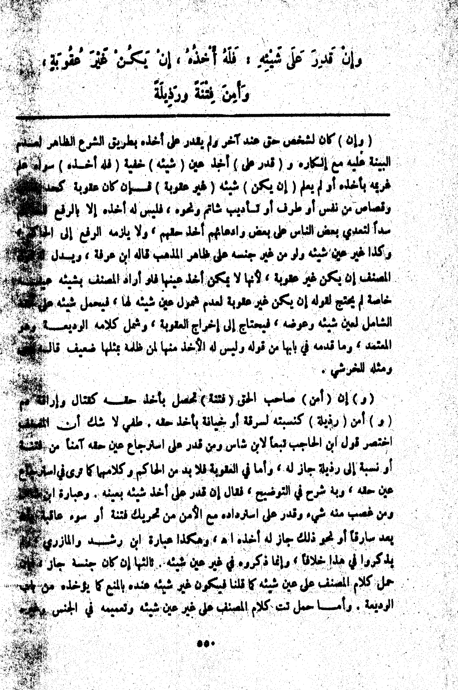 ـــــــــــــــــــــــــــــQوَإِنْ) كَانَ لِشَخْصٍ حَقٌّ عِنْدَ آخَرَ وَلَمْ يَقْدِرْ عَلَى أَخْذِهِ بِطَرِيقِ الشَّرْعِ الظَّاهِرِ لِعَدَمِ الْبَيِّنَةِ عَلَيْهِ مَعَ إنْكَارِهِ وَ (قَدَرَ عَلَى) أَخْذِ عَيْنِ (شَيْئِهِ) خُفْيَةً (فَلَهُ أَخْذُهُ) سَوَاءٌ عَلِمَ غَرِيمُهُ بِأَخْذِهِ أَوْ لَمْ يَعْلَمْ (إنْ يَكُنْ) شَيْؤُهُ (غَيْرَ عُقُوبَةٍ) فَإِنْ كَانَ عُقُوبَةً كَحَدِّ قَذْفٍ وَقِصَاصٍ مِنْ نَفْسٍ أَوْ طَرَفٍ أَوْ تَأْدِيبِ شَاتِمٍ وَنَحْوِهِ، فَلَيْسَ لَهُ أَخْذُهُ إلَّا بِالرَّفْعِ لِلْحَاكِمِ سَدًّا لِتَعَدِّي بَعْضِ النَّاسِ عَلَى بَعْضٍ وَادِّعَائِهِمْ أَخْذَ حَقِّهِمْ، وَلَا يَلْزَمُهُ الرَّفْعُ إلَى الْحَاكِمِ، وَكَذَا غَيْرُ عَيْنِ شَيْئِهِ وَلَوْ مِنْ غَيْرِ جِنْسِهِ عَلَى ظَاهِرِ الْمَذْهَبِ قَالَهُ ابْنُ عَرَفَةَ، وَيَدُلُّ لَهُ قَوْلُ الْمُصَنِّفِ إنْ يَكُنْ غَيْرَ عُقُوبَةٍ؛ لِأَنَّهَا لَا يُمْكِنُ أَخْذُ عَيْنِهَا فَلَوْ أَرَادَ الْمُصَنِّفُ بِشَيْئِهِ عَيْنَهُ خَاصَّةً لَمْ يَحْتَجْ لِقَوْلِهِ إنْ يَكُنْ غَيْرَ عُقُوبَةٍ لِعَدَمِ شُمُولِ عَيْنِ شَيْئِهِ لَهَا، فَيُحْمَلُ شَيْؤُهُ عَلَى حَقِّهِ الشَّامِلِ لِعَيْنِ شَيْئِهِ وَعِوَضِهِ، فَيَحْتَاجُ إلَى إخْرَاجِ الْعُقُوبَةِ، وَشَمِلَ كَلَامُهُ الْوَدِيعَةَ وَهُوَ الْمُعْتَمَدُ، وَمَا قَدَّمَهُ فِي بَابِهَا مِنْ قَوْلِهِ وَلَيْسَ لَهُ الْأَخْذُ مِنْهَا لِمَنْ ظَلَمَهُ بِمِثْلِهَا ضَعِيفٌ قَالَهُ عب وَمِثْلُهُ لِلْخَرَشِيِّ. (وَ) إنْ (أَمِنَ) صَاحِبُ الْحَقِّ (فِتْنَةً) تَحْصُلُ بِأَخْذِ حَقِّهِ كَقِتَالٍ وَإِرَاقَةِ دَمٍ (وَ) أَمِنَ (رَذِيلَةً) كَنِسْبَتِهِ لِسَرِقَةٍ أَوْ خِيَانَةٍ بِأَخْذِ حَقِّهِ. طفى لَا شَكَّ أَنَّ الْمُصَنِّفَ اخْتَصَرَ قَوْلَ ابْنِ الْحَاجِبِ تَبَعًا لِابْنِ شَاسٍ وَمَنْ قَدَرَ عَلَى اسْتِرْجَاعِ عَيْنِ حَقِّهِ آمِنًا مِنْ فِتْنَةٍ أَوْ نِسْبَةٍ إلَى رَذِيلَةٍ جَازَ لَهُ