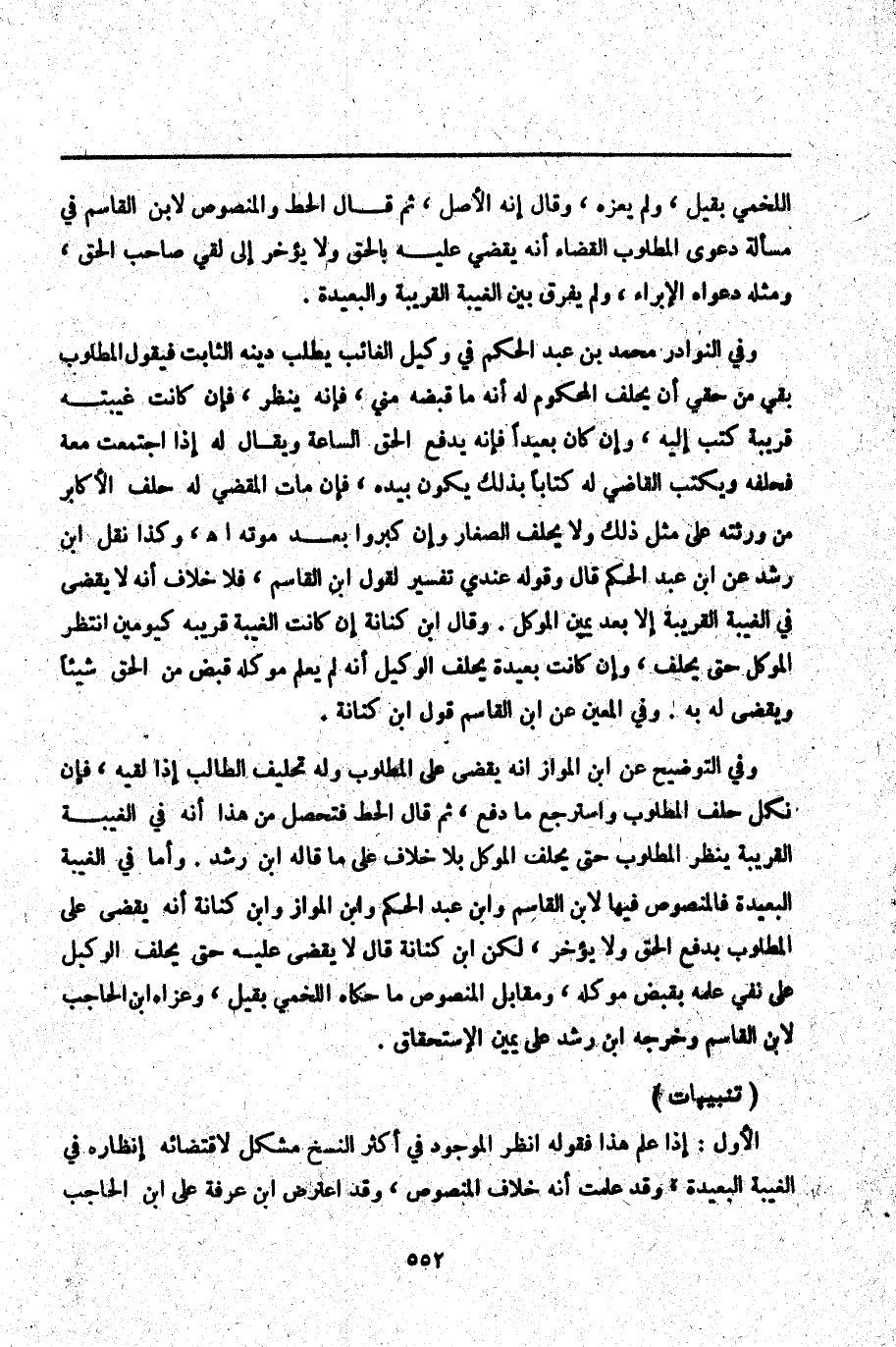 ـــــــــــــــــــــــــــــQاللَّخْمِيُّ بِقِيلِ، وَلَمْ يَعْزُهُ، وَقَالَ إنَّهُ الْأَصْلُ، ثُمَّ قَالَ الْحَطّ وَالْمَنْصُوصُ لِابْنِ الْقَاسِمِ فِي مَسْأَلَةِ دَعْوَى الْمَطْلُوبِ الْقَضَاءَ أَنَّهُ يُقْضَى عَلَيْهِ بِالْحَقِّ وَلَا يُؤَخَّرُ إلَى لَقِيَ صَاحِبِ الْحَقِّ، وَمِثْلُهُ دَعْوَاهُ الْإِبْرَاءَ، وَلَمْ يُفَرِّقْ بَيْنَ الْغَيْبَةِ الْقَرِيبَةِ وَالْبَعِيدَةِ. وَفِي النَّوَادِرِ مُحَمَّدُ بْنُ عَبْدِ الْحَكَمِ فِي وَكِيلِ الْغَائِبِ يَطْلُبُ دَيْنَهُ الثَّابِتَ فَيَقُولُ الْمَطْلُوبُ بَقِيَ مِنْ حَقِّي أَنْ يَحْلِفَ الْمَحْكُومُ لَهُ أَنَّهُ مَا قَبَضَهُ مِنِّي، فَإِنَّهُ يُنْظَرُ، فَإِنْ كَانَتْ غَيْبَتُهُ قَرِيبَةً كَتَبَ إلَيْهِ، وَإِنْ كَانَ بَعِيدًا فَإِنَّهُ يَدْفَعُ الْحَقَّ السَّاعَةَ وَيُقَالُ لَهُ إذَا اجْتَمَعْت مَعَهُ فَحَلِّفْهُ وَيَكْتُبُ الْقَاضِي لَهُ كِتَابًا بِذَلِكَ يَكُونُ بِيَدِهِ، فَإِنْ مَاتَ الْمَقْضِيُّ لَهُ حَلَفَ الْأَكَابِرُ مِنْ وَرَثَتِهِ عَلَى مِثْلِ ذَلِكَ وَلَا يَحْلِفُ الصِّغَارُ وَإِنْ كَبِرُوا بَعْدَ مَوْتِهِ. اهـ. وَكَذَا نَقَلَ ابْنُ رُشْدٍ عَنْ ابْنِ عَبْدِ الْحَكَمِ قَالَ وَقَوْلُهُ عِنْدِي تَفْسِيرٌ لِقَوْلِ ابْنِ الْقَاسِمِ، فَلَا خِلَافَ أَنَّهُ لَا يُقْضَى فِي الْغَيْبَةِ الْقَرِيبَةِ إلَّا بَعْدَ يَمِينِ الْمُوَكِّلِ. وَقَالَ ابْنُ كِنَانَةَ إنْ كَانَتْ الْغَيْبَةُ قَرِيبَةً كَيَوْمَيْنِ انْتَظَرَ الْمُوَكِّلُ حَتَّى يَحْلِفَ، وَإِنْ كَانَتْ بَعِيدَةً يَحْلِفُ الْوَكِيلُ أَنَّهُ لَمْ يَعْلَمْ مُوَكِّلَهُ قَبَضَ مِنْ الْحَقِّ شَيْئًا وَيُقْضَى لَهُ بِهِ. وَفِي الْمُعِينِ عَنْ ابْنِ الْقَاسِمِ قَوْلُ ابْنِ كِنَانَةَ. وَفِي التَّوْضِيحِ عَنْ ابْنِ الْمَوَّازِ أَنَّهُ يَقْضِي عَلَى الْمَطْلُوبِ وَلَهُ تَحْلِيفُ الطَّالِبِ إذَا لَقِيَهُ، فَإِنْ نَكَلَ حَلَفَ الْمَطْلُوبُ وَاسْتَرْجَعَ مَا دَفَعَ، ثُمَّ قَالَ الْحَطّ فَتَحَصَّلَ مِنْ هَذَا أَنَّهُ فِي الْغَيْبَةِ الْقَرِيبَةِ يُنْظَرُ الْمَطْلُوبُ حَتَّى يَحْلِفَ الْمُوَكِّلُ بِلَا خِلَافٍ عَلَى مَا قَالَهُ ابْنُ رُشْدٍ. وَأَمَّا فِي الْغَيْبَةِ الْبَعِيدَةِ فَالْمَنْصُوصُ فِيهَا لِابْنِ الْقَاسِمِ وَابْنِ عَبْدِ الْحَكَمِ وَابْنِ الْمَوَّازِ وَابْنِ كِنَانَةَ أَنَّهُ يُقْضَى عَلَى الْمَطْلُوبِ بِدَفْعِ الْحَقِّ وَلَا يُؤَخَّرُ، لَكِنَّ ابْنَ كِنَانَةَ قَالَ لَا يُقْضَى عَلَيْهِ حَقٌّ يَحْلِفُ الْوَكِيلُ عَلَى نَفْيِ عِلْمِهِ بِقَبْضِ مُوَكِّلِهِ، وَمُقَابِلُ الْمَنْصُوصِ مَا حَكَاهُ اللَّخْمِيُّ بِقِيلَ، وَعَزَاهُ ابْنُ الْحَاجِبِ لِابْنِ الْقَاسِمِ وَخَرَّجَهُ ابْنُ رُشْدٍ عَلَى يَمِينِ الِاسْتِحْقَاقِ.