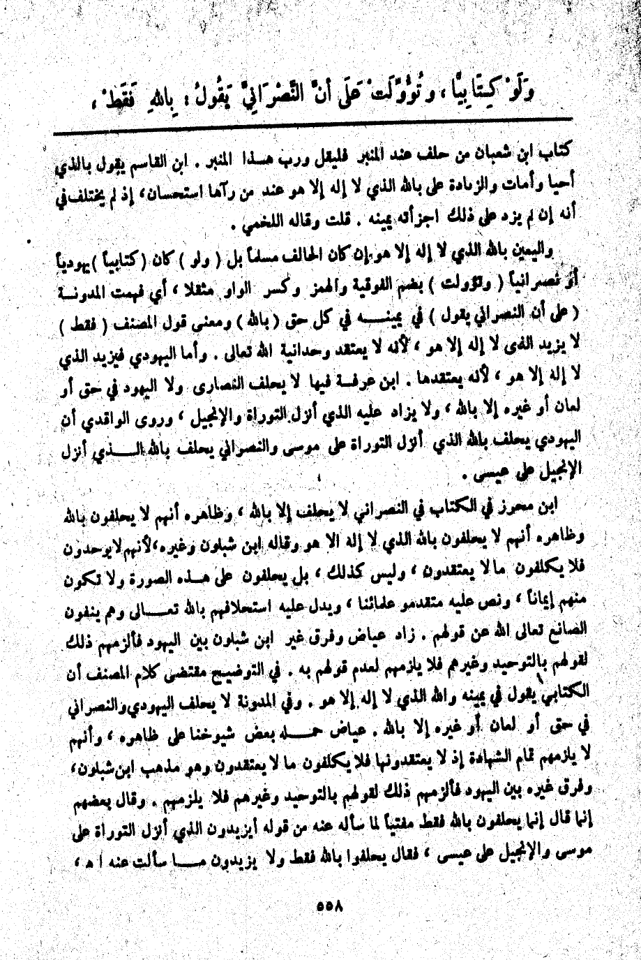وَلَوْ كِتَابِيًّا، وَتُؤُوِّلَتْ عَلَى أَنَّ النَّصْرَانِيَّ يَقُولُ: بِاَللَّهِ فَقَطْ