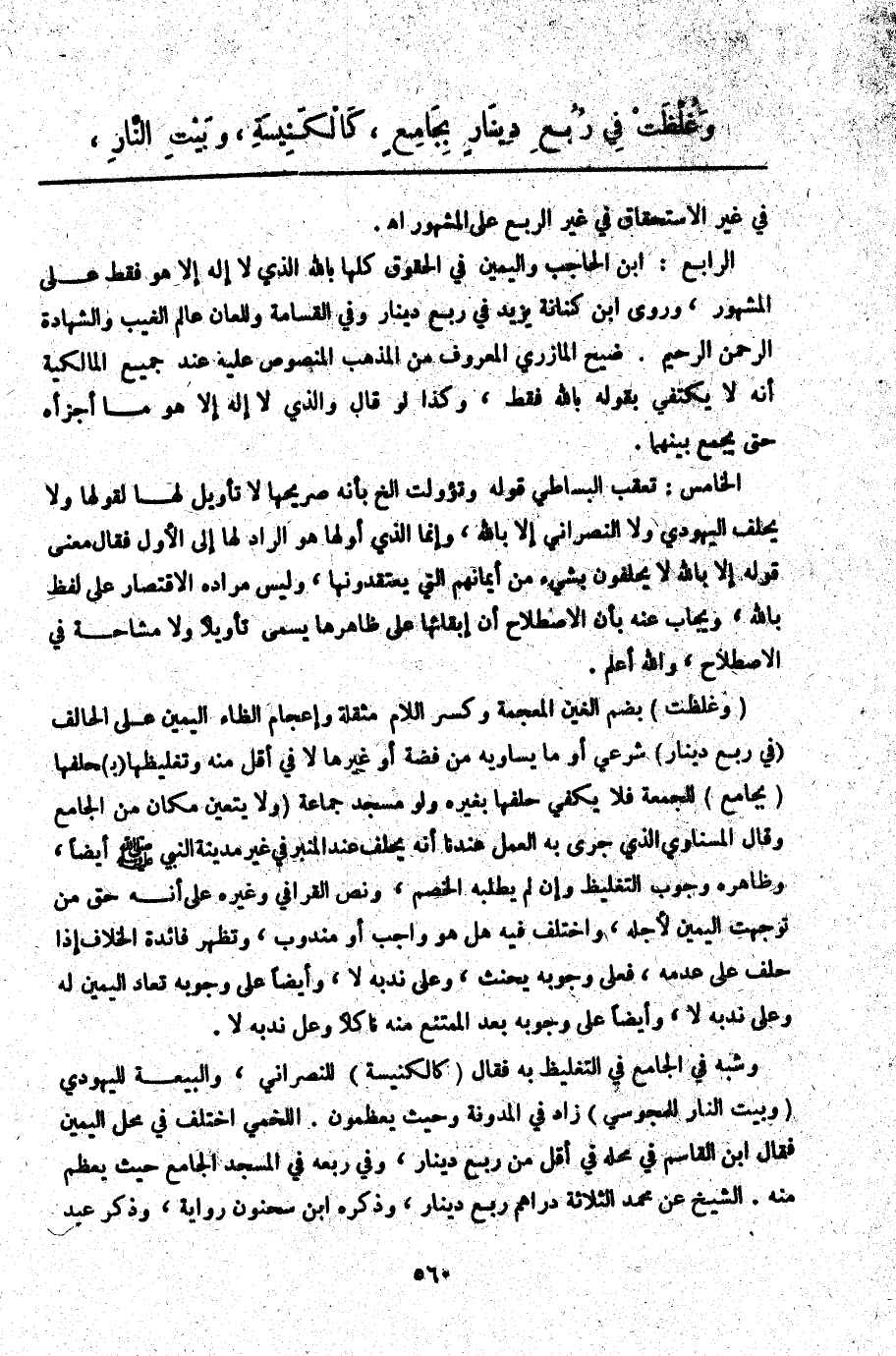 الرَّابِعُ: ابْنُ الْحَاجِبِ وَالْيَمِينُ فِي الْحُقُوقِ كُلِّهَا بِاَللَّهِ الَّذِي لَا إلَهَ إلَّا هُوَ فَقَطْ عَلَى الْمَشْهُورِ، وَرَوَى ابْنُ كِنَانَةَ يَزِيدُ فِي رُبْعِ دِينَارٍ وَفِي الْقَسَامَةِ وَلِلِّعَانِ عَالِمِ الْغَيْبِ وَالشَّهَادَةِ الرَّحْمَنِ الرَّحِيمِ. ضَيْح الْمَازِرِيُّ الْمَعْرُوفُ مِنْ الْمَذْهَبِ الْمَنْصُوصُ عَلَيْهِ عِنْدَ جَمِيعِ الْمَالِكِيَّةِ أَنَّهُ لَا يَكْتَفِي بِقَوْلِهِ بِاَللَّهِ فَقَطْ، وَكَذَا لَوْ قَالَ وَاَلَّذِي لَا إلَهَ إلَّا هُوَ مَا أَجْزَأَهُ حَتَّى يَجْمَعَ بَيْنَهُمَا.