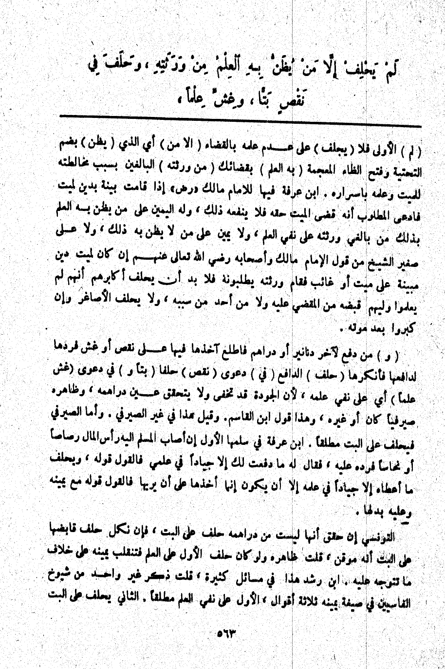 ـــــــــــــــــــــــــــــQلَمْ) الْأَوْلَى فَلَا (يَحْلِفُ) عَلَى عَدَمِ عِلْمِهِ بِالْقَضَاءِ (إلَّا مَنْ) أَيْ الَّذِي (يُظَنُّ) بِضَمِّ التَّحْتِيَّةِ وَفَتْحِ الظَّاءِ الْمُعْجَمَةِ (بِهِ الْعِلْمُ) بِقَضَائِك (مِنْ وَرَثَتِهِ) الْبَالِغِينَ بِسَبَبِ مُخَالَطَتِهِ لِلْمَيِّتِ وَعِلْمِهِ بِأَسْرَارِهِ. ابْنُ عَرَفَةَ فِيهَا لِلْإِمَامِ مَالِكٍ " - رَضِيَ اللَّهُ عَنْهُ - " إذَا قَامَتْ بَيِّنَةٌ بِدَيْنٍ لِمَيِّتٍ فَادَّعَى الْمَطْلُوبُ أَنَّهُ قَضَى الْمَيِّتَ حَقَّهُ فَلَا يَنْفَعُهُ ذَلِكَ، وَلَهُ الْيَمِينُ عَلَى مَنْ يَظُنُّ بِهِ الْعِلْمُ بِذَلِكَ مِنْ بَالِغِي وَرَثَتِهِ عَلَى نَفْيِ الْعِلْمِ، وَلَا يَمِينَ عَلَى مَنْ لَا يُظَنُّ بِهِ ذَلِكَ، وَلَا عَلَى صَغِيرٍ الشَّيْخُ مِنْ قَوْلِ الْإِمَامِ مَالِكٍ وَأَصْحَابِهِ - رَضِيَ اللَّهُ تَعَالَى عَنْهُمْ - إنْ كَانَ لِمَيِّتٍ دَيْنٌ مُبَيَّنَةٌ عَلَى مَيِّتٍ أَوْ غَائِبٍ فَقَامَ وَرَثَتُهُ يَطْلُبُونَهُ فَلَا بُدَّ أَنْ يَحْلِفَ أَكَابِرُهُمْ أَنَّهُمْ لَمْ يَعْلَمُوا وَلِيَّهُمْ قَبَضَهُ مِنْ الْمَقْضِيِّ عَلَيْهِ وَلَا مِنْ أَحَدٍ مِنْ سَبَبِهِ، وَلَا يَحْلِفُ الْأَصَاغِرُ وَإِنْ كَبِرُوا بَعْدَ مَوْتِهِ.