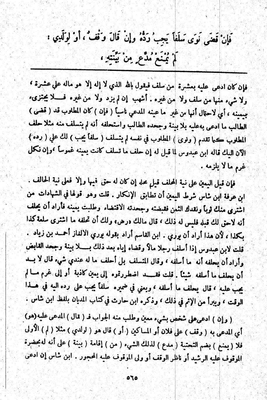 فَإِنْ قِيلَ الْيَمِينُ عَلَى نِيَّةِ الْمُحَلِّفِ قِيلَ مَحَلُّهُ إنْ كَانَ لَهُ حَقٌّ فِيهَا وَإِلَّا فَعَلَى نِيَّةِ الْحَالِفِ. ابْنُ عَرَفَةَ ابْنُ شَاسٍ شَرْطُ الْيَمِينِ أَنْ تُطَابِقَ الْإِنْكَارَ. قُلْت وَهُوَ قَوْلُهَا فِي الشَّهَادَاتِ مَنْ اشْتَرَى مِنْك ثَوْبًا وَنَقَدَك الثَّمَنَ فَقَبَضْته وَجَحَدْته الِاقْتِضَاءَ وَطَلَبْت يَمِينَهُ فَأَرَادَ أَنْ يَحْلِفَ أَنَّهُ لَا حَقَّ لَك قَبْلَهُ فَلَيْسَ لَهُ ذَلِكَ، قَالَ مَالِكٌ " - رَضِيَ اللَّهُ عَنْهُ - " وَلَك أَنْ تُحَلِّفَهُ مَا اشْتَرَى سِلْعَةَ كَذَا بِكَذَا؛ لِأَنَّ هَذَا أَرَادَ أَنْ يُورِيَ. ابْنُ الْقَاسِمِ أَرَادَ بِقَوْلِهِ يُورِيَ الْإِلْغَازَ أَحْمَدُ بْنُ زِيَادٍ. قُلْت لِابْنِ عَبْدُوسٍ إذَا أَسْلَفَ رَجُلًا مَالًا وَقَضَاهُ إيَّاهُ بَعْدَ ذَلِكَ بِلَا بَيِّنَةٍ وَجَحَدَ الْقَابِضُ وَأَرَادَ أَنْ يُحَلِّفَهُ أَنَّهُ مَا أَسْلَفَهُ، وَقَالَ الْمُتَسَلِّفُ بَلْ أَحْلِفُ مَا لَهُ عِنْدِي شَيْءٌ قَالَ لَا بُدَّ أَنْ يَحْلِفَ مَا أَسْلَفَهُ شَيْئًا. قُلْت فَقَدْ اضْطَرَرْتُمُوهُ إلَى يَمِينٍ كَاذِبَةٍ أَوْ إلَى غُرْمِ مَا لَمْ يَجِبْ عَلَيْهِ، قَالَ يَحْلِفُ مَا أَسْلَفَهُ، وَيَعْنِي فِي ضَمِيرِهِ سَلَفًا يَجِبُ عَلَيَّ رَدُّهُ إلَيْهِ فِي هَذَا الْوَقْتِ، وَيَبْرَأُ مِنْ الْإِثْمِ فِي ذَلِكَ، وَذَكَرَهُ ابْنُ حَارِثٍ فِي كِتَابِ الْمِدْيَانِ بِلَفْظِ ابْنِ شَاسٍ.