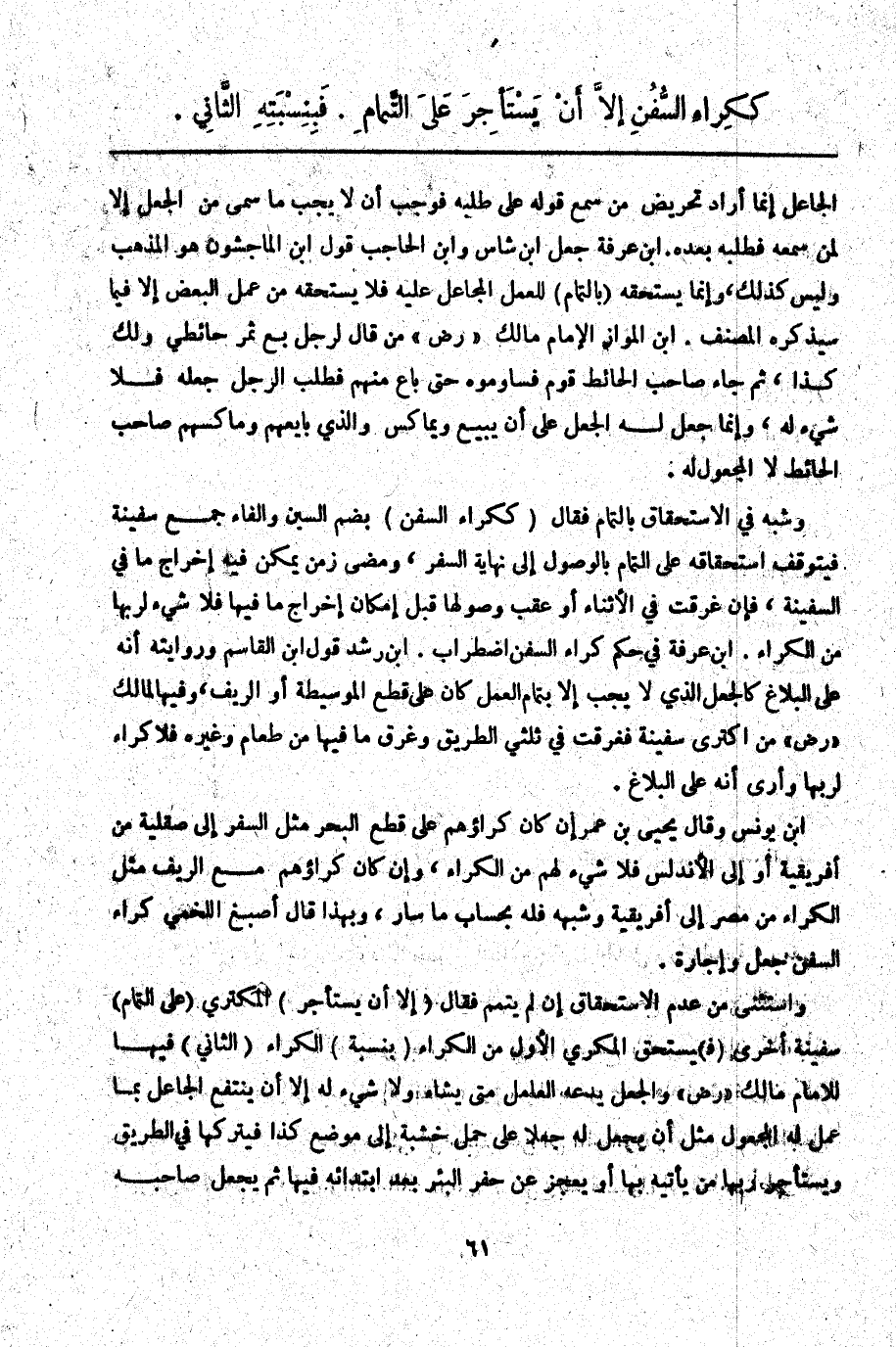 ابْنُ يُونُسَ وَقَالَ يَحْيَى بْنُ عُمَرَ إنْ كَانَ كِرَاؤُهُمْ عَلَى قَطْعِ الْبَحْرِ مِثْلَ السَّفَرِ إلَى صِقِلِّيَّةَ مِنْ إفْرِيقِيَّةَ أَوْ إلَى الْأَنْدَلُسِ فَلَا شَيْءَ لَهُمْ مِنْ الْكِرَاءِ، وَإِنْ كَانَ كِرَاؤُهُمْ مَعَ الرِّيفِ مِثْلَ الْكِرَاءِ مِنْ مِصْرَ إلَى إفْرِيقِيَّةَ وَشَبَهِهِ فَلَهُ بِحِسَابِ مَا سَارَ، وَبِهَذَا قَالَ أَصْبَغُ اللَّخْمِيُّ: كِرَاءُ السُّفُنِ جُعْلٌ وَإِجَارَةٌ.