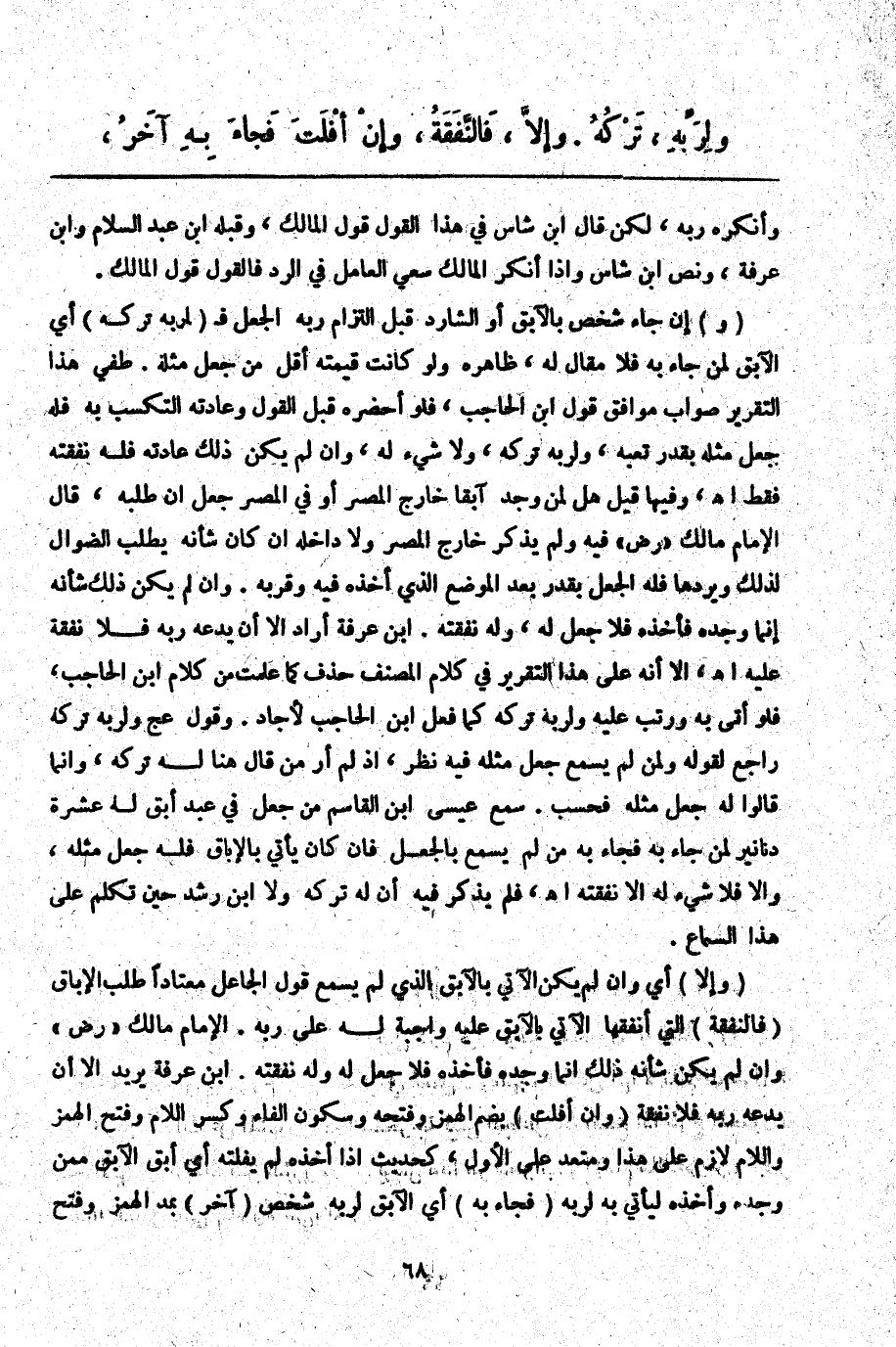 (وَإِلَّا) أَيْ وَإِنْ لَمْ يَكُنْ الْآتِي بِالْآبِقِ الَّذِي لَمْ يَسْمَعْ قَوْلَ الْجَاعِلِ مُعْتَادًا طَلَبَ الْإِبَاقِ (فَالنَّفَقَةُ) الَّتِي أَنْفَقَهَا الْآتِي بِالْآبِقِ عَلَيْهِ وَاجِبَةٌ لَهُ عَلَى رَبِّهِ. الْإِمَامُ مَالِكٌ " - رَضِيَ اللَّهُ عَنْهُ - " وَإِنْ لَمْ يَكُنْ شَأْنُهُ ذَلِكَ إنَّمَا وَجَدَهُ فَأَخَذَهُ فَلَا جُعْلَ لَهُ وَلَهُ نَفَقَتُهُ. ابْنُ عَرَفَةَ يُرِيدُ إلَّا أَنْ يَدَعَهُ رَبُّهُ فَلَا نَفَقَةَ
