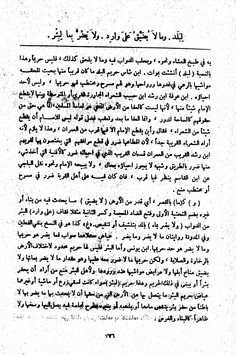 ـــــــــــــــــــــــــــــQبِهِ فِي طَبْخِ الْعَشَاءِ وَنَحْوَهُ، وَبِحَلْبِ الدَّوَابِّ فِيهِ وَمَا لَا يَلْحَقُ كَذَلِكَ، فَلَيْسَ حَرِيمًا وَهَذَا بِالنِّسْبَةِ (لِبَلَدٍ) أُنْشِئَتْ بِمَوَاتٍ. ابْنِ شَاسٍ حَرِيمُ الْبَلَدِ مَا كَانَ قَرِيبًا مِنْهَا بِحَيْثُ تَلْحَقُهُ مَوَاشِيهَا بِالرَّعْيِ فِي غُدُوِّهَا وَرَوَاحِهَا، وَهُوَ لَهُمْ مَسْرَحٌ وَمُحْتَطَبٌ فَهُوَ حَرِيمُهَا، وَلَيْسَ لِأَحَدٍ إحْيَاؤُهُ. ابْنُ عَرَفَةَ ابْنُ رُشْدٍ ابْنُ حَبِيبٍ الشَّعْرَاءُ الْمُجَاوِرَةُ لِلْقُرَى أَوْ الْمُتَوَسِّطَةُ بَيْنَهُمَا لَا يَقْطَعُ الْإِمَامُ شَيْئًا مِنْهَا؛ لِأَنَّهَا لَيْسَتْ كَالْعَفَا مِنْ الْأَرْضِ الَّذِي هُوَ لِعَامَّةِ الْمُسْلِمِينَ، إنَّمَا هِيَ حَقٌّ مِنْ حُقُوقِهِمْ كَالسَّاحَةِ لِلدُّورِ، وَإِنَّمَا الْعَفَا مَا بَعُدَ وَتُعُقِّبَ فَضْلُ قَوْلِهِ لَيْسَ لِلْإِمَامِ أَنْ يَقْطَعَ شَيْئًا مِنْ الشَّعْرَاءِ فَقَالَ وَأَيْنَ يَقْطَعُ الْإِمَامُ إلَّا فِيمَا قَرُبَ مِنْ الْعُمْرَانِ، وَهَذَا لَا يَلْزَمُ؛ لِأَنَّهُ أَرَادَ الشَّعْرَاءَ الْقَرِيبَةَ جِدًّا؛ لِأَنَّ إقْطَاعَهَا ضَرَرٌ فِي قَطْعِ مَرَافِقِهِمْ الَّتِي يَخْتَصُّونَ بِهَا لِقُرْبِهِمْ ابْنُ رُشْدٍ الْقَرِيبُ مِنْ الْعُمْرَانِ قِسْمَانِ الْقَرِيبُ الَّذِي فِي إحْيَائِهِ ضَرَرٌ كَالْأَفْنِيَةِ الَّتِي أُخِذَ شَيْءٍ مِنْهَا ضَرَرٌ بِالطَّرِيقِ وَشَبَهِهِ لَا يَجُوزُ إحْيَاؤُهُ بِحَالٍ، وَلَا يُبِيحُهُ الْإِمَامُ وَنَحْوُهُ نَقَلَ الْبَاجِيَّ عَنْ ابْنِ الْقَاسِمِ يُنْظَرُ فِيمَا قَرُبَ، فَإِنْ كَانَ فِيهِ عَلَى أَهْلِ الْقَرْيَةِ ضَرَرٌ فِي مَسْرَحٍ أَوْ مُحْتَطَبٍ مُنِعَ.