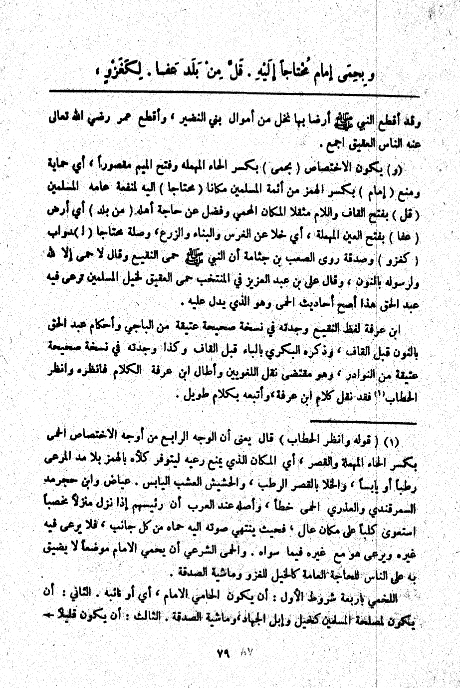 وَبِحِمَى إمَامٍ مُحْتَاجًا إلَيْهِ. قَلَّ مِنْ بَلَدٍ عَفَا. لِكَغَزْوٍ