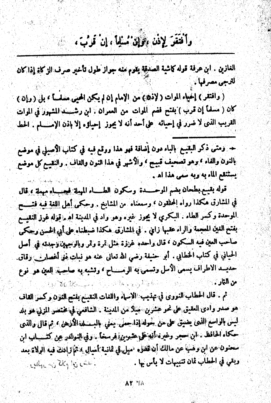 (وَافْتَقَرَ) إحْيَاءُ الْمَوَاتِ (لِإِذْنِ) مِنْ الْإِمَامِ إنْ لَمْ يَكُنْ الْمُحْيِي مُسْلِمًا، بَلْ (وَإِنْ) كَانَ (مُسْلِمًا إنْ قَرُبَ) بِفَتْحٍ فَضَمٍّ الْمَوَاتُ مِنْ الْعُمْرَانِ. ابْنُ رُشْدٍ الْمَشْهُورُ فِي الْمَوَاتِ الْقَرِيبِ الَّذِي لَا ضَرَرَ فِي إحْيَائِهِ عَلَى أَحَدٍ أَنَّهُ لَا يَجُوزُ إحْيَاؤُهُ إلَّا بِإِذْنِ الْإِمَامِ. الْحَطّ