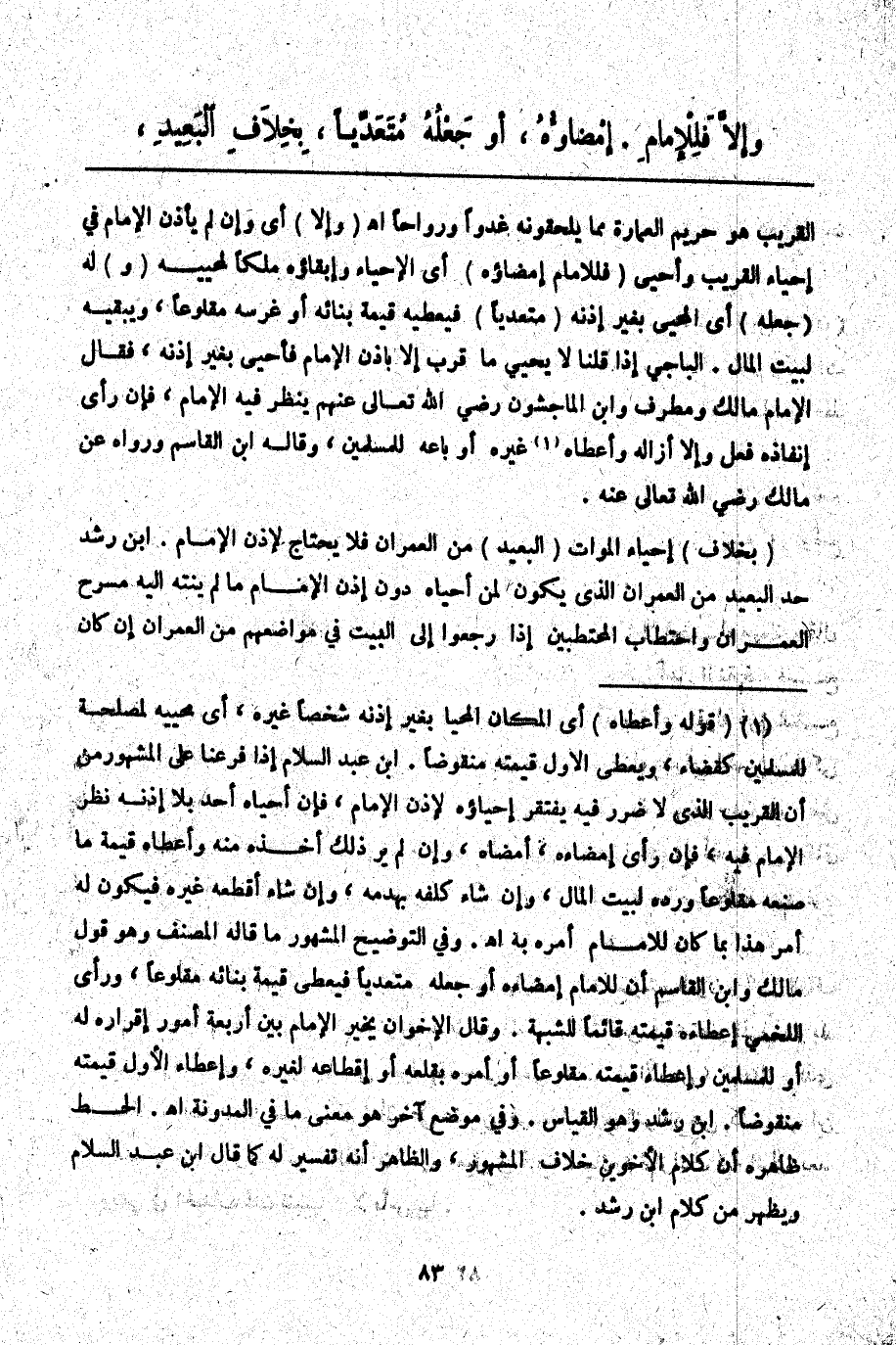 (بِخِلَافِ) إحْيَاءِ الْمَوَاتِ (الْبَعِيدِ) مِنْ الْعُمْرَانِ فَلَا يَحْتَاجُ لِإِذْنِ الْإِمَامِ. ابْنُ رُشْدٍ حَدُّ الْبَعِيدِ مِنْ الْعُمْرَانِ الَّذِي يَكُونُ لِمَنْ أَحْيَاهُ دُونَ إذْنِ الْإِمَامِ مَا لَمْ يَنْتَهِ إلَيْهِ مَسْرَحُ الْعُمْرَانِ وَاحْتِطَابُ الْمُحْتَطِبِينَ إذَا رَجَعُوا إلَى الْبَيْتِ فِي مَوَاضِعِهِمْ مِنْ الْعُمْرَانِ إنْ كَانَ