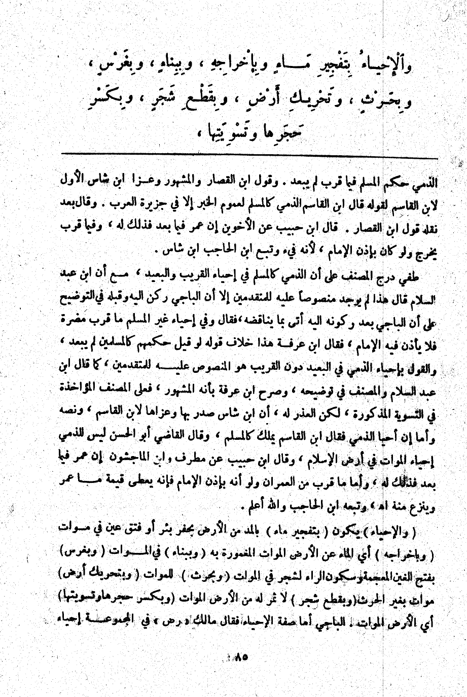 طفي دَرَجَ الْمُصَنِّفُ عَلَى أَنَّ الذِّمِّيَّ كَالْمُسْلِمِ فِي إحْيَاءِ الْقَرِيبِ وَالْبَعِيدِ، مَعَ أَنَّ ابْنَ عَبْدِ السَّلَامِ قَالَ: هَذَا لَمْ يُوجَدْ مَنْصُوصًا عَلَيْهِ لِلْمُتَقَدِّمِينَ إلَّا أَنَّ الْبَاجِيَّ رَكَنَ إلَيْهِ وَقَبِلَهُ فِي التَّوْضِيحِ عَلَى أَنَّ الْبَاجِيَّ بَعْدَ رُكُونِهِ إلَيْهِ أَتَى بِمَا يُنَاقِضُهُ، فَقَالَ وَفِي إحْيَاءِ غَيْرِ الْمُسْلِمِ مَا قَرُبَ مَضَرَّةٌ فَلَا يَأْذَنُ فِيهِ الْإِمَامُ، فَقَالَ ابْنُ عَرَفَةَ هَذَا خِلَافُ قَوْلِهِ لَوْ قِيلَ حُكْمُهُمْ كَالْمُسْلِمِينَ لَمْ يَبْعُدْ، وَالْقَوْلُ بِإِحْيَاءِ الذِّمِّيِّ فِي الْبَعِيدِ دُونَ الْقَرِيبِ هُوَ الْمَنْصُوصُ عَلَيْهِ لِلْمُتَقَدِّمِينَ، كَمَا قَالَ ابْنُ عَبْدِ السَّلَامِ وَالْمُصَنِّفُ فِي تَوْضِيحِهِ، وَصَرَّحَ ابْنُ عَرَفَةَ بِأَنَّهُ الْمَشْهُورُ، فَعَلَى الْمُصَنِّفِ الْمُؤَاخَذَةُ فِي التَّسْوِيَةِ الْمَذْكُورَةِ، لَكِنَّ الْعُذْرَ لَهُ أَنَّ ابْنَ شَاسٍ صَدَّرَ بِهَا وَعَزَاهَا لِابْنِ الْقَاسِمِ، وَنَصُّهُ: وَأَمَّا إنْ أَحْيَا الذِّمِّيُّ فَقَالَ ابْنُ الْقَاسِمِ يَمْلِكُ كَالْمُسْلِمِ، وَقَالَ الْقَاضِي أَبُو الْحَسَنِ لَيْسَ لِلذِّمِّيِّ إحْيَاءُ الْمَوَاتِ فِي أَرْضِ الْإِسْلَامِ، وَقَالَ ابْنُ حَبِيبٍ عَنْ مُطَرِّفٍ وَابْنِ الْمَاجِشُونِ إنْ عَمَّرَ فِيمَا بَعُدَ فَذَلِكَ لَهُ، وَأَمَّا مَا قَرُبَ مِنْ الْعُمْرَانِ وَلَوْ أَنَّهُ بِإِذْنِ الْإِمَامِ فَإِنَّهُ يُعْطَى قِيمَةَ مَا عَمَّرَ وَيُنْزَعُ مِنْهُ. اهـ. وَتَبِعَهُ ابْنُ الْحَاجِبِ وَاَللَّهُ أَعْلَمُ.