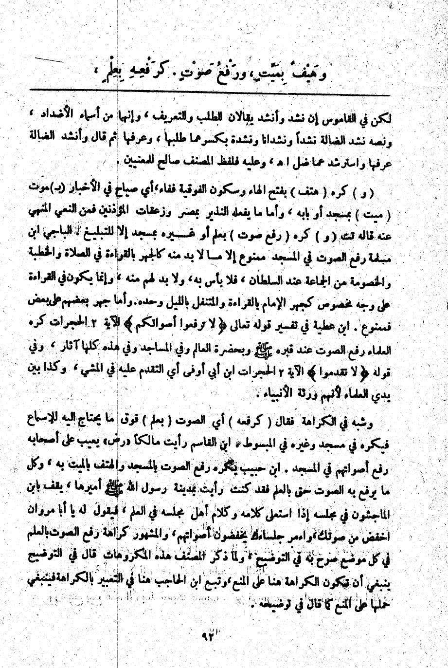 (وَ) كُرِهَ (هَتْفٌ) بِفَتْحِ الْهَاءِ وَسُكُونِ الْفَوْقِيَّةِ فَفَاءٍ، أَيْ صِيَاحٌ فِي الْأَخْبَارِ (بِ) مَوْتِ (مَيِّتٍ) بِمَسْجِدٍ أَوْ بَابِهِ، وَأَمَّا مَا يَفْعَلُهُ النَّذِيرُ بِمِصْرَ وَزَعَقَاتُ الْمُؤَذِّنِينَ فَمِنْ النَّعْيِ الْمَنْهِيِّ عَنْهُ قَالَهُ تت (وَ) كُرِهَ (رَفْعُ صَوْتٍ) بِعِلْمٍ أَوْ غَيْرِهِ بِمَسْجِدٍ إلَّا لِلتَّبْلِيغِ. الْبَاجِيَّ ابْنُ مَسْلَمَةَ رَفْعُ الصَّوْتِ فِي الْمَسْجِدِ مَمْنُوعٌ إلَّا مَا لَا بُدَّ مِنْهُ كَالْجَهْرِ بِالْقِرَاءَةِ فِي الصَّلَاةِ وَالْخُطْبَةِ وَالْخُصُومَةِ مِنْ الْجَمَاعَةِ عِنْدَ السُّلْطَانِ، فَلَا بَأْسَ بِهِ، وَلَا بُدَّ لَهُمْ مِنْهُ، وَإِنَّمَا يَكُونُ فِي الْقِرَاءَةِ عَلَى وَجْهٍ مَخْصُوصٍ كَجَهْرِ الْإِمَامِ بِالْقِرَاءَةِ وَالْمُتَنَفِّلِ بِاللَّيْلِ وَحْدَهُ. وَأَمَّا جَهْرُ بَعْضِهِمْ عَلَى بَعْضٍ فَمَمْنُوعٌ. ابْنُ عَطِيَّةَ فِي تَفْسِيرِ قَوْله تَعَالَى {لا تَرْفَعُوا أَصْوَاتَكُمْ} [الحجرات: 2] كَرِهَ الْعُلَمَاءُ رَفْعُ الصَّوْتِ عِنْدَ قَبْرِهِ - صَلَّى اللَّهُ عَلَيْهِ وَسَلَّمَ - وَبِحَضْرَةِ الْعَالِمِ وَفِي الْمَسَاجِدِ وَفِي هَذِهِ كُلِّهَا آثَارٌ، وَفِي قَوْلِهِ {لا تُقَدِّمُوا} [الحجرات: 1] ابْنُ أَبِي أَوْفَى أَيْ التَّقَدُّمُ عَلَيْهِ فِي الْمَشْيِ، وَكَذَا بَيْنَ يَدَيْ الْعُلَمَاءِ؛ لِأَنَّهُمْ وَرَثَةُ الْأَنْبِيَاءِ.