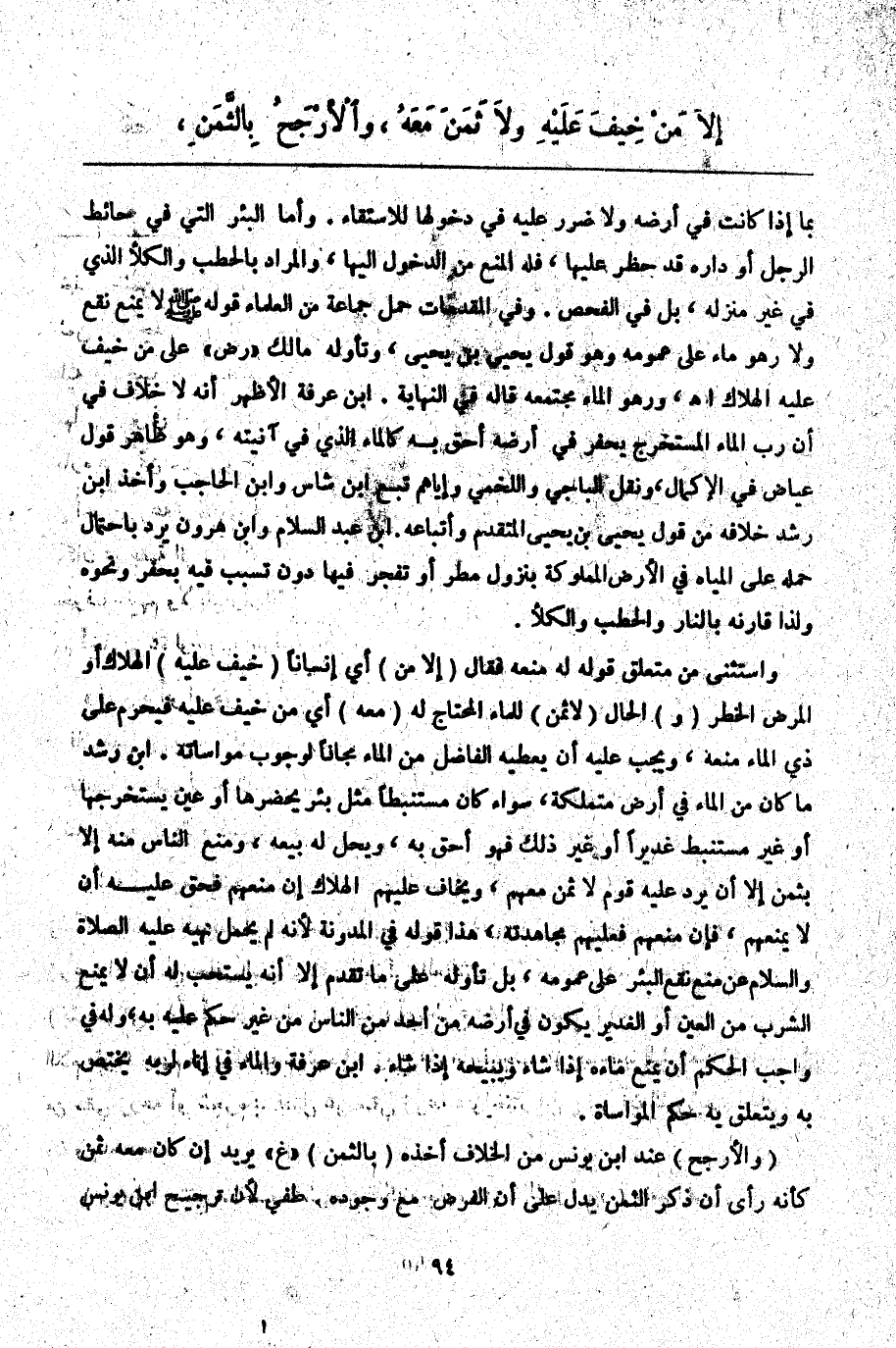 ـــــــــــــــــــــــــــــQبِمَا إذَا كَانَتْ فِي أَرْضِهِ وَلَا ضَرَرَ عَلَيْهِ فِي دُخُولِهَا لِلِاسْتِقَاءِ. وَأَمَّا الْبِئْرُ الَّتِي فِي حَائِطِ الرَّجُلِ أَوْ دَارِهِ قَدْ حَظَرَ عَلَيْهَا، فَلَهُ الْمَنْعُ مِنْ الدُّخُولِ إلَيْهَا، وَالْمُرَادُ بِالْحَطَبِ وَالْكَلَأِ الَّذِي فِي غَيْرِ مَنْزِلِهِ، بَلْ فِي الْفَحْصِ. وَفِي الْمُقَدِّمَاتِ حَمَلَ جَمَاعَةٌ مِنْ الْعُلَمَاءِ قَوْلَهُ - صَلَّى اللَّهُ عَلَيْهِ وَسَلَّمَ - «لَا يُمْنَعُ نَقْعٌ وَلَا رَهْوُ مَاءٍ» عَلَى عُمُومِهِ، وَهُوَ قَوْلُ يَحْيَى بْنِ يَحْيَى، وَتَأَوَّلَهُ مَالِكٌ " - رَضِيَ اللَّهُ عَنْهُ - " عَلَى مَنْ خِيفَ عَلَيْهِ الْهَلَاكُ اهـ وَرَهْوُ الْمَاءِ مُجْتَمَعُهُ قَالَهُ فِي النِّهَايَةِ. ابْنُ عَرَفَةَ الْأَظْهَرُ أَنَّهُ لَا خِلَافَ فِي أَنَّ رَبَّ الْمَاءِ الْمُسْتَخْرَجِ يَحْفِرُ فِي أَرْضِهِ أَحَقُّ بِهِ كَالْمَاءِ الَّذِي فِي آنِيَتِهِ، وَهُوَ ظَاهِرُ قَوْلِ عِيَاضٍ فِي الْإِكْمَالِ، وَنَقَلَ الْبَاجِيَّ وَاللَّخْمِيُّ وَإِيَّاهُمْ تَبِعَ ابْنُ شَاسٍ وَابْنُ الْحَاجِبِ وَأَخَذَ ابْنُ رُشْدٍ خِلَافَهُ مِنْ قَوْلِ يَحْيَى بْنُ يَحْيَى الْمُتَقَدِّمِ وَأَتْبَاعِهِ. ابْنُ عَبْدِ السَّلَامِ وَابْنُ هَارُونَ يُرَدُّ بِاحْتِمَالِ حَمْلِهِ عَلَى الْمِيَاهِ فِي الْأَرْضِ الْمَمْلُوكَةِ بِنُزُولِ مَطَرٍ أَوْ تَفَجُّرٍ فِيهَا دُونَ تَسَبُّبٍ فِيهِ بِحَفْرٍ وَنَحْوِهِ وَلِذَا قَارَنَهُ بِالنَّارِ وَالْحَطَبِ وَالْكَلَأِ.