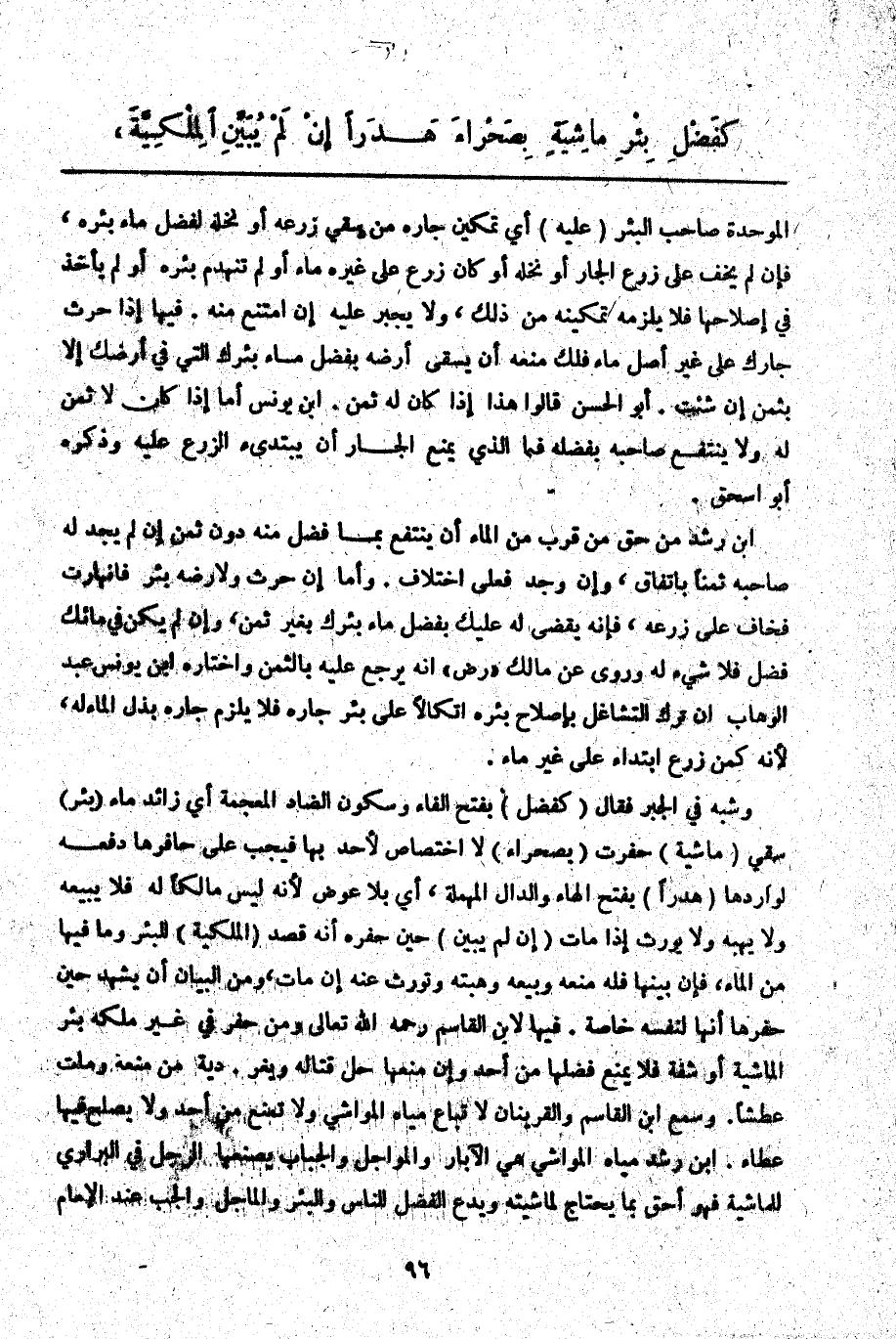 ابْنُ رُشْدٍ مِنْ حَقِّ مَنْ قَرُبَ مِنْ الْمَاءِ أَنْ يَنْتَفِعَ بِمَا فَضَلَ مِنْهُ دُونَ ثَمَنٍ إنْ لَمْ يَجِدْ لَهُ صَاحِبُهُ ثَمَنًا بِاتِّفَاقٍ، وَإِنْ وَجَدَ فَعَلَى اخْتِلَافٍ. وَأَمَّا إنْ حَرَثَ وَلِأَرْضِهِ بِئْرٌ فَانْهَارَتْ فَخَافَ عَلَى زَرْعِهِ، فَإِنَّهُ يُقْضَى لَهُ عَلَيْك بِفَضْلِ مَاءِ بِئْرِك بِغَيْرِ ثَمَنٍ، وَإِنْ لَمْ يَكُنْ فِي مَائِكَ فَضْلٌ فَلَا شَيْءَ لَهُ وَرُوِيَ عَنْ مَالِكٍ " - رَضِيَ اللَّهُ عَنْهُ - " أَنَّهُ يَرْجِعُ عَلَيْهِ بِالثَّمَنِ وَاخْتَارَهُ ابْنُ يُونُسَ عَبْدُ الْوَهَّابِ إنْ تَرَكَ التَّشَاغُلَ بِإِصْلَاحِ بِئْرِهِ اتِّكَالًا عَلَى بِئْرِ جَارِهِ فَلَا يَلْزَمُ جَارَهُ بَذْلُ الْمَاءِ لَهُ؛ لِأَنَّهُ كَمَنْ زَرَعَ ابْتِدَاءً عَلَى غَيْرِ مَاءٍ.