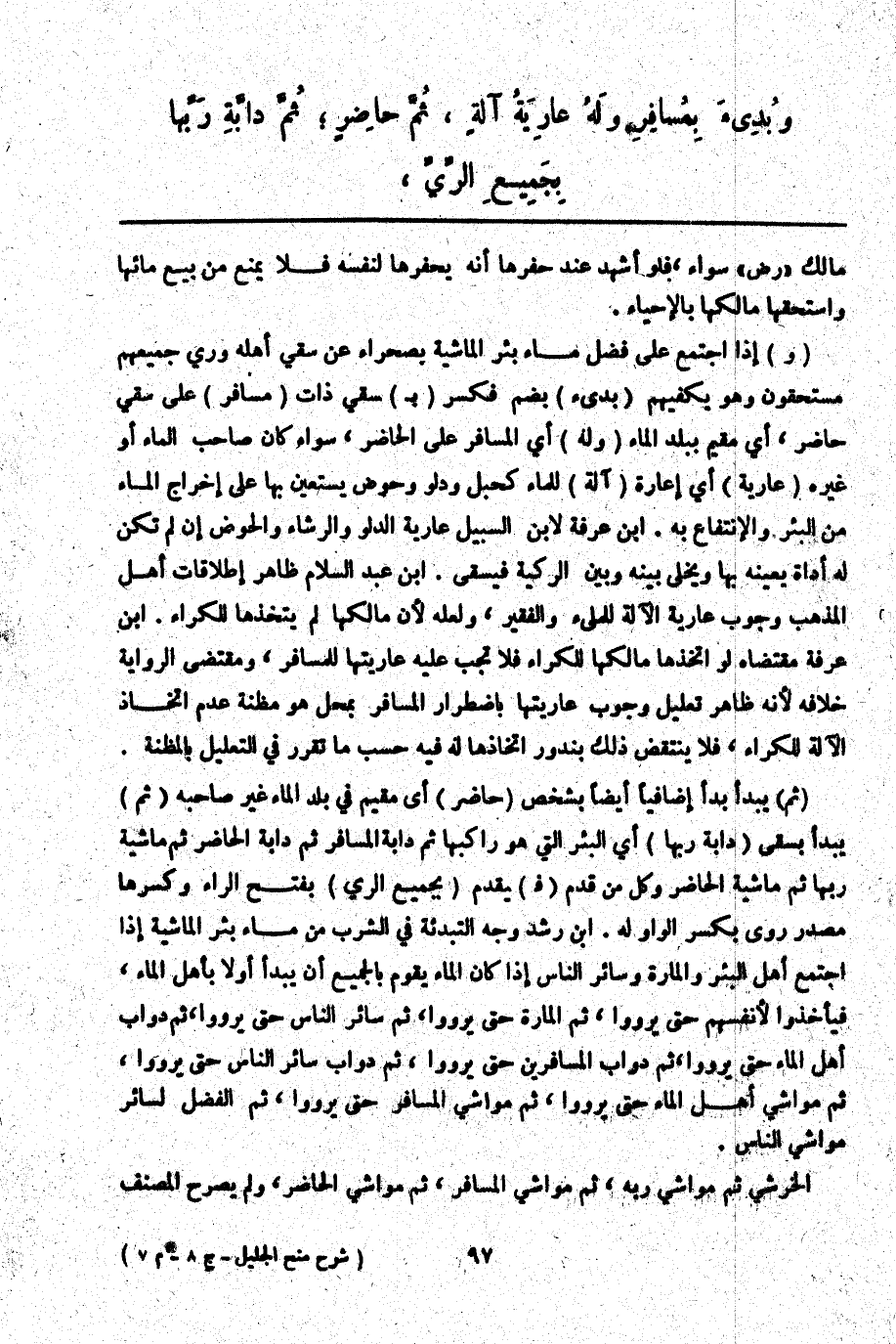 (وَ) إذَا اجْتَمَعَ عَلَى فَضْلِ مَاءِ بِئْرِ الْمَاشِيَةِ بِصَحْرَاءَ عَنْ سَقْيِ أَهْلِهِ وَرَيٍّ جَمِيعُهُمْ مُسْتَحِقُّونَ، وَهُوَ يَكْفِيهِمْ (بُدِئَ) بِضَمٍّ فَكَسْرٍ (بِ) سَقْيِ ذَاتِ (مُسَافِرٍ) عَلَى سَقْيِ حَاضِرٍ، أَيْ مُقِيمٍ بِبَلَدِ الْمَاءِ (وَلَهُ) أَيْ الْمُسَافِرِ عَلَى الْحَاضِرِ، سَوَاءٌ كَانَ صَاحِبَ الْمَاءِ أَوْ غَيْرَهُ (عَارِيَّةٌ) أَيْ إعَارَةُ (آلَةٍ) لِلْمَاءِ كَحَبْلٍ وَدَلْوٍ وَحَوْضٍ يَسْتَعِينُ بِهَا عَلَى إخْرَاجِ الْمَاءِ مِنْ الْبِئْرِ وَالِانْتِفَاعِ بِهِ. ابْنُ عَرَفَةَ لِابْنِ السَّبِيلِ عَارِيَّةُ الدَّلْوِ وَالرِّشَاءِ وَالْحَوْضِ إنْ لَمْ تَكُنْ لَهُ أَدَاةٌ يُعِينُهُ بِهَا وَيُخَلَّى بَيْنَهُ وَبَيْنَ الرَّكِيَّةِ فَيَسْقِي. ابْنُ عَبْدِ السَّلَامِ ظَاهِرُ إطْلَاقَاتِ أَهْلِ الْمَذْهَبِ وُجُوبُ عَارِيَّةِ الْآلَةِ لِلْمَلِيءِ وَالْفَقِيرِ، وَلَعَلَّهُ؛ لِأَنَّ مَالِكَهَا لَمْ يَتَّخِذْهَا لِلْكِرَاءِ. ابْنُ عَرَفَةَ مُقْتَضَاهُ لَوْ اتَّخَذَهَا مَالِكُهَا لِلْكِرَاءِ فَلَا تَجِبُ عَلَيْهِ عَارِيَّتُهَا لِلْمُسَافِرِ، وَمُقْتَضَى الرِّوَايَةِ خِلَافُهُ؛ لِأَنَّهُ ظَاهِرُ تَعْلِيلِ وُجُوبِ عَارِيَّتِهَا بِاضْطِرَارِ الْمُسَافِرِ بِمَحَلٍّ هُوَ مَظِنَّةُ عَدَمِ اتِّخَاذِ الْآلَةِ لِلْكِرَاءِ، فَلَا يُنْتَقَضُ ذَلِكَ بِنُدُورِ اتِّخَاذِهَا لَهُ فِيهِ حَسَبَ مَا تَقَرَّرَ فِي التَّعْلِيلِ بِالْمَظِنَّةِ.