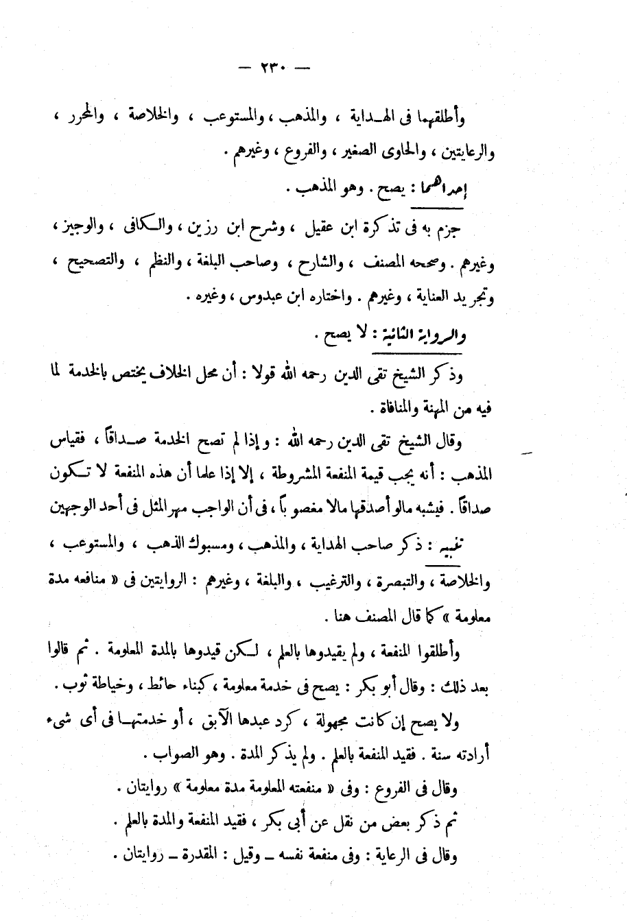 ذَكَرَ صَاحِبُ الْهِدَايَةِ، وَالْمُذْهَبِ، وَمَسْبُوكِ الذَّهَبِ، وَالْمُسْتَوْعِبِ، وَالْخُلَاصَةِ وَالتَّبْصِرَةِ، وَالتَّرْغِيبِ، وَالْبُلْغَةِ، وَغَيْرِهِمْ: الرِّوَايَتَيْنِ فِي " مَنَافِعِهِ مُدَّةً مَعْلُومَةً " كَمَا قَالَ الْمُصَنِّفُ هُنَا. وَأَطْلَقُوا الْمَنْفَعَةَ، وَلَمْ يُقَيِّدُوهَا بِالْعِلْمِ، لَكِنْ قَيَّدُوهَا بِالْمُدَّةِ الْمَعْلُومَةِ. ثُمَّ قَالُوا بَعْدَ ذَلِكَ: وَقَالَ أَبُو بَكْرٍ: يَصِحُّ فِي خِدْمَةٍ مَعْلُومَةٍ، كَبِنَاءِ حَائِطٍ، وَخِيَاطَةِ ثَوْبٍ. وَلَا يَصِحُّ إنْ كَانَتْ مَجْهُولَةً، كَرَدِّ عَبْدِهَا الْآبِقِ، أَوْ خِدْمَتِهَا فِي أَيِّ شَيْءٍ أَرَادَتْهُ سَنَةً. فَقَيَّدَ الْمَنْفَعَةَ بِالْعِلْمِ. وَلَمْ يَذْكُرْ الْمُدَّةَ. وَهُوَ الصَّوَابُ. وَقَالَ فِي الْفُرُوعِ: وَفِي " مَنْفَعَتِهِ الْمَعْلُومَةِ مُدَّةً مَعْلُومَةً " رِوَايَتَانِ. ثُمَّ ذَكَرَ بَعْضَ مَنْ نَقَلَ عَنْ أَبِي بَكْرٍ، فَقَيَّدَ الْمَنْفَعَةَ وَالْمُدَّةَ بِالْعِلْمِ. وَقَالَ فِي الرِّعَايَةِ: وَفِي مَنْفَعَةِ نَفْسِهِ وَقِيلَ: الْمُقَدَّرَةُ رِوَايَتَانِ.