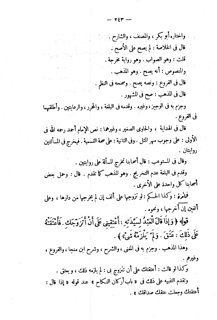 وَاخْتَارَهُ أَبُو بَكْرٍ، وَالْمُصَنِّفُ، وَالشَّارِحُ. قَالَ فِي الْخُلَاصَةِ: لَمْ يَصِحَّ عَلَى الْأَصَحِّ. قُلْت: وَهُوَ الصَّوَابُ. وَهُوَ رِوَايَةٌ مُخَرَّجَةٌ. وَالْمَنْصُوصُ: أَنَّهُ يَصِحُّ. وَهُوَ الْمَذْهَبُ. قَالَ فِي الْفُرُوعِ: وَنَصُّهُ يَصِحُّ. وَصَحَّحَهُ فِي النَّظْمِ. قَالَ فِي الْمُذْهَبِ: صَحَّ فِي الْمَشْهُورِ. وَجَزَمَ بِهِ فِي الْوَجِيزِ، وَغَيْرِهِ. وَقَدَّمَهُ فِي الْبُلْغَةِ، وَالْمُحَرَّرِ، وَالرِّعَايَتَيْنِ. وَأَطْلَقَهُمَا فِي الْفُرُوعِ. قَالَ فِي الْهِدَايَةِ، وَالْحَاوِي الصَّغِيرِ، وَغَيْرِهِمَا: نَصَّ الْإِمَامُ أَحْمَدُ - رَحِمَهُ اللَّهُ - فِي الْأُولَى: عَلَى وُجُوبِ مَهْرِ الْمِثْلِ. وَفِي الثَّانِيَةِ: عَلَى صِحَّةِ التَّسْمِيَةِ. فَيَخْرُجُ فِي الْمَسْأَلَتَيْنِ رِوَايَتَانِ. وَقَالَ فِي الْمُسْتَوْعِبِ: قَالَ أَصْحَابُنَا تَخْرُجُ الْمَسْأَلَةُ عَلَى رِوَايَتَيْنِ. وَقَدَّمَ فِي الْبُلْغَةِ عَدَمَ التَّخْرِيجِ. وَهُوَ الْمَذْهَبُ كَمَا تَقَدَّمَ. قَالَ: وَحَمَلَ بَعْضُ أَصْحَابِنَا كُلَّ وَاحِدَةٍ عَلَى الْأُخْرَى.