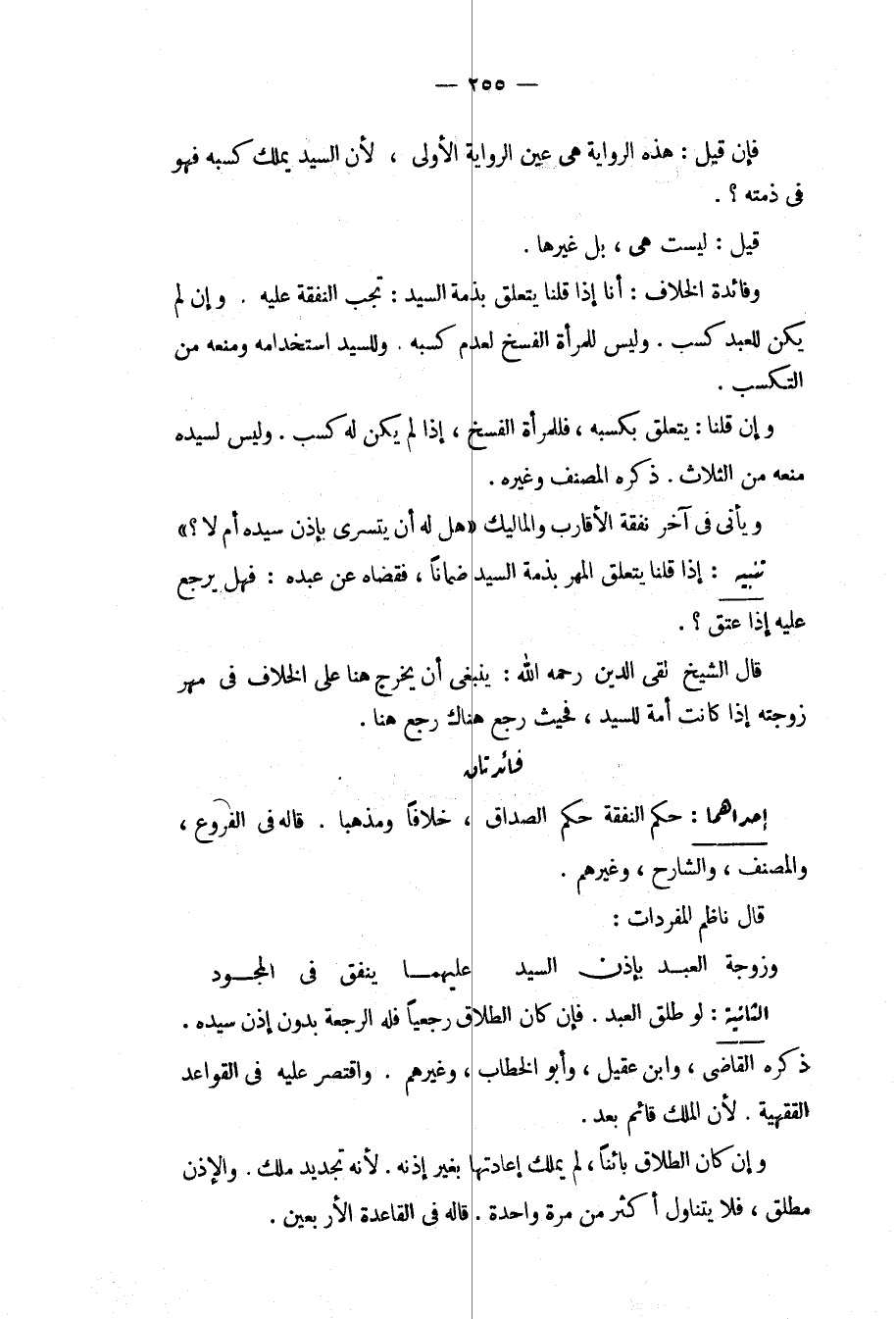 الثَّانِيَةُ: لَوْ طَلَّقَ الْعَبْدُ. فَإِنْ كَانَ الطَّلَاقُ رَجْعِيًّا فَلَهُ الرَّجْعَةُ بِدُونِ إذْنِ سَيِّدِهِ. ذَكَرَهُ الْقَاضِي، وَابْنُ عَقِيلٍ، وَأَبُو الْخَطَّابِ، وَغَيْرُهُمْ. وَاقْتَصَرَ عَلَيْهِ فِي الْقَوَاعِدِ الْفِقْهِيَّةِ؛ لِأَنَّ الْمِلْكَ قَائِمٌ بَعْدُ. وَإِنْ كَانَ الطَّلَاقُ بَائِنًا، لَمْ يَمْلِكْ إعَادَتَهَا بِغَيْرِ إذْنِهِ؛ لِأَنَّهُ تَجْدِيدُ مِلْكٍ. وَالْإِذْنُ مُطْلَقٌ، فَلَا يَتَنَاوَلُ أَكْثَرَ مِنْ مَرَّةٍ وَاحِدَةٍ. قَالَهُ فِي الْقَاعِدَةِ الْأَرْبَعِينَ.