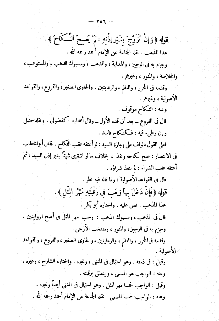 قَوْلُهُ (وَإِنْ تَزَوَّجَ بِغَيْرِ إذْنِهِ: لَمْ يَصِحَّ النِّكَاحُ) . هَذَا الْمَذْهَبُ. نَقَلَهُ الْجَمَاعَةُ عَنْ الْإِمَامِ أَحْمَدَ - رَحِمَهُ اللَّهُ -. وَجَزَمَ بِهِ فِي الْوَجِيزِ، وَالْهِدَايَةِ، وَالْمُذْهَبِ، وَمَسْبُوكِ الذَّهَبِ، وَالْمُسْتَوْعِبِ، وَالْخُلَاصَةِ، وَالْمُنَوِّرِ، وَغَيْرِهِمْ. وَقَدَّمَهُ فِي الْمُحَرَّرِ، وَالنَّظْمِ، وَالرِّعَايَتَيْنِ. وَالْحَاوِي الصَّغِيرِ، وَالْفُرُوعِ، وَالْقَوَاعِدِ الْأُصُولِيَّةِ، وَغَيْرِهِمْ. وَعَنْهُ: النِّكَاحُ مَوْقُوفٌ. قَالَ فِي الْفُرُوعِ بَعْدَ أَنْ قَدَّمَ الْأَوَّلَ وَقَالَ أَصْحَابُنَا: كَفُضُولِيٍّ. وَنَقَلَهُ حَنْبَلٌ وَإِنْ وَطِئَ فِيهِ: فَكَنِكَاحٍ فَاسِدٍ. فَعَلَى الْقَوْلِ بِالْوَقْفِ عَلَى إجَازَةِ السَّيِّدِ: لَوْ أَعْتَقَهُ عَقِبَ النِّكَاحِ. فَقَالَ أَبُو الْخَطَّابِ فِي الِانْتِصَارِ: صَحَّ نِكَاحُهُ وَنَفَذَ، بِخِلَافِ مَا لَوْ اشْتَرَى شَيْئًا بِغَيْرِ إذْنِ السَّيِّدِ، ثُمَّ أَعْتَقَهُ عَقِبَ الشِّرَاءِ: لَمْ يَنْفُذْ شِرَاؤُهُ. قَالَ فِي الْقَوَاعِدِ الْأُصُولِيَّةِ: وَمَا قَالَهُ فِيهِ نَظَرٌ. قَوْلُهُ (فَإِنْ دَخَلَ بِهَا وَجَبَ فِي رَقَبَتِهِ مَهْرُ الْمِثْلِ) . هَذَا الْمَذْهَبُ. نَصَّ عَلَيْهِ. وَاخْتَارَهُ أَبُو بَكْرٍ. قَالَ فِي الْمَذْهَبِ، وَمَسْبُوكِ الذَّهَبِ: وَجَبَ مَهْرُ الْمِثْلِ فِي أَصَحِّ الرِّوَايَتَيْنِ. وَجَزَمَ بِهِ فِي الْوَجِيزِ، وَالْمُنَوِّرِ، وَمُنْتَخَبِ الْأَزَجِيِّ. وَقَدَّمَهُ فِي الْمُحَرَّرِ، وَالنَّظْمِ، وَالرِّعَايَتَيْنِ، وَالْحَاوِي الصَّغِيرِ، وَالْفُرُوعِ، وَالْقَوَاعِدِ الْأُصُولِيَّةِ. وَقِيلَ: فِي ذِمَّتِهِ. وَهُوَ احْتِمَالٌ فِي الْمُغْنِي، وَغَيْرِهِ. وَاخْتَارَهُ الشَّارِحُ، وَغَيْرُهُ. وَعَنْهُ: الْوَاجِبُ هُوَ الْمُسَمَّى، وَيَتَعَلَّقُ بِرَقَبَتِهِ. وَقِيلَ: الْوَاجِبُ خُمُسَا مَهْرُ الْمِثْلِ. وَهُوَ احْتِمَالٌ فِي الْمُغْنِي أَيْضًا وَغَيْرِهِ. وَعَنْهُ: الْوَاجِبُ خُمُسَا الْمُسَمَّى. نَقَلَهُ الْجَمَاعَةُ عَنْ الْإِمَامِ أَحْمَدَ - رَحِمَهُ اللَّهُ -.