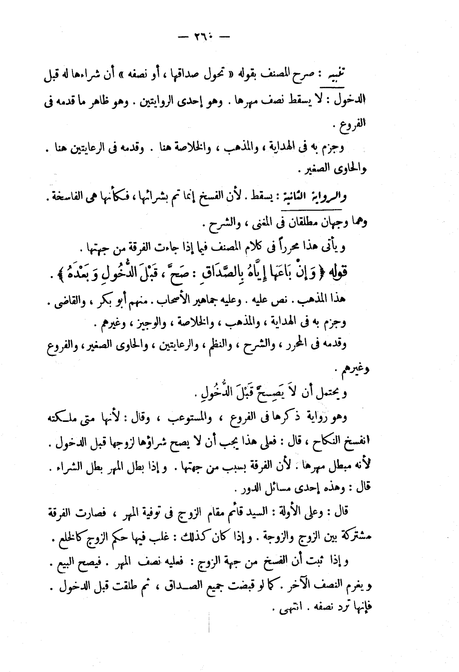 وَالرِّوَايَةُ الثَّانِيَةُ: يَسْقُطُ؛ لِأَنَّ الْفَسْخَ إنَّمَا تَمَّ بِشِرَائِهَا، فَكَأَنَّهَا هِيَ الْفَاسِخَةُ. وَهُمَا وَجْهَانِ مُطْلَقَانِ فِي الْمُغْنِي، وَالشَّرْحِ. وَيَأْتِي هَذَا مُحَرَّرًا فِي كَلَامِ الْمُصَنِّفِ فِيمَا إذَا جَاءَتْ الْفُرْقَةُ مِنْ جِهَتِهَا. قَوْلُهُ (وَإِنْ بَاعَهَا إيَّاهُ بِالصَّدَاقِ: صَحَّ، قَبْلَ الدُّخُولِ وَبَعْدَهُ) . هَذَا الْمَذْهَبُ. نَصَّ عَلَيْهِ. وَعَلَيْهِ جَمَاهِيرُ الْأَصْحَابِ. مِنْهُمْ أَبُو بَكْرٍ، وَالْقَاضِي. وَجَزَمَ بِهِ فِي الْهِدَايَةِ، وَالْمُذْهَبِ، وَالْخُلَاصَةِ، وَالْوَجِيزِ، وَغَيْرِهِمْ. وَقَدَّمَهُ فِي الْمُحَرَّرِ، وَالشَّرْحِ، وَالنَّظْمِ، وَالرِّعَايَتَيْنِ، وَالْحَاوِي الصَّغِيرِ، وَالْفُرُوعِ وَغَيْرِهِمْ. وَيُحْتَمَلُ أَنْ لَا يَصِحَّ قَبْلَ الدُّخُولِ. وَهُوَ رِوَايَةٌ ذَكَرَهَا فِي الْفُرُوعِ، وَالْمُسْتَوْعِبِ، وَقَالَ: لِأَنَّهَا مَتَى مَلَكَتْهُ انْفَسَخَ النِّكَاحُ، قَالَ: فَعَلَى هَذَا يَجِبُ أَنْ لَا يَصِحَّ شِرَاؤُهَا لِزَوْجِهَا قَبْلَ الدُّخُولِ؛ لِأَنَّهُ مُبْطِلٌ مَهْرَهَا؛ لِأَنَّ الْفُرْقَةَ بِسَبَبٍ مِنْ جِهَتِهَا. وَإِذَا بَطَلَ الْمَهْرُ بَطَلَ الشِّرَاءُ. قَالَ: وَهَذِهِ إحْدَى مَسَائِلِ الدَّوْرِ. قَالَ: وَعَلَى الْأَوَّلَةِ: السَّيِّدُ قَائِمٌ مَقَامَ الزَّوْجِ فِي تَوْفِيَةِ الْمَهْرِ، فَصَارَتْ الْفُرْقَةُ مُشْتَرَكَةً بَيْنَ الزَّوْجِ وَالزَّوْجَةِ. وَإِذَا كَانَ كَذَلِكَ: غَلَبَ فِيهَا حُكْمُ الزَّوْجِ كَالْخُلْعِ. وَإِذَا ثَبَتَ أَنَّ الْفَسْخَ مِنْ جِهَةِ الزَّوْجِ: فَعَلَيْهِ نِصْفُ الْمَهْرِ. فَيَصِحُّ الْبَيْعُ. وَيَغْرَمُ النِّصْفَ الْآخَرَ. كَمَا لَوْ قَبَضَتْ جَمِيعَ الصَّدَاقِ، ثُمَّ طَلُقَتْ قَبْلَ الدُّخُولِ؛ فَإِنَّهَا تَرُدُّ نِصْفَهُ. انْتَهَى.