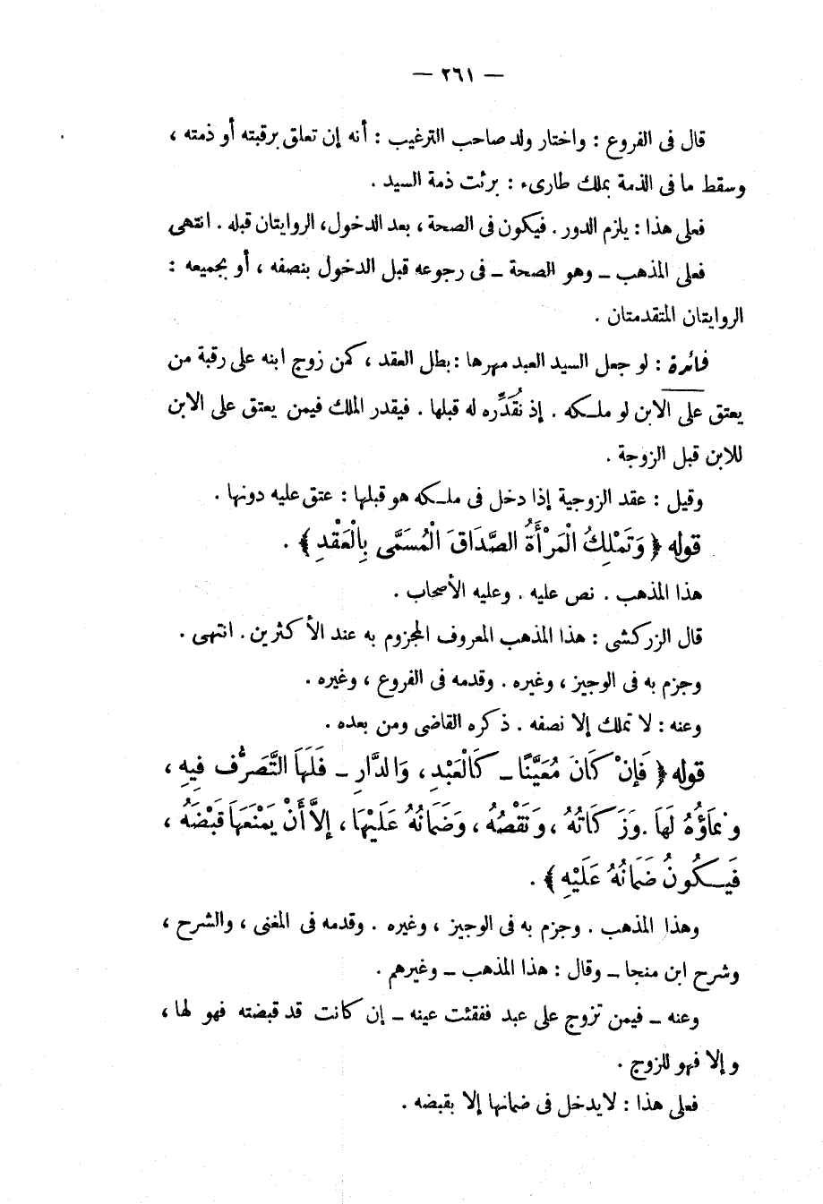 قَالَ فِي الْفُرُوعِ: وَاخْتَارَ وَلَدُ صَاحِبِ التَّرْغِيبِ: أَنَّهُ إنْ تَعَلَّقَ بِرَقَبَتِهِ أَوْ ذِمَّتِهِ، وَسَقَطَ مَا فِي الذِّمَّةِ بِمِلْكٍ طَارِئٍ: بَرِئَتْ ذِمَّةُ السَّيِّدِ. فَعَلَى هَذَا: يَلْزَمُ الدَّوْرُ. فَيَكُونُ فِي الصِّحَّةِ، بَعْدَ الدُّخُولِ، الرِّوَايَتَانِ قَبْلَهُ. انْتَهَى فَعَلَى الْمَذْهَبِ وَهُوَ الصِّحَّةُ فِي رُجُوعِهِ قَبْلَ الدُّخُولِ بِنِصْفِهِ، أَوْ بِجَمِيعِهِ: الرِّوَايَتَانِ الْمُتَقَدِّمَتَانِ.