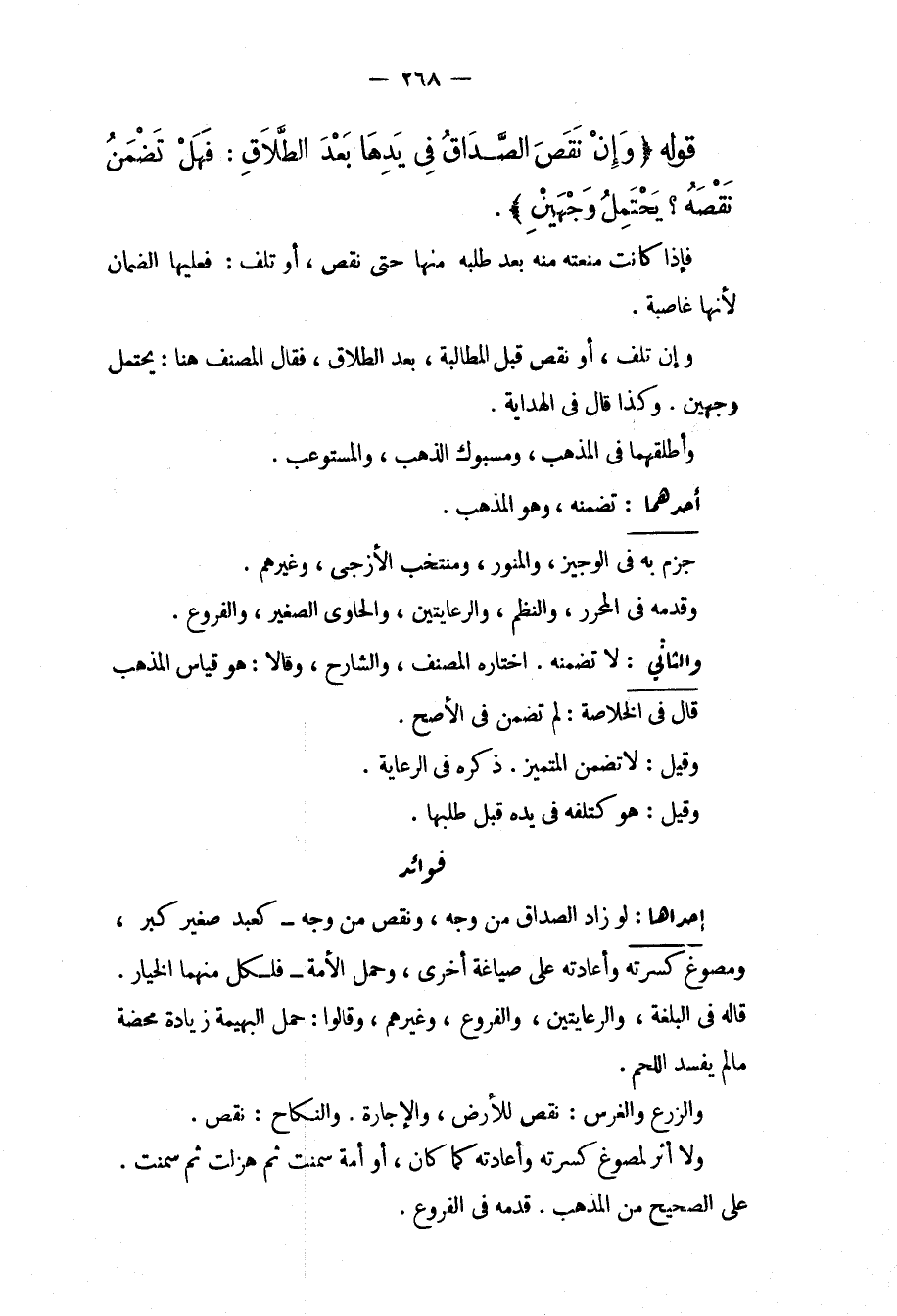 قَوْلُهُ (وَإِنْ نَقَصَ الصَّدَاقُ فِي يَدِهَا بَعْدَ الطَّلَاقِ: فَهَلْ تَضْمَنُ. نَقْصَهُ؟ يَحْتَمِلُ وَجْهَيْنِ) . فَإِذَا كَانَتْ مَنَعَتْهُ مِنْهُ بَعْدَ طَلَبِهِ مِنْهَا حَتَّى نَقَصَ، أَوْ تَلِفَ: فَعَلَيْهَا الضَّمَانُ لِأَنَّهَا غَاصِبَةٌ. وَإِنْ تَلِفَ، أَوْ نَقَصَ قَبْلَ الْمُطَالَبَةِ، بَعْدَ الطَّلَاقِ، فَقَالَ الْمُصَنِّفُ هُنَا: يَحْتَمِلُ وَجْهَيْنِ. وَكَذَا قَالَ فِي الْهِدَايَةِ. وَأَطْلَقَهُمَا فِي الْمُذْهَبِ، وَمَسْبُوكِ الذَّهَبِ، وَالْمُسْتَوْعِبِ.