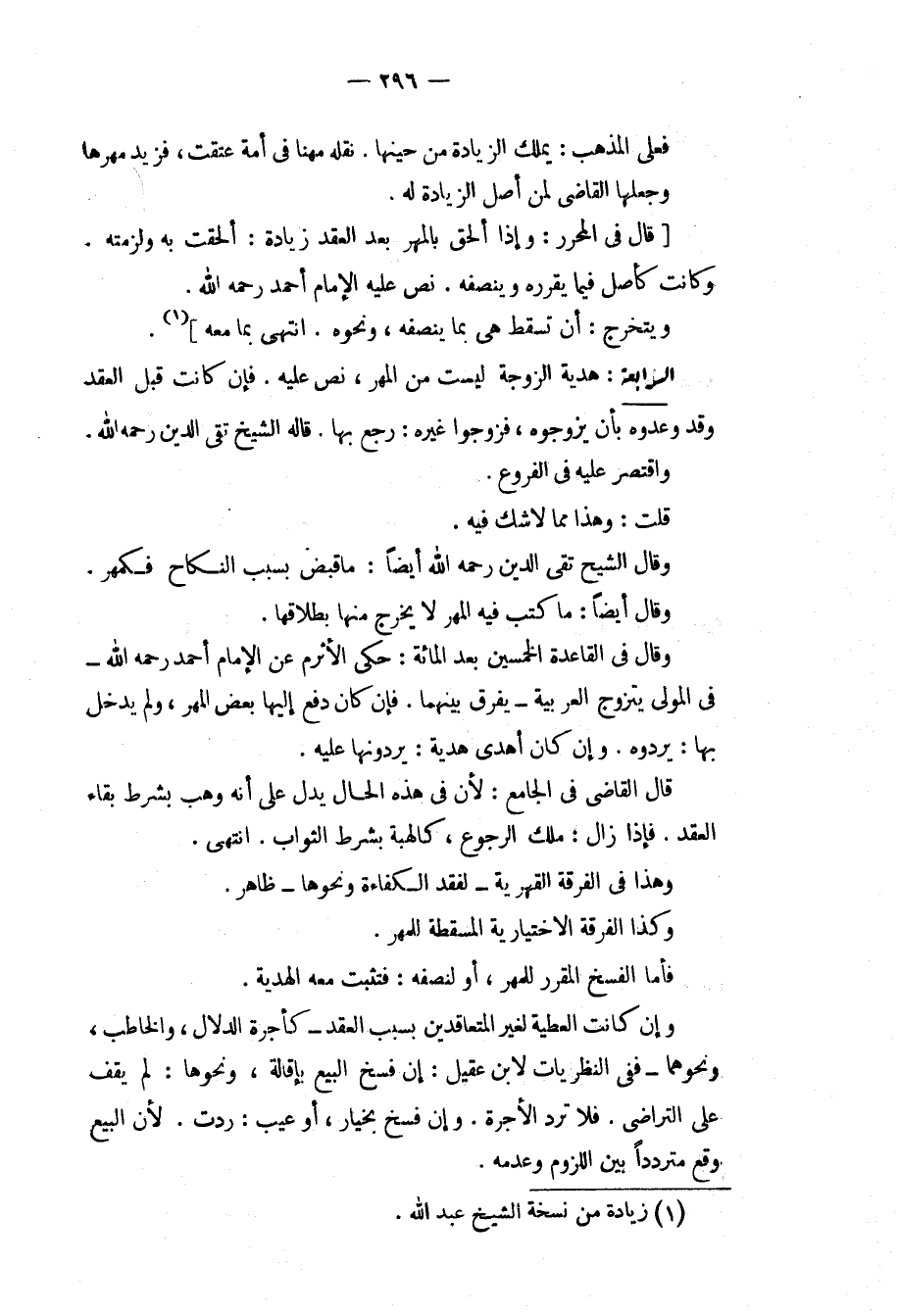 فَعَلَى الْمَذْهَبِ: يَمْلِكُ الزِّيَادَةَ مِنْ حِينِهَا. نَقَلَهُ مُهَنَّا فِي أَمَةٍ عَتَقَتْ، فَزِيدَ مَهْرُهَا وَجَعَلَهَا الْقَاضِي لِمَنْ أَصْلُ الزِّيَادَةِ لَهُ. [قَالَ فِي الْمُحَرَّرِ: وَإِذَا أُلْحِقَ بِالْمَهْرِ بَعْدَ الْعَقْدِ زِيَادَةٌ: أُلْحِقَتْ بِهِ وَلَزِمَتْهُ. وَكَانَتْ كَأَصْلٍ فِيمَا يُقَرِّرُهُ وَيُنَصِّفُهُ. نَصَّ عَلَيْهِ الْإِمَامُ أَحْمَدُ - رَحِمَهُ اللَّهُ -. وَيَتَخَرَّجُ: أَنْ تَسْقُطَ هِيَ بِمَا يُنَصِّفُهُ، وَنَحْوُهُ. انْتَهَى بِمَا مَعَهُ] .