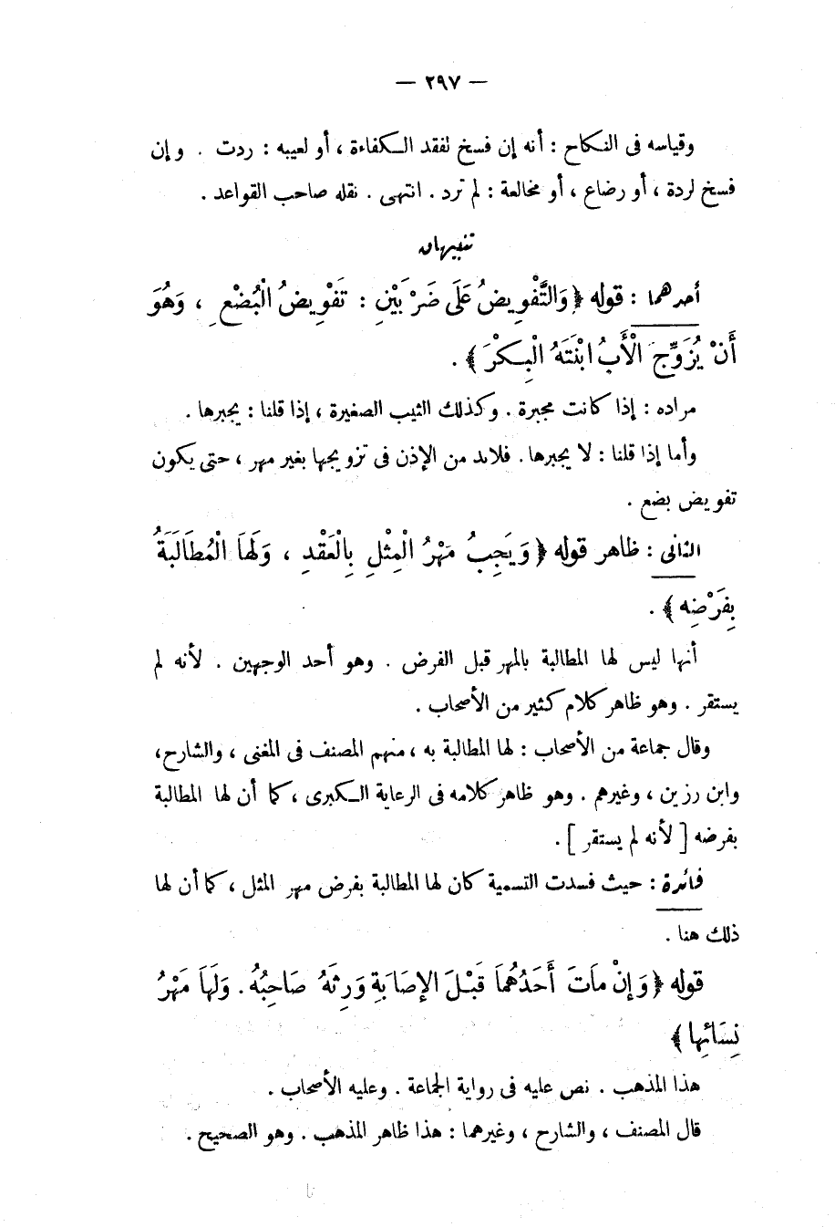 الثَّانِي: ظَاهِرُ قَوْلِهِ (وَيَجِبُ مَهْرُ الْمِثْلِ بِالْعَقْدِ، وَلَهَا الْمُطَالَبَةُ بِفَرْضِهِ) . أَنَّهَا لَيْسَ لَهَا الْمُطَالَبَةُ بِالْمَهْرِ قَبْلَ الْفَرْضِ. وَهُوَ أَحَدُ الْوَجْهَيْنِ؛ لِأَنَّهُ لَمْ يَسْتَقِرَّ. وَهُوَ ظَاهِرُ كَلَامِ كَثِيرٍ مِنْ الْأَصْحَابِ. وَقَالَ جَمَاعَةٌ مِنْ الْأَصْحَابِ: لَهَا الْمُطَالَبَةُ بِهِ، مِنْهُمْ الْمُصَنِّفُ فِي الْمُغْنِي، وَالشَّارِحُ، وَابْنُ رَزِينٍ، وَغَيْرُهُمْ. وَهُوَ ظَاهِرُ كَلَامِهِ فِي الرِّعَايَةِ الْكُبْرَى، كَمَا أَنَّ لَهَا الْمُطَالَبَةَ بِفَرْضِهِ [لِأَنَّهُ لَمْ يَسْتَقِرَّ] .