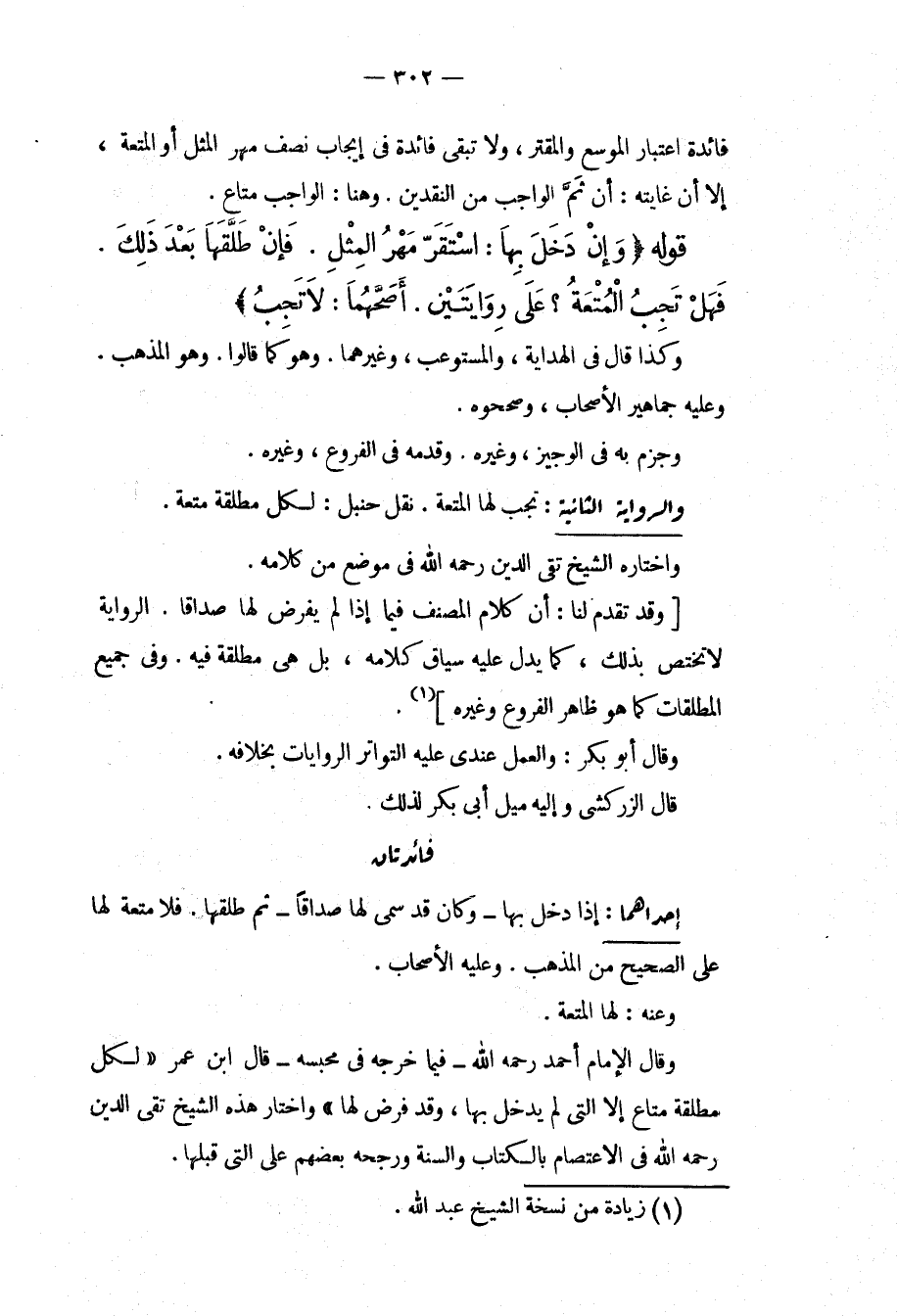إحْدَاهُمَا: إذَا دَخَلَ بِهَا وَكَانَ قَدْ سَمَّى لَهَا صَدَاقًا ثُمَّ طَلَّقَهَا. فَلَا مُتْعَةَ لَهَا عَلَى الصَّحِيحِ مِنْ الْمَذْهَبِ. وَعَلَيْهِ الْأَصْحَابُ. وَعَنْهُ: لَهَا الْمُتْعَةُ. وَقَالَ الْإِمَامُ أَحْمَدُ - رَحِمَهُ اللَّهُ - فِيمَا خَرَّجَهُ فِي مَحْبِسِهِ قَالَ ابْنُ عُمَرَ " لِكُلِّ مُطَلَّقَةٍ مَتَاعٌ إلَّا الَّتِي لَمْ يَدْخُلْ بِهَا، وَقَدْ فَرَضَ لَهَا " وَاخْتَارَ هَذِهِ الشَّيْخُ تَقِيُّ الدِّينِ - رَحِمَهُ اللَّهُ - فِي الِاعْتِصَامِ بِالْكِتَابِ وَالسُّنَّةِ وَرَجَّحَهُ بَعْضُهُمْ عَلَى الَّتِي قَبْلَهَا.