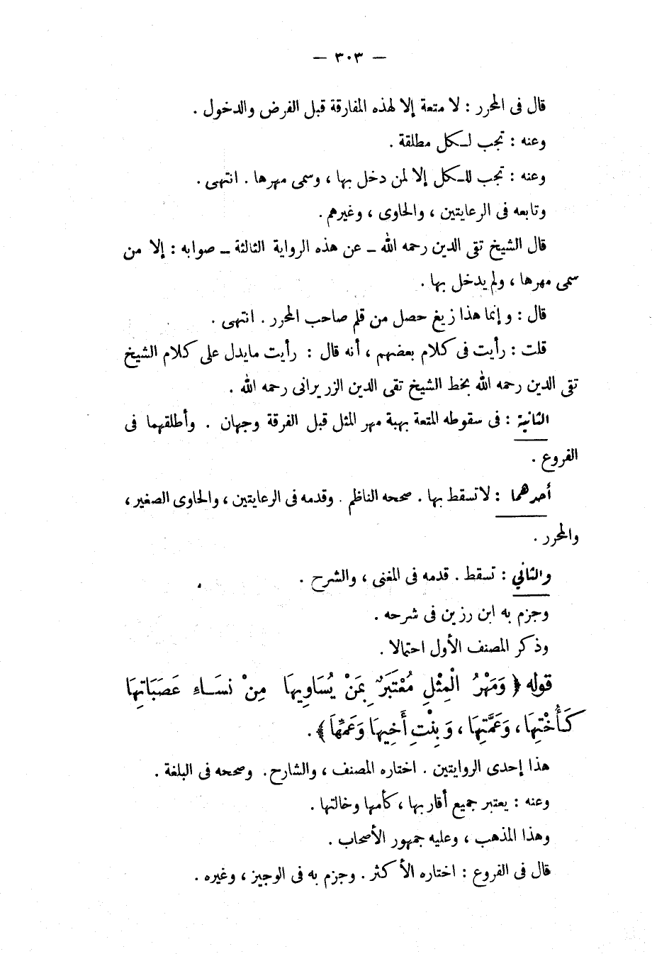 وَتَابَعَهُ فِي الرِّعَايَتَيْنِ، وَالْحَاوِي، وَغَيْرُهُمْ. قَالَ الشَّيْخُ تَقِيُّ الدِّينِ - رَحِمَهُ اللَّهُ - عَنْ هَذِهِ الرِّوَايَةِ الثَّالِثَةِ صَوَابُهُ: إلَّا مَنْ سَمَّى مَهْرَهَا، وَلَمْ يَدْخُلْ بِهَا. قَالَ: وَإِنَّمَا هَذَا زَيْغٌ حَصَلَ مِنْ قَلَمِ صَاحِبِ الْمُحَرَّرِ. انْتَهَى.