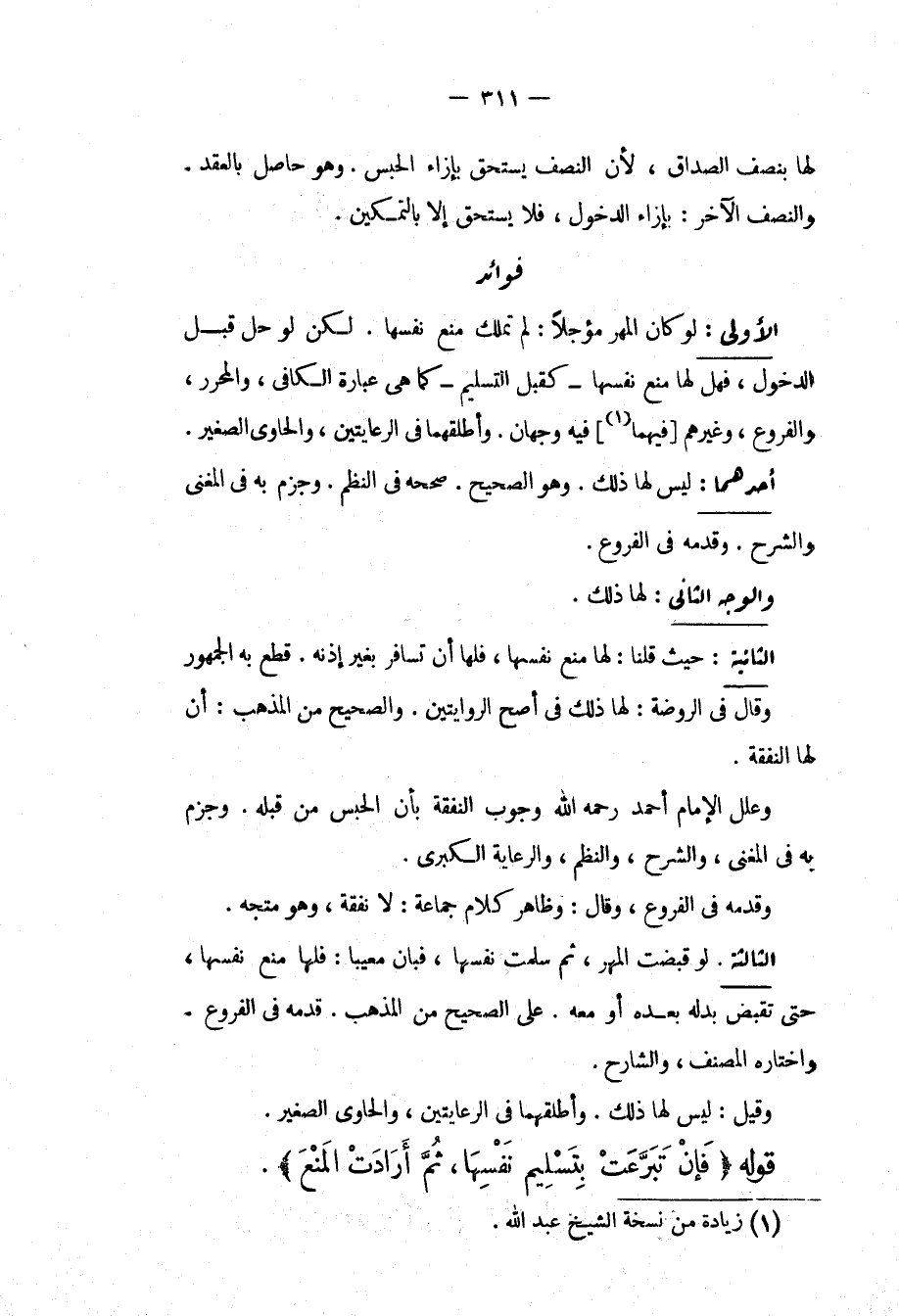 الْأُولَى: لَوْ كَانَ الْمَهْرُ مُؤَجَّلًا: لَمْ تَمْلِكْ مَنْعَ نَفْسِهَا. لَكِنْ لَوْ حَلَّ قَبْلَ الدُّخُولِ، فَهَلْ لَهَا مَنْعُ نَفْسِهَا كَقَبْلِ التَّسْلِيمِ كَمَا هِيَ عِبَارَةُ الْكَافِي، وَالْمُحَرَّرِ، وَالْفُرُوعِ، وَغَيْرِهِمْ [فِيهِمَا] فِيهِ وَجْهَانِ. وَأَطْلَقَهُمَا فِي الرِّعَايَتَيْنِ، وَالْحَاوِي الصَّغِيرِ: