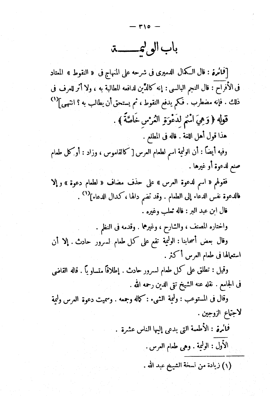 قَالَ الْكَمَالُ الدَّمِيرِيُّ فِي شَرْحِهِ عَلَى الْمِنْهَاجِ فِي " النُّقُوطِ " الْمُعْتَادِ فِي الْأَفْرَاحِ: قَالَ النَّجْمُ الْبَالِسِيُّ: إنَّهُ كَالدَّيْنِ لِدَافِعِهِ الْمُطَالَبَةُ بِهِ، وَلَا أَثَرَ لِلْعُرْفِ فِي ذَلِكَ. فَإِنَّهُ مُضْطَرِبٌ. فَكَمْ يَدْفَعُ النُّقُوطَ، ثُمَّ يَسْتَحِقُّ أَنْ يُطَالِبَ بِهِ؟ انْتَهَى قَوْلُهُ (وَهِيَ اسْمٌ لِدَعْوَةِ الْعُرْسِ خَاصَّةً) . هَذَا قَوْلُ أَهْلِ اللُّغَةِ. قَالَهُ فِي الْمَطْلَعِ. وَفِيهِ أَيْضًا: أَنَّ الْوَلِيمَةَ اسْمٌ لِطَعَامِ الْعُرْسِ كَالْقَامُوسِ، وَزَادَ: أَوْ كُلُّ طَعَامٍ صُنِعَ لِدَعْوَةٍ أَوْ غَيْرِهَا. فَقَوْلُهُمْ " اسْمٌ لِدَعْوَةِ الْعُرْسِ " عَلَى حَذْفِ مُضَافٍ " لِطَعَامِ دَعْوَةٍ " وَإِلَّا فَالدَّعْوَةُ نَفْسُ الدُّعَاءِ إلَى الطَّعَامِ. وَقَدْ تُضَمُّ دَالُهَا، كَدَالِ الدُّعَاءِ. قَالَ ابْنُ عَبْدِ الْبَرِّ: قَالَهُ ثَعْلَبٌ وَغَيْرُهُ. وَاخْتَارَهُ الْمُصَنِّفُ، وَالشَّارِحُ، وَغَيْرُهُمَا. وَقَدَّمَهُ فِي النَّظْمِ. وَقَالَ بَعْضُ أَصْحَابِنَا: الْوَلِيمَةُ تَقَعُ عَلَى كُلِّ طَعَامٍ لِسُرُورٍ حَادِثٍ. إلَّا أَنَّ اسْتِعْمَالَهَا فِي طَعَامِ الْعُرْسِ أَكْثَرُ. وَقِيلَ: تُطْلَقُ عَلَى كُلِّ طَعَامٍ لِسُرُورٍ حَادِثٍ. إطْلَاقًا مُتَسَاوِيًا. قَالَهُ الْقَاضِي فِي الْجَامِعِ. نَقَلَهُ عَنْهُ الشَّيْخُ تَقِيُّ الدِّينِ - رَحِمَهُ اللَّهُ -. وَقَالَ فِي الْمُسْتَوْعِبِ: وَلِيمَةُ الشَّيْءِ: كَمَالُهُ وَجَمْعُهُ. وَسُمِّيَتْ دَعْوَةُ الْعُرْسِ وَلِيمَةً لِاجْتِمَاعِ الزَّوْجَيْنِ.