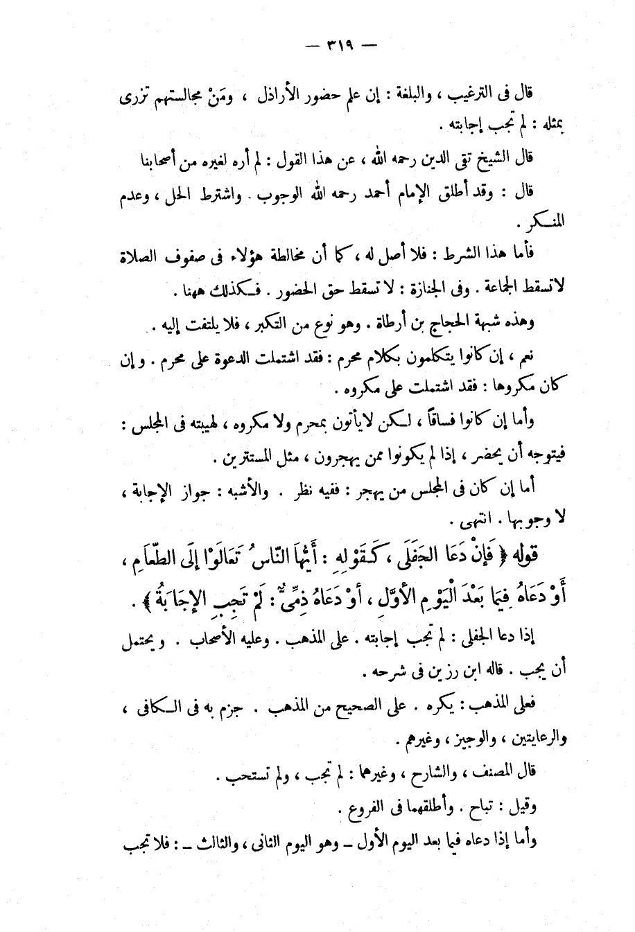 قَالَ فِي التَّرْغِيبِ، وَالْبُلْغَةِ: إنْ عَلِمَ حُضُورَ الْأَرَاذِلِ، وَمَنْ مُجَالَسَتُهُمْ تُزْرِي بِمِثْلِهِ: لَمْ تَجِبْ إجَابَتُهُ. قَالَ الشَّيْخُ تَقِيُّ الدِّينِ - رَحِمَهُ اللَّهُ -، عَنْ هَذَا الْقَوْلِ: لَمْ أَرَهُ لِغَيْرِهِ مِنْ أَصْحَابِنَا قَالَ: وَقَدْ أَطْلَقَ الْإِمَامُ أَحْمَدُ - رَحِمَهُ اللَّهُ - الْوُجُوبَ. وَاشْتَرَطَ الْحِلَّ، وَعَدَمَ الْمُنْكَرِ. فَأَمَّا هَذَا الشَّرْطُ: فَلَا أَصْلَ لَهُ كَمَا أَنَّ مُخَالَطَةَ هَؤُلَاءِ فِي صُفُوفِ الصَّلَاةِ لَا تُسْقِطُ الْجَمَاعَةَ. وَفِي الْجِنَازَةِ: لَا تُسْقِطُ حَقَّ الْحُضُورِ. فَكَذَلِكَ هَاهُنَا. وَهَذِهِ شُبْهَةُ الْحَجَّاجِ بْنِ أَرْطَاةَ. هُوَ نَوْعٌ مِنْ التَّكَبُّرِ، فَلَا يُلْتَفَتُ إلَيْهِ. نَعَمْ، إنْ كَانُوا يَتَكَلَّمُونَ بِكَلَامٍ مُحَرَّمٍ: فَقَدْ اشْتَمَلَتْ الدَّعْوَةُ عَلَى مُحَرَّمٍ. وَإِنْ كَانَ مَكْرُوهًا: فَقَدْ اشْتَمَلَتْ عَلَى مَكْرُوهٍ. وَأَمَّا إنْ كَانُوا فُسَّاقًا، لَكِنْ لَا يَأْتُونَ بِمُحَرَّمٍ وَلَا مَكْرُوهٍ، لِهَيْبَتِهِ فِي الْمَجْلِسِ: فَيَتَوَجَّهُ أَنْ يَحْضُرَ، إذَا لَمْ يَكُونُوا مَنْ يُهْجَرُونَ، مِثْلَ الْمُسْتَتِرِينَ. أَمَّا إنْ كَانَ فِي الْمَجْلِسِ مَنْ يُهْجَرُ: فَفِيهِ نَظَرٌ. وَالْأَشْبَهُ: جَوَازُ الْإِجَابَةِ، لَا وُجُوبُهَا. انْتَهَى.