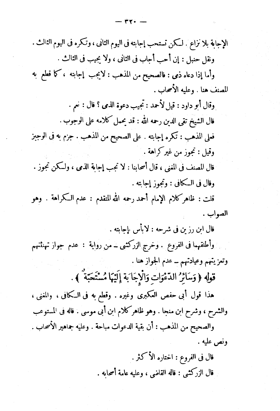 قَوْلُهُ (وَسَائِرُ الدَّعَوَاتِ وَالْإِجَابَةُ إلَيْهَا مُسْتَحَبَّةٌ) . هَذَا قَوْلُ أَبِي حَفْصٍ الْعُكْبَرِيِّ وَغَيْرِهِ. وَقَطَعَ بِهِ فِي الْكَافِي، وَالْمُغْنِي، وَالشَّرْحِ، وَشَرْحِ ابْنِ مُنَجَّا وَهُوَ ظَاهِرُ كَلَامِ ابْنِ أَبِي مُوسَى. قَالَهُ فِي الْمُسْتَوْعِبِ وَالصَّحِيحُ مِنْ الْمَذْهَبِ: أَنَّ بَقِيَّةَ الدَّعَوَاتِ مُبَاحَةٌ. وَعَلَيْهِ جَمَاهِيرُ الْأَصْحَابِ. وَنَصَّ عَلَيْهِ. قَالَ فِي الْفُرُوعِ: اخْتَارَهُ الْأَكْثَرُ. قَالَ الزَّرْكَشِيُّ: قَالَهُ الْقَاضِي، وَعَلَيْهِ عَامَّةُ أَصْحَابِهِ.