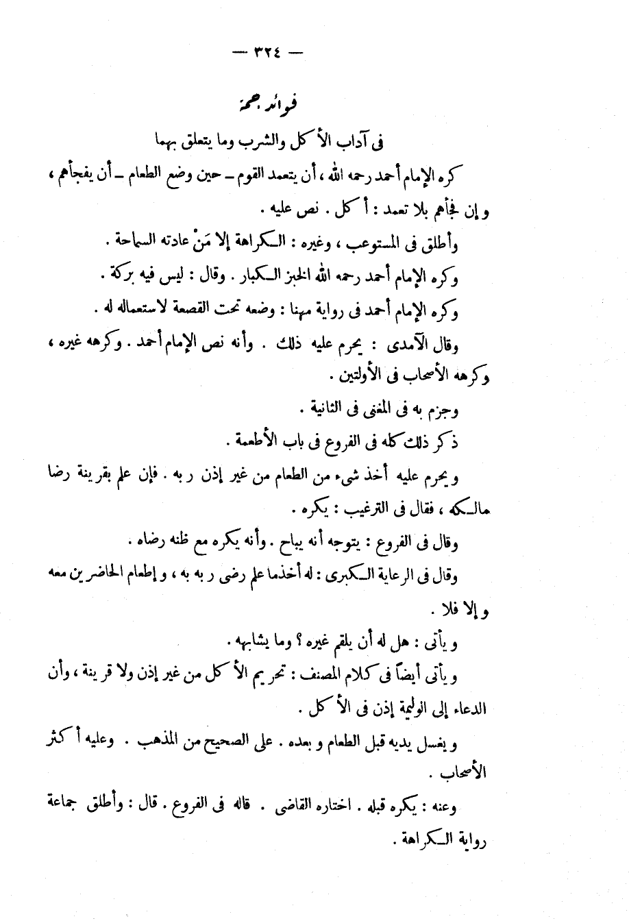 ِ وَمَا يَتَعَلَّقُ بِهِمَا كَرِهَ الْإِمَامُ أَحْمَدُ - رَحِمَهُ اللَّهُ -، أَنْ يَتَعَمَّدَ الْقَوْمُ حِينَ وَضْعِ الطَّعَامِ أَنْ يَفْجَأَهُمْ، وَإِنْ فَجَأَهُمْ بِلَا تَعَمُّدٍ: أَكَلَ. نَصَّ عَلَيْهِ. وَأَطْلَقَ فِي الْمُسْتَوْعِبِ، وَغَيْرِهِ: الْكَرَاهَةَ إلَّا مَنْ عَادَتُهُ السَّمَاحَةُ. وَكَرِهَ الْإِمَامُ أَحْمَدُ - رَحِمَهُ اللَّهُ - الْخُبْزَ الْكِبَارَ. وَقَالَ: لَيْسَ فِيهِ بَرَكَةٌ. وَكَرِهَ الْإِمَامُ أَحْمَدُ فِي رِوَايَةِ مُهَنَّا: وَضْعَهُ تَحْتَ الْقَصْعَةِ لِاسْتِعْمَالِهِ لَهُ. وَقَالَ الْآمِدِيُّ: يَحْرُمُ عَلَيْهِ ذَلِكَ. وَأَنَّهُ نَصُّ الْإِمَامِ أَحْمَدَ. وَكَرِهَهُ غَيْرُهُ، وَكَرِهَهُ الْأَصْحَابُ فِي الْأُولَتَيْنِ. وَجَزَمَ بِهِ فِي الْمُغْنِي فِي الثَّانِيَةِ. ذَكَرَ ذَلِكَ كُلَّهُ فِي الْفُرُوعِ فِي بَابِ الْأَطْعِمَةِ. وَيَحْرُمُ عَلَيْهِ أَخْذُ شَيْءٍ مِنْ الطَّعَامِ مِنْ غَيْرِ إذْنِ رَبِّهِ. فَإِنْ عَلِمَ بِقَرِينَةٍ رِضَا مَالِكِهِ، فَقَالَ فِي التَّرْغِيبِ: يُكْرَهُ. وَقَالَ فِي الْفُرُوعِ: يَتَوَجَّهُ أَنَّهُ يُبَاحُ. وَأَنَّهُ يُكْرَهُ مَعَ ظَنِّهِ رِضَاهُ. وَقَالَ فِي الرِّعَايَةِ الْكُبْرَى: لَهُ أَخْذُ مَا عَلِمَ رِضَى رَبِّهِ بِهِ، وَإِطْعَامُ الْحَاضِرِينَ مَعَهُ وَإِلَّا فَلَا. وَيَأْتِي: هَلْ لَهُ أَنْ يُلَقِّمَ غَيْرَهُ؟ وَمَا يُشَابِهُهُ. وَيَأْتِي أَيْضًا فِي كَلَامِ الْمُصَنِّفِ: تَحْرِيمُ الْأَكْلِ مِنْ غَيْرِ إذْنٍ وَلَا قَرِينَةٍ، وَأَنَّ الدُّعَاءَ إلَى الْوَلِيمَةِ إذْنٌ فِي الْأَكْلِ. وَيَغْسِلُ يَدَيْهِ قَبْلَ الطَّعَامِ وَبَعْدَهُ. عَلَى الصَّحِيحِ مِنْ الْمَذْهَبِ. وَعَلَيْهِ أَكْثَرُ الْأَصْحَابِ. وَعَنْهُ: يُكْرَهُ قَبْلَهُ. اخْتَارَهُ الْقَاضِي. قَالَهُ فِي الْفُرُوعِ. قَالَ: وَأَطْلَقَ جَمَاعَةٌ رِوَايَةَ الْكَرَاهَةِ.