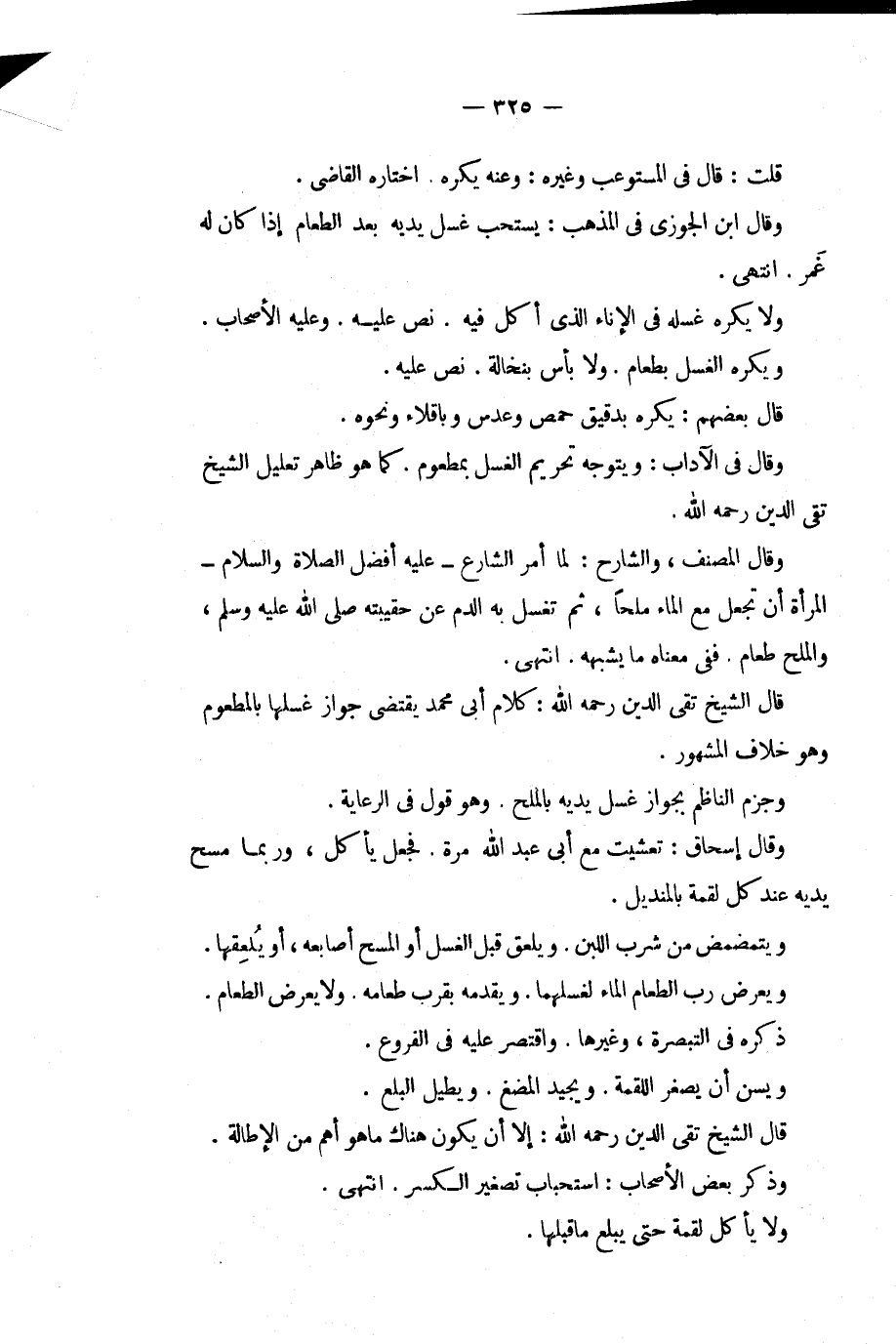 قُلْت: قَالَ فِي الْمُسْتَوْعِبِ وَغَيْرِهِ: وَعَنْهُ يُكْرَهُ اخْتَارَهُ الْقَاضِي. وَقَالَ ابْنُ الْجَوْزِيِّ فِي الْمَذْهَبِ: يُسْتَحَبُّ غَسْلُ يَدَيْهِ بَعْدَ الطَّعَامِ إذَا كَانَ لَهُ غَمْرٌ. انْتَهَى.