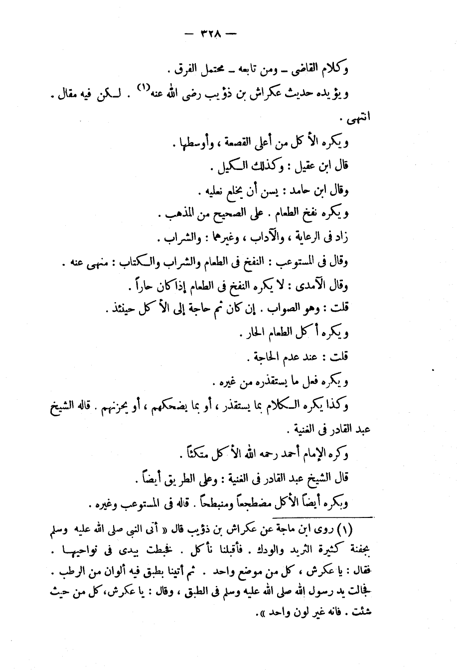 وَيُكْرَهُ الْأَكْلُ مِنْ أَعْلَى الْقَصْعَةِ، وَأَوْسَطِهَا. قَالَ ابْنُ عَقِيلٍ: وَكَذَلِكَ الْكَيْلُ. وَقَالَ ابْنُ حَامِدٍ: يُسَنُّ أَنْ يَخْلَعَ نَعْلَيْهِ. وَيُكْرَهُ نَفْخُ الطَّعَامِ. عَلَى الصَّحِيحِ مِنْ الْمَذْهَبِ. زَادَ فِي الرِّعَايَةِ، وَالْآدَابِ، وَغَيْرِهِمَا: وَالشَّرَابِ. وَقَالَ فِي الْمُسْتَوْعِبِ: النَّفْخُ فِي الطَّعَامِ وَالشَّرَابِ وَالْكِتَابِ: مَنْهِيٌّ عَنْهُ. وَقَالَ الْآمِدِيُّ: لَا يُكْرَهُ النَّفْخُ فِي الطَّعَامِ إذَا كَانَ حَارًّا. قُلْت: وَهُوَ الصَّوَابُ. إنْ كَانَ ثَمَّ حَاجَةٌ إلَى الْأَكْلِ حِينَئِذٍ. وَيُكْرَهُ أَكْلُ الطَّعَامِ الْحَارِّ. قُلْت: عِنْدَ عَدَمِ الْحَاجَةِ. وَيُكْرَهُ فِعْلُ مَا يَسْتَقْذِرُهُ مِنْ غَيْرِهِ. وَكَذَا يُكْرَهُ الْكَلَامُ بِمَا يُسْتَقْذَرُ، أَوْ بِمَا يُضْحِكُهُمْ، أَوْ يُحْزِنُهُمْ. قَالَهُ الشَّيْخُ عَبْدُ الْقَادِرِ فِي الْغُنْيَةِ. وَكَرِهَ الْإِمَامُ أَحْمَدُ - رَحِمَهُ اللَّهُ - الْأَكْلَ مُتَّكِئًا. قَالَ الشَّيْخُ عَبْدُ الْقَادِرِ فِي الْغُنْيَةِ: وَعَلَى الطَّرِيقِ أَيْضًا. وَيُكْرَهُ أَيْضًا الْأَكْلُ مُضْطَجِعًا وَمُنْبَطِحًا. قَالَهُ فِي الْمُسْتَوْعِبِ وَغَيْرِهِ.