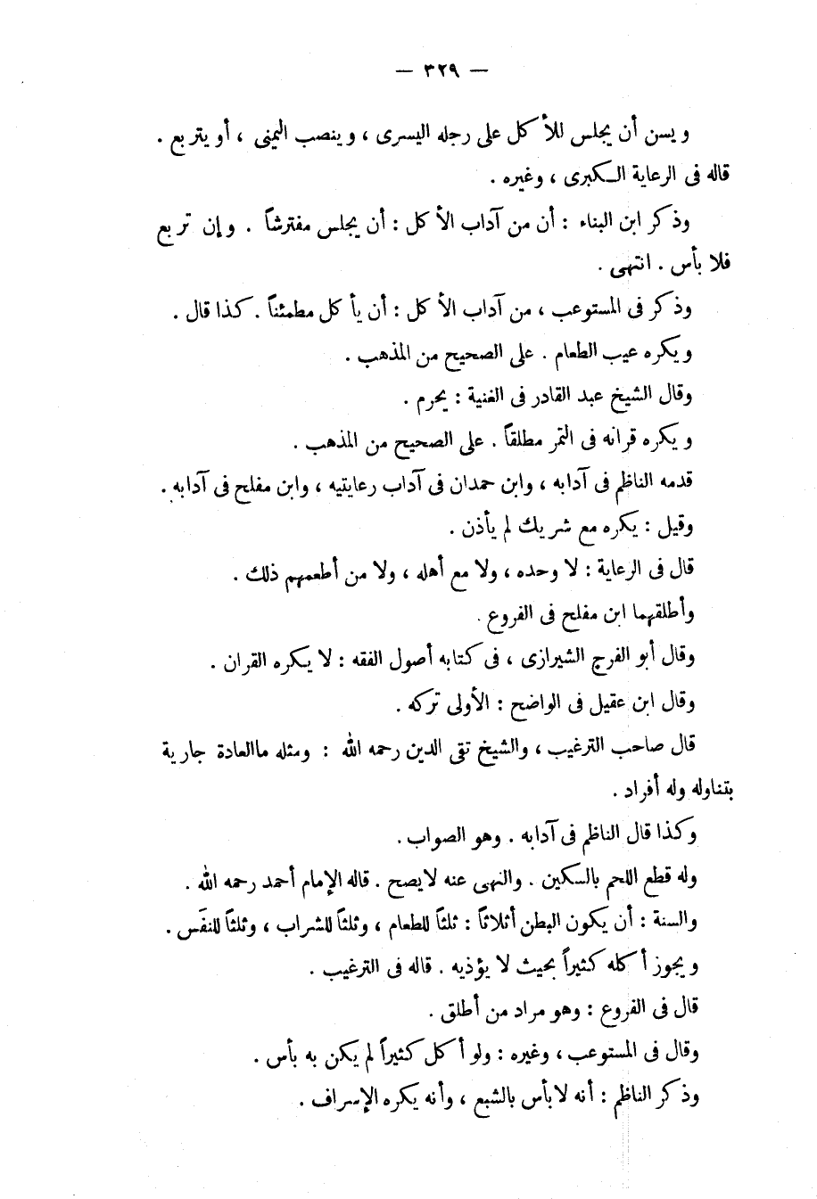 وَذَكَرَ فِي الْمُسْتَوْعِبِ، مِنْ آدَابِ الْأَكْلِ: أَنْ يَأْكُلَ مُطْمَئِنًّا. كَذَا قَالَ. وَيُكْرَهُ عَيْبُ الطَّعَامِ. عَلَى الصَّحِيحِ مِنْ الْمَذْهَبِ. وَقَالَ الشَّيْخُ عَبْدُ الْقَادِرِ فِي الْغُنْيَةِ: يَحْرُمُ. وَيُكْرَهُ قِرَانُهُ فِي التَّمْرِ مُطْلَقًا. عَلَى الصَّحِيحِ مِنْ الْمَذْهَبِ. قَدَّمَهُ النَّاظِمُ فِي آدَابِهِ، وَابْنُ حَمْدَانَ فِي آدَابِ رِعَايَتَيْهِ، وَابْنُ مُفْلِحٍ فِي آدَابِهِ. وَقِيلَ: يُكْرَهُ مَعَ شَرِيكٍ لَمْ يَأْذَنْ. قَالَ فِي الرِّعَايَةِ: لَا وَحْدَهُ، وَلَا مَعَ أَهْلِهِ، وَلَا مَنْ أَطْعَمَهُمْ ذَلِكَ. وَأَطْلَقَهُمَا ابْنُ مُفْلِحٍ فِي الْفُرُوعِ. وَقَالَ أَبُو الْفَرَجِ الشِّيرَازِيُّ، فِي كِتَابِهِ أُصُولِ الْفِقْهِ: لَا يُكْرَهُ الْقِرَانُ. وَقَالَ ابْنُ عَقِيلٍ فِي الْوَاضِحِ: الْأَوْلَى تَرْكُهُ. قَالَ صَاحِبُ التَّرْغِيبِ، وَالشَّيْخُ تَقِيُّ الدِّينِ - رَحِمَهُ اللَّهُ -: وَمِثْلُهُ مَا الْعَادَةُ جَارِيَةٌ بِتَنَاوُلِهِ وَلَهُ أَفْرَادٌ. وَكَذَا قَالَ النَّاظِمُ فِي آدَابِهِ. وَهُوَ الصَّوَابُ. وَلَهُ قَطْعُ اللَّحْمِ بِالسِّكِّينِ. وَالنَّهْيُ عَنْهُ لَا يَصِحُّ. قَالَهُ الْإِمَامُ أَحْمَدُ - رَحِمَهُ اللَّهُ -. وَالسُّنَّةُ: أَنْ يَكُونَ الْبَطْنُ أَثْلَاثًا: ثُلُثًا لِلطَّعَامِ، وَثُلُثًا لِلشَّرَابِ، وَثُلُثًا لِلنَّفَسِ. وَيَجُوزُ أَكْلُهُ كَثِيرًا بِحَيْثُ لَا يُؤْذِيهِ. قَالَهُ فِي التَّرْغِيبِ. قَالَ فِي الْفُرُوعِ: وَهُوَ مُرَادُ مَنْ أَطْلَقَ. وَقَالَ فِي الْمُسْتَوْعِبِ، وَغَيْرِهِ: وَلَوْ أَكَلَ كَثِيرًا لَمْ يَكُنْ بِهِ بَأْسٌ. وَذَكَرَ النَّاظِمُ: أَنَّهُ لَا بَأْسَ بِالشِّبَعِ، وَأَنَّهُ يُكْرَهُ الْإِسْرَافُ.