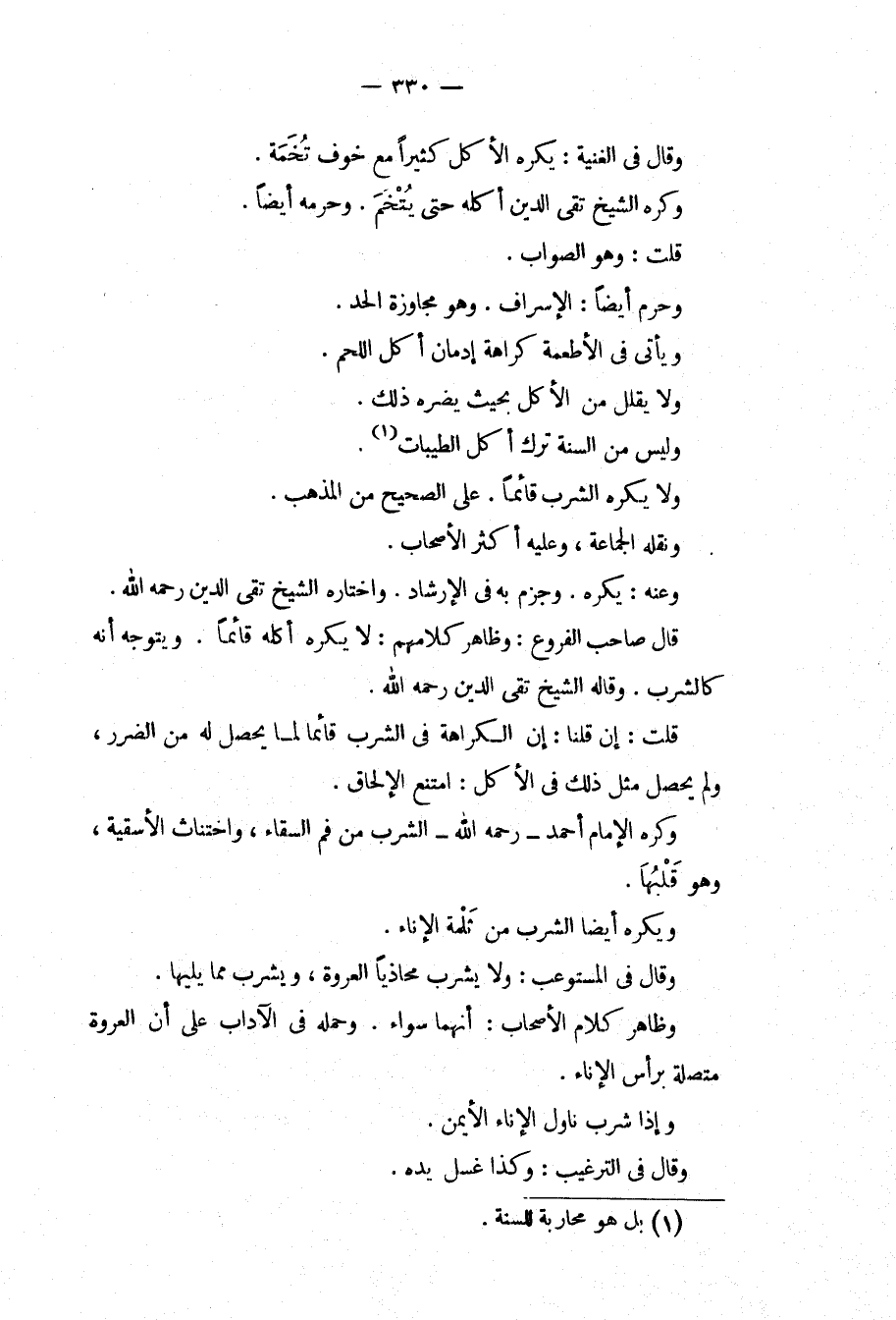وَقَالَ فِي الْغُنْيَةِ: يُكْرَهُ الْأَكْلُ كَثِيرًا مَعَ خَوْفِ تُخَمَةٍ. وَكَرِهَ الشَّيْخُ تَقِيُّ الدِّينِ أَكْلَهُ حَتَّى يُتْخَمَ. وَحَرَّمَهُ أَيْضًا. قُلْت: وَهُوَ الصَّوَابُ. وَحَرَّمَ أَيْضًا: الْإِسْرَافَ. وَهُوَ مُجَاوَزَةُ الْحَدِّ. وَيَأْتِي فِي الْأَطْعِمَةِ كَرَاهَةُ إدْمَانِ أَكْلِ اللَّحْمِ. وَلَا يُقَلِّلُ مِنْ الْأَكْلِ بِحَيْثُ يَضُرُّهُ ذَلِكَ. وَلَيْسَ مِنْ السُّنَّةِ تَرْكُ أَكْلِ الطَّيِّبَاتِ. وَلَا يُكْرَهُ الشُّرْبُ قَائِمًا. عَلَى الصَّحِيحِ مِنْ الْمَذْهَبِ. وَنَقَلَهُ الْجَمَاعَةُ، وَعَلَيْهِ أَكْثَرُ الْأَصْحَابِ. وَعَنْهُ: يُكْرَهُ. وَجَزَمَ بِهِ فِي الْإِرْشَادِ. وَاخْتَارَهُ الشَّيْخُ تَقِيُّ الدِّينِ - رَحِمَهُ اللَّهُ -. قَالَ صَاحِبُ الْفُرُوعِ: وَظَاهِرُ كَلَامِهِمْ: لَا يُكْرَهُ أَكْلُهُ قَائِمًا. وَيَتَوَجَّهُ أَنَّهُ كَالشُّرْبِ. وَقَالَهُ الشَّيْخُ تَقِيُّ الدِّينِ - رَحِمَهُ اللَّهُ -. قُلْت: إنْ قُلْنَا: إنَّ الْكَرَاهَةَ فِي الشُّرْبِ قَائِمًا لِمَا يَحْصُلُ لَهُ مِنْ الضَّرَرِ، وَلَمْ يَحْصُلْ مِثْلُ ذَلِكَ فِي الْأَكْلِ: امْتَنَعَ الْإِلْحَاقُ. وَكَرِهَ الْإِمَامُ أَحْمَدُ - رَحِمَهُ اللَّهُ - الشُّرْبَ مِنْ فَمِ السِّقَاءِ، وَاخْتِنَاثِ الْأَسْقِيَةِ، وَهُوَ قَلْبُهَا. وَيُكْرَهُ أَيْضًا الشُّرْبُ مِنْ ثُلْمَةِ الْإِنَاءِ. وَقَالَ فِي الْمُسْتَوْعِبِ: وَلَا يَشْرَبُ مُحَاذِيًا الْعُرْوَةَ، وَيَشْرَبُ مِمَّا يَلِيهَا. وَظَاهِرُ كَلَامِ الْأَصْحَابِ: أَنَّهُمَا سَوَاءٌ. وَحَمَلَهُ فِي الْآدَابِ عَلَى أَنَّ الْعُرْوَةَ مُتَّصِلَةٌ بِرَأْسِ الْإِنَاءِ. وَإِذَا شَرِبَ نَاوَلَ الْإِنَاءَ الْأَيْمَنَ. وَقَالَ فِي التَّرْغِيبِ: وَكَذَا غَسْلُ يَدِهِ.
