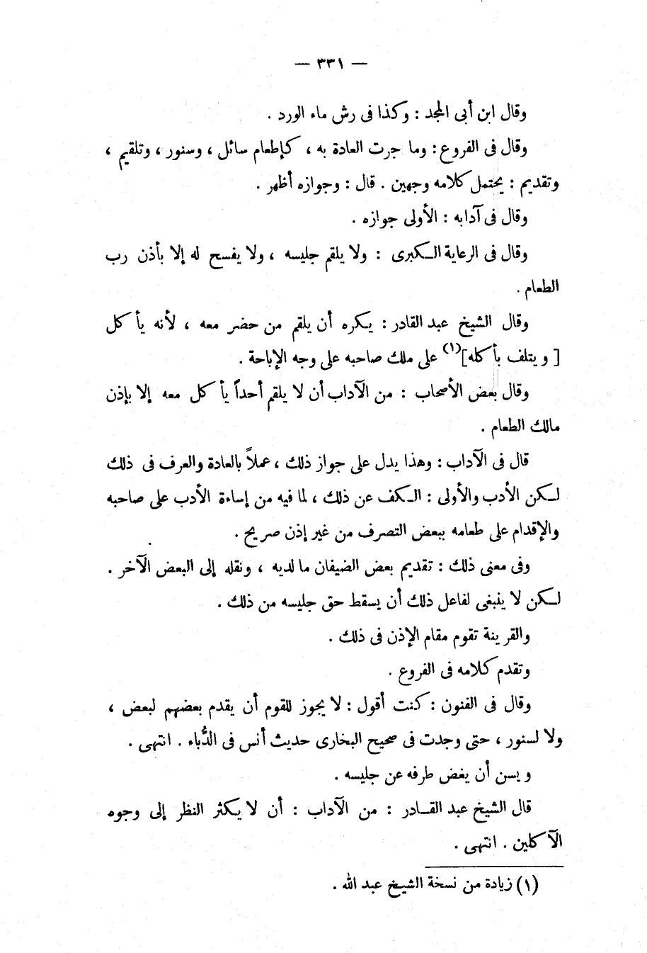 وَقَالَ ابْنُ أَبِي الْمَجْدِ: وَكَذَا فِي رَشِّ مَاءِ الْوَرْدِ. وَقَالَ فِي الْفُرُوعِ: وَمَا جَرَتْ الْعَادَةُ بِهِ، كَإِطْعَامِ سَائِلٍ، وَسِنَّوْرٍ، وَتَلْقِيمٍ، وَتَقْدِيمٍ: يَحْتَمِلُ كَلَامُهُ وَجْهَيْنِ. قَالَ: وَجَوَازُهُ أَظْهَرُ. وَقَالَ فِي آدَابِهِ: الْأَوْلَى جَوَازُهُ. وَقَالَ فِي الرِّعَايَةِ الْكُبْرَى: وَلَا يُلْقِمُ جَلِيسَهُ، وَلَا يُفْسِحُ لَهُ إلَّا بِإِذْنِ رَبِّ الطَّعَامِ. وَقَالَ الشَّيْخُ عَبْدُ الْقَادِرِ: يُكْرَهُ أَنْ يُلْقِمَ مَنْ حَضَرَ مَعَهُ، لِأَنَّهُ يَأْكُلُ [وَيَتْلَفُ بِأَكْلِهِ] عَلَى مِلْكِ صَاحِبِهِ عَلَى وَجْهِ الْإِبَاحَةِ. وَقَالَ بَعْضُ الْأَصْحَابِ: مِنْ الْآدَابِ أَنْ لَا يُلْقِمَ أَحَدًا يَأْكُلُ مَعَهُ إلَّا بِإِذْنِ مَالِكِ الطَّعَامِ. قَالَ فِي الْآدَابِ: وَهَذَا يَدُلُّ عَلَى جَوَازِ ذَلِكَ، عَمَلًا بِالْعَادَةِ وَالْعُرْفِ فِي ذَلِكَ لَكِنَّ الْأَدَبَ وَالْأَوْلَى: الْكَفُّ عَنْ ذَلِكَ، لِمَا فِيهِ مِنْ إسَاءَةِ الْأَدَبِ عَلَى صَاحِبِهِ وَالْإِقْدَامِ عَلَى طَعَامِهِ بِبَعْضِ التَّصَرُّفِ مِنْ غَيْرِ إذْنٍ صَرِيحٍ. وَفِي مَعْنَى ذَلِكَ: تَقْدِيمُ بَعْضِ الضِّيفَانِ مَا لَدَيْهِ، وَنَقْلُهُ إلَى الْبَعْضِ الْآخَرِ. لَكِنْ لَا يَنْبَغِي لِفَاعِلِ ذَلِكَ أَنْ يُسْقِطَ حَقَّ جَلِيسِهِ مِنْ ذَلِكَ. وَالْقَرِينَةُ تَقُومُ مَقَامَ الْإِذْنِ فِي ذَلِكَ. وَتَقَدَّمَ كَلَامُهُ فِي الْفُرُوعِ. وَقَالَ فِي الْفُنُونِ: كُنْت أَقُولُ: لَا يَجُوزُ لِلْقَوْمِ أَنْ يُقَدِّمَ بَعْضُهُمْ لِبَعْضٍ، وَلَا لِسِنَّوْرٍ، حَتَّى وَجَدْت فِي صَحِيحِ الْبُخَارِيِّ حَدِيثَ أَنَسٍ فِي الدُّبَّاءِ. انْتَهَى.