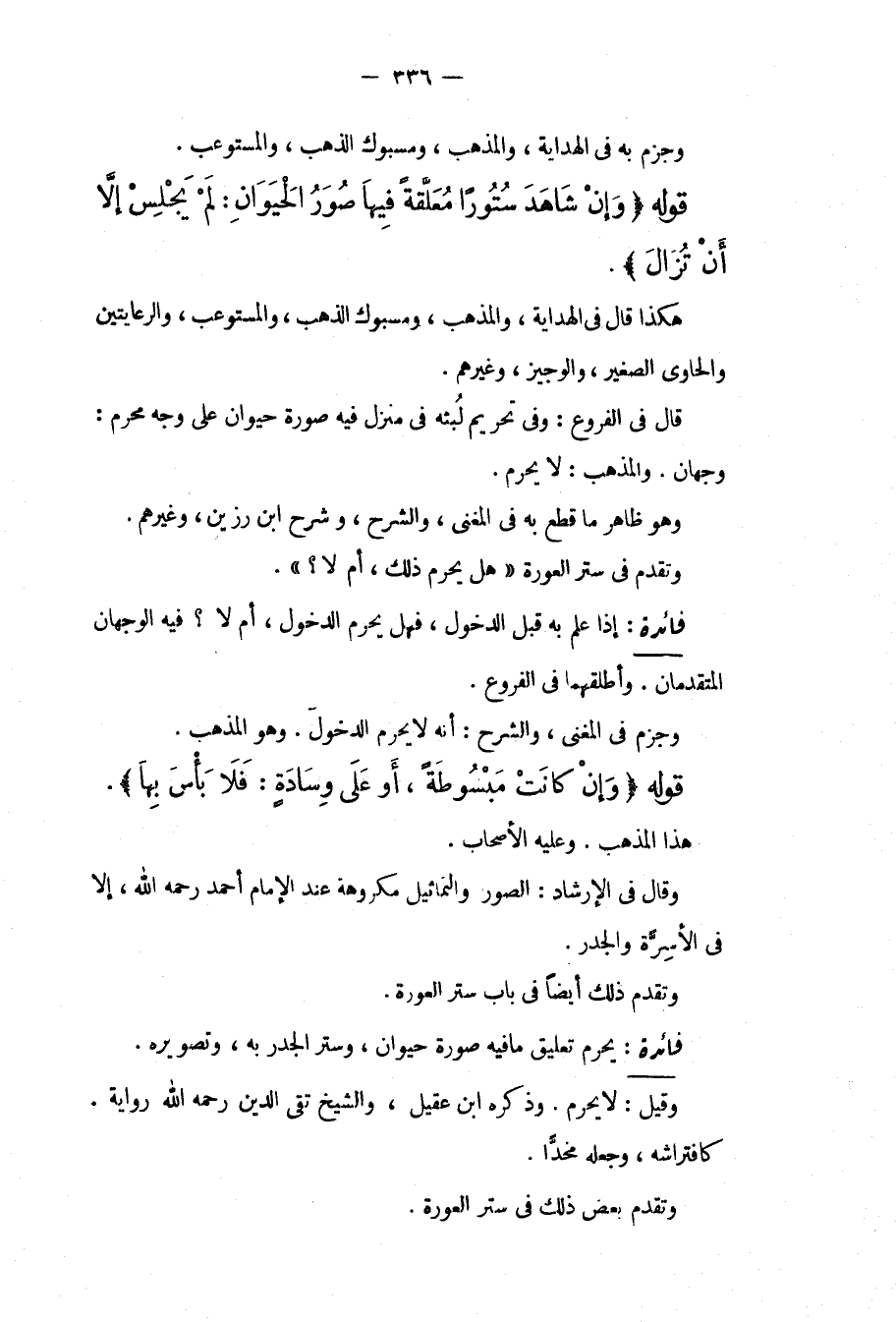 وَجَزَمَ بِهِ فِي الْهِدَايَةِ، وَالْمُذْهَبِ، وَمَسْبُوكِ الذَّهَبِ، وَالْمُسْتَوْعِبِ. قَوْلُهُ (وَإِنْ شَاهَدَ سُتُورًا مُعَلَّقَةً فِيهَا صُوَرُ الْحَيَوَانِ: لَمْ يَجْلِسْ إلَّا أَنْ تُزَالَ) . هَكَذَا قَالَ فِي الْهِدَايَةِ، وَالْمُذْهَبِ، وَمَسْبُوكِ الذَّهَبِ، وَالْمُسْتَوْعِبِ، وَالرِّعَايَتَيْنِ وَالْحَاوِي الصَّغِيرِ، وَالْوَجِيزِ، وَغَيْرِهِمْ. قَالَ فِي الْفُرُوعِ: وَفِي تَحْرِيمِ لُبْثِهِ فِي مَنْزِلٍ فِيهِ صُورَةُ حَيَوَانٍ عَلَى وَجْهٍ مُحَرَّمٍ: وَجْهَانِ. وَالْمَذْهَبُ: لَا يَحْرُمُ. وَهُوَ ظَاهِرُ مَا قَطَعَ بِهِ فِي الْمُغْنِي، وَالشَّرْحِ، وَشَرْحِ ابْنِ رَزِينٍ، وَغَيْرِهِمْ. وَتَقَدَّمَ فِي سِتْرِ الْعَوْرَةِ " هَلْ يَحْرُمُ ذَلِكَ، أَمْ لَا؟ ".